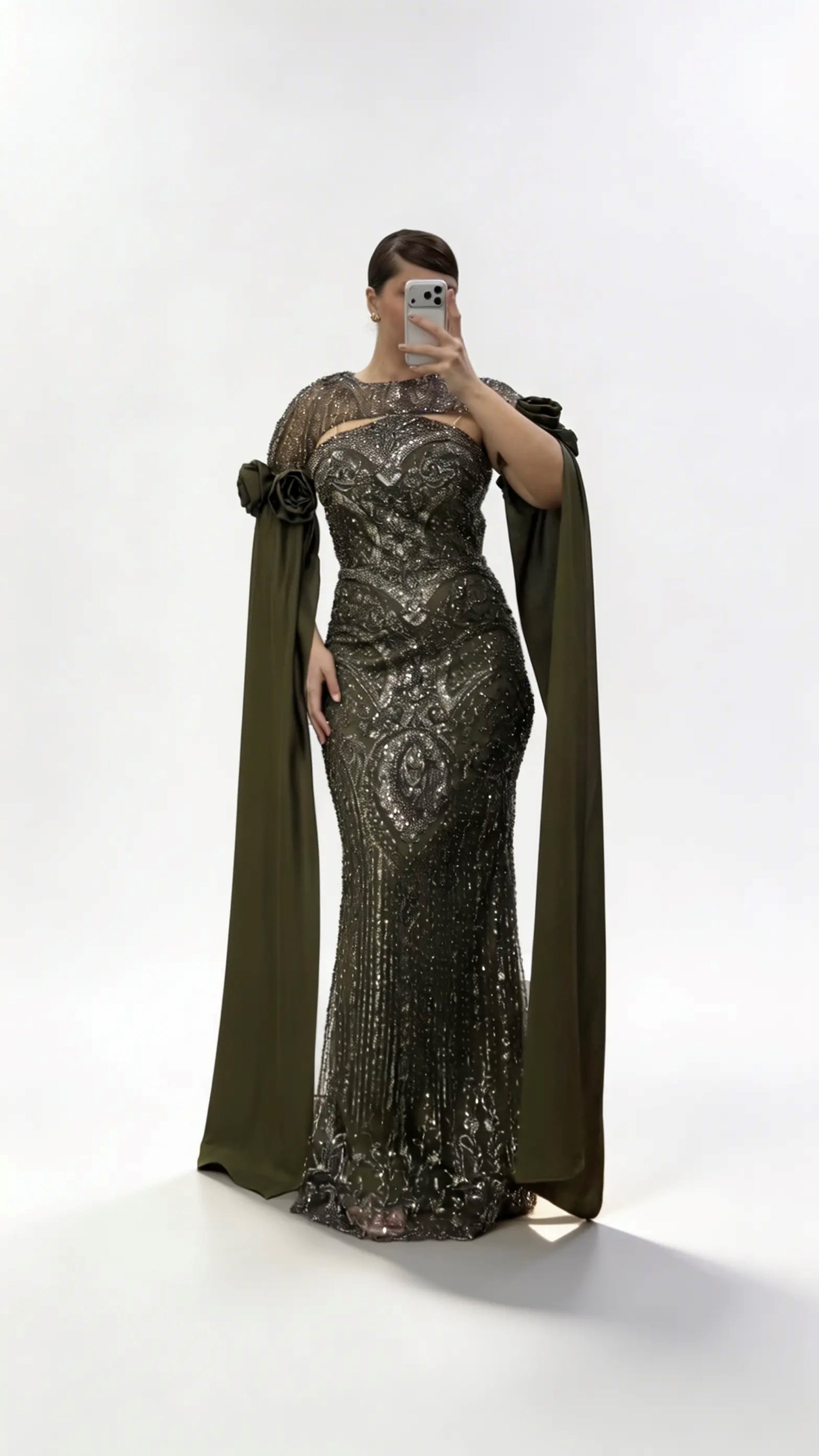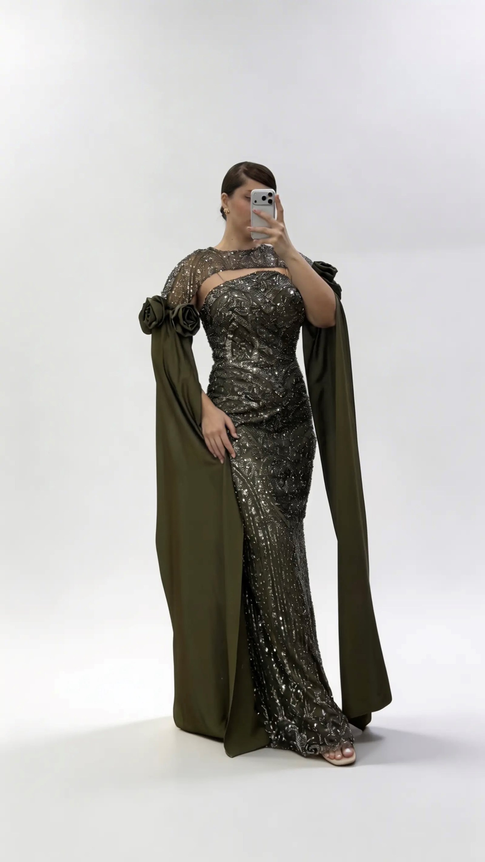 • Haki Çiçek Detaylı Uzun Saten Pelerin Kollu Büyük Beden Abiye Elbise