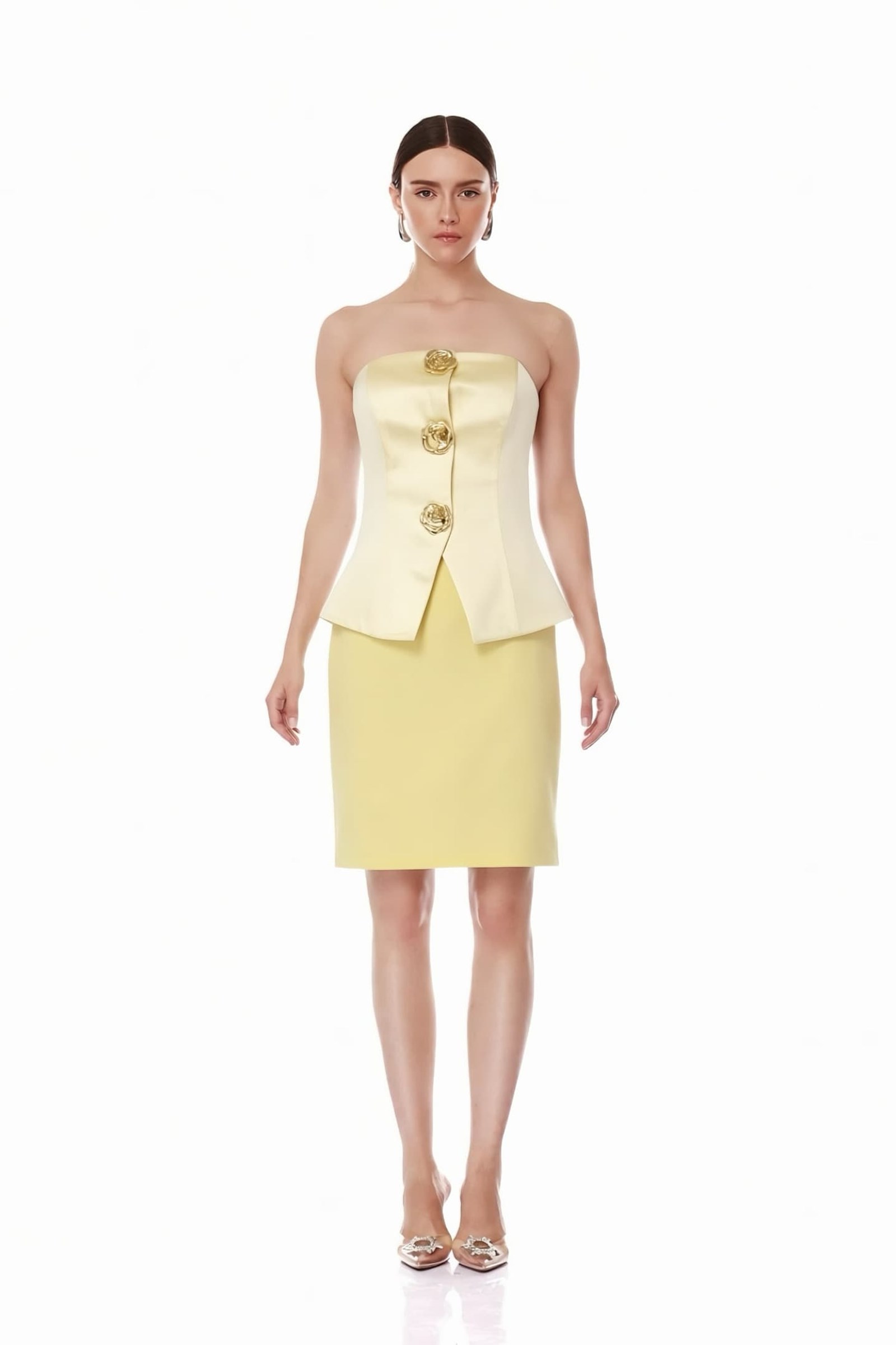 Buttergelbes Mini Abendkleid aus Satin mit Rosenapplikationen