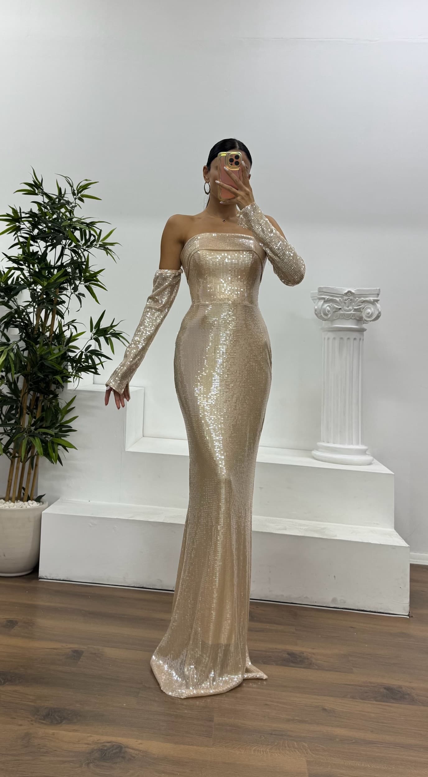 Ürün 36-44 bedene kadar uyumlu, göğüs pedli, astarlı, arka kapama fermuar, eldivenli abiye olarak tasarlanmıştır.