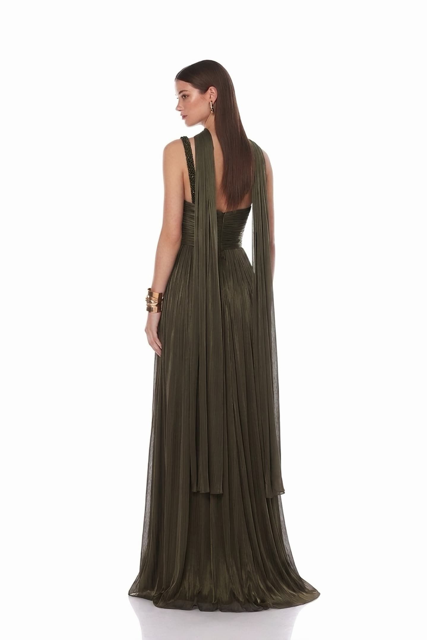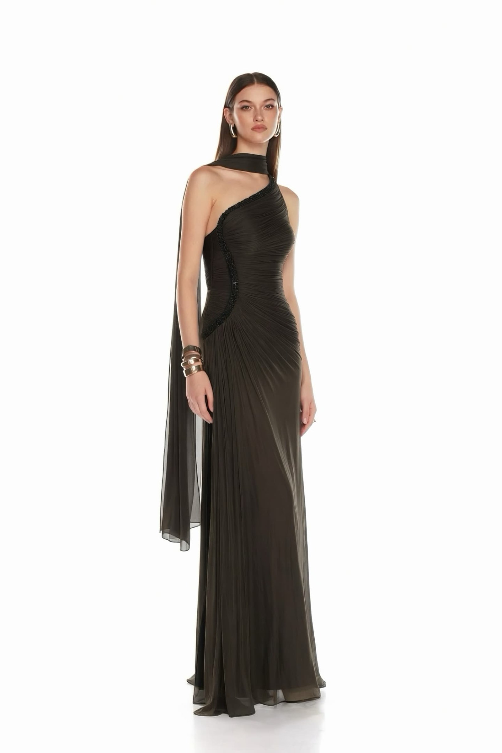 • Koyu Kahve Belden Taş Detaylı Abiye Elbise