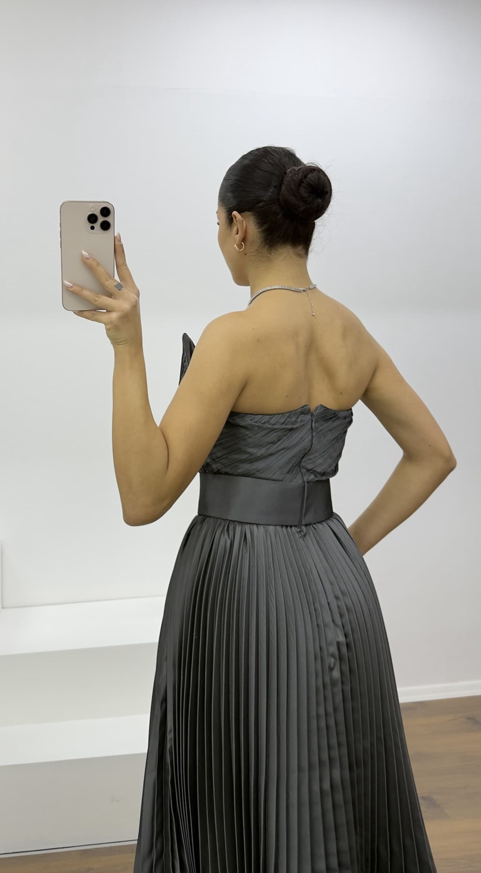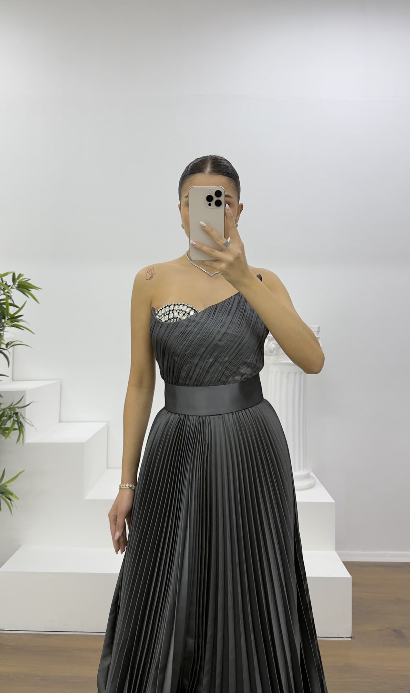 • Antrasit Göğüs Drapeli Kuşak Detaylı Pliseli Abiye Elbise