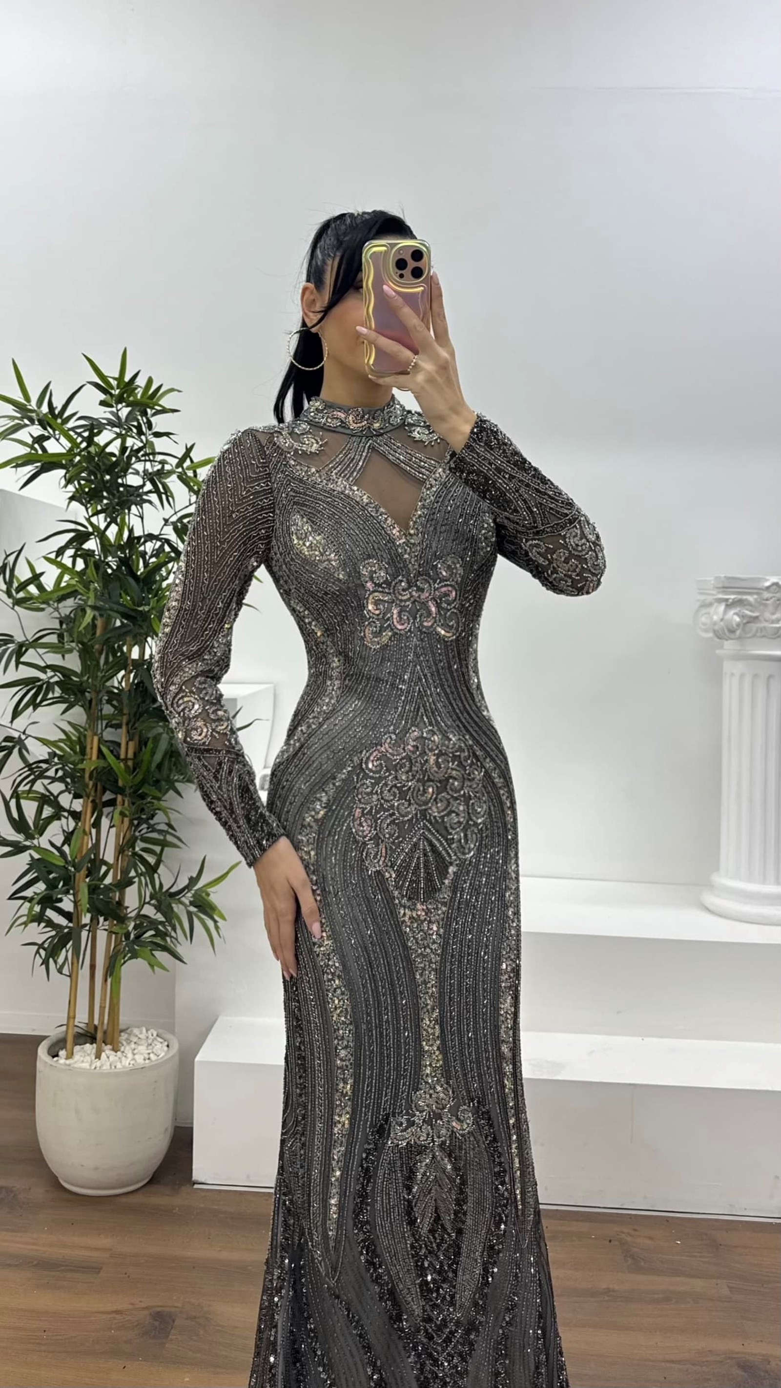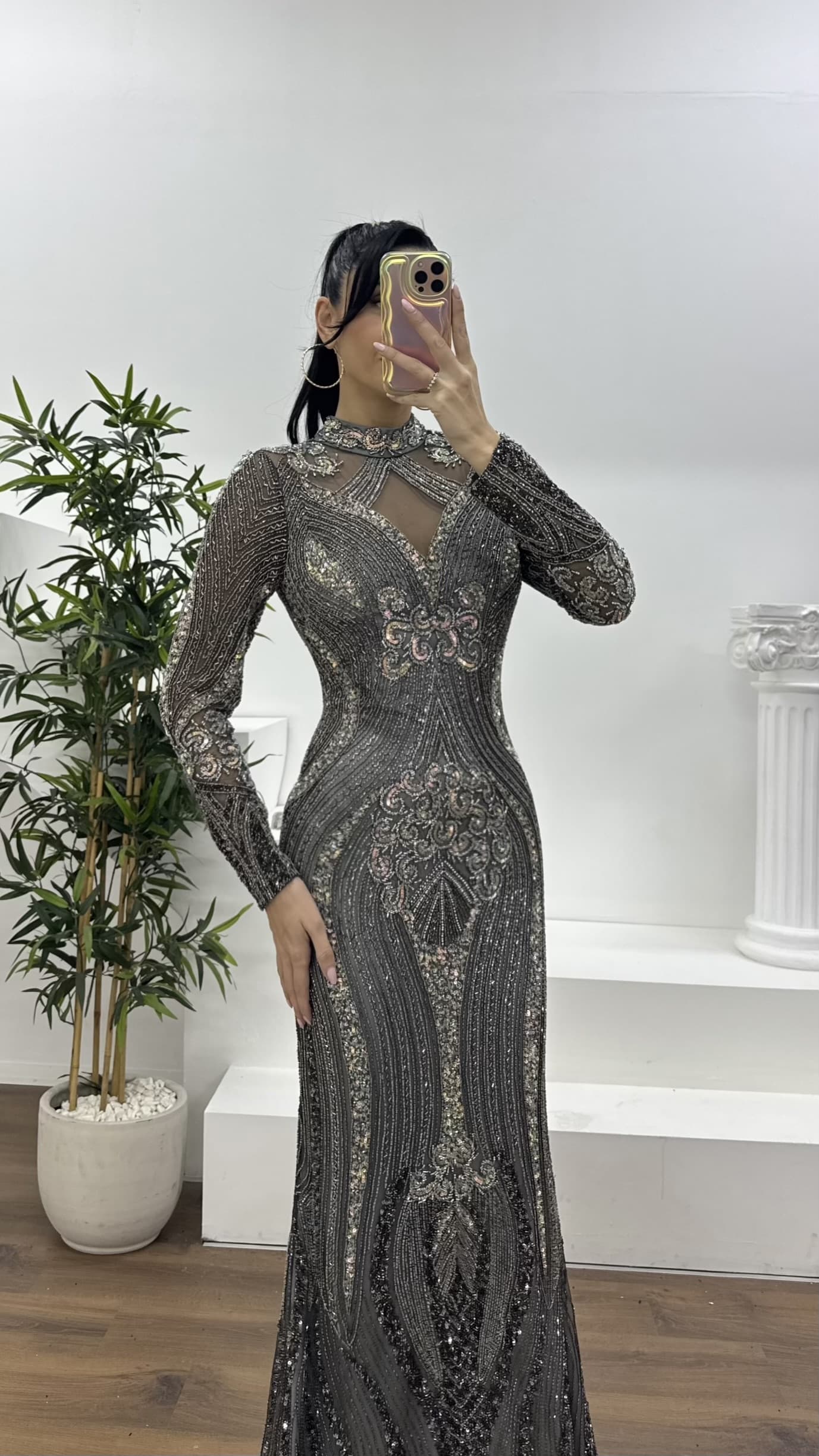 Ürün 36-40 bedene kadar uyumludur. göğüs pedli, astarlı, arka kapama fermuar, uzun kollu, işlemeli abiye olarak tasarlanmıştır.