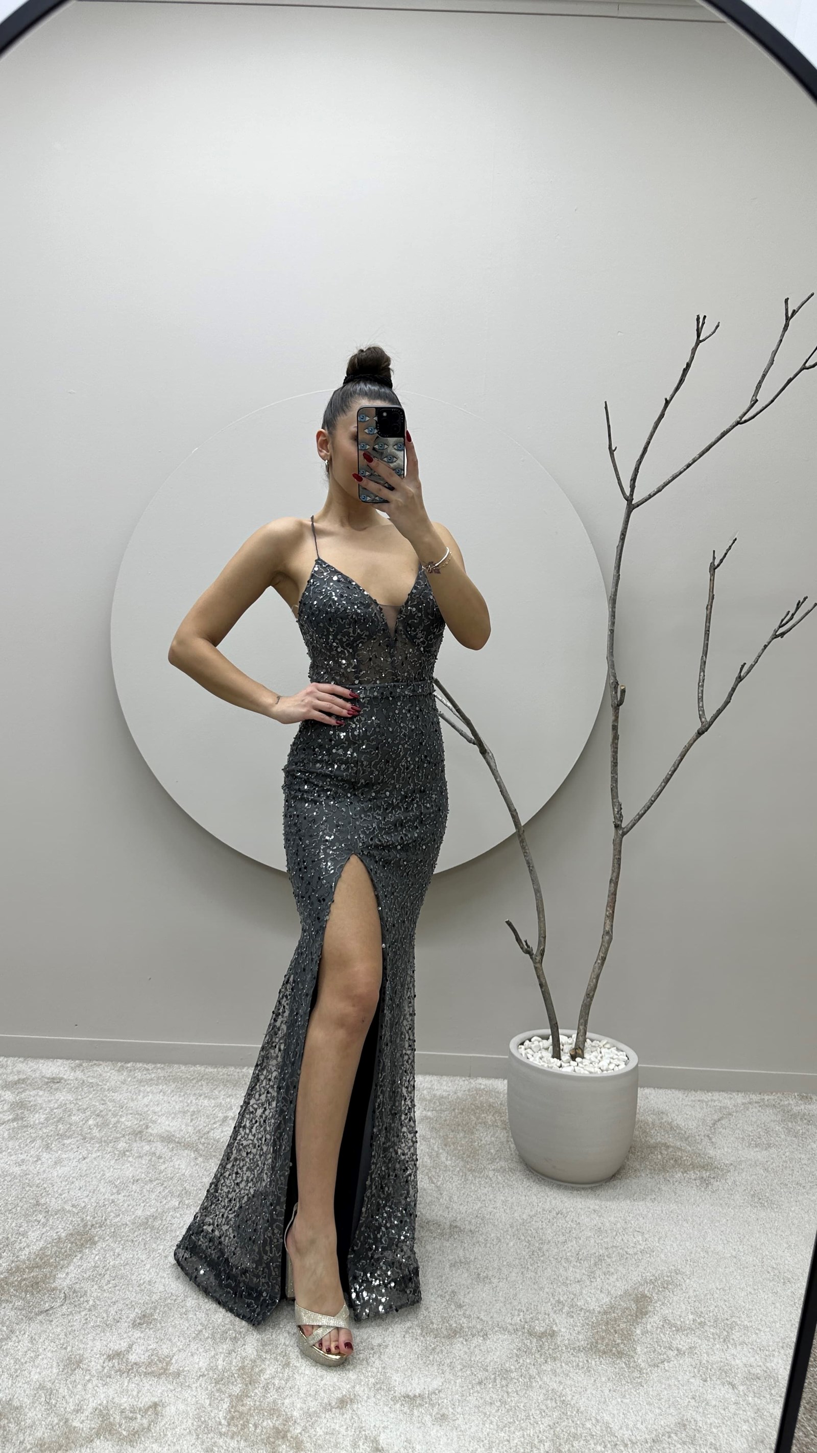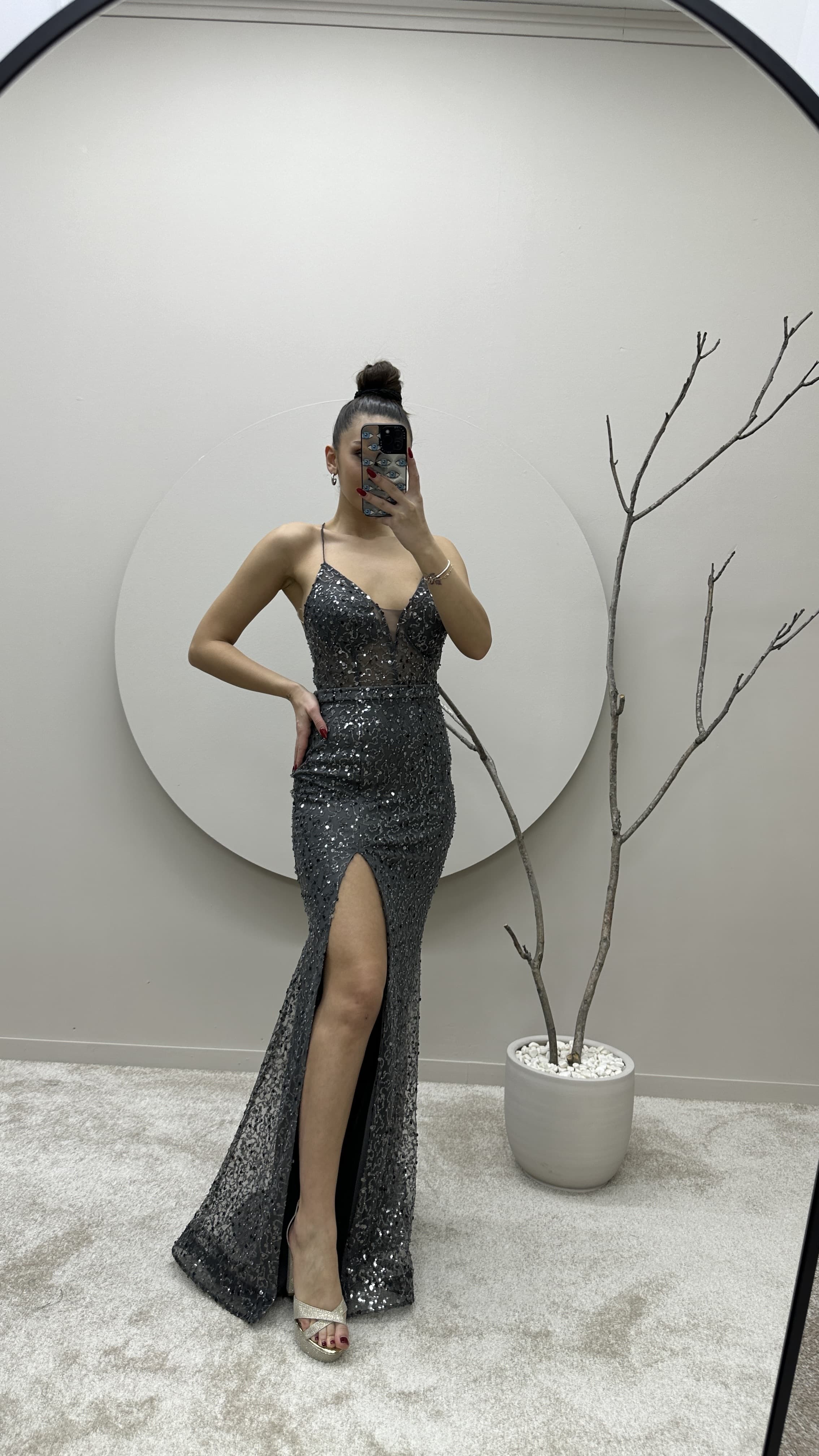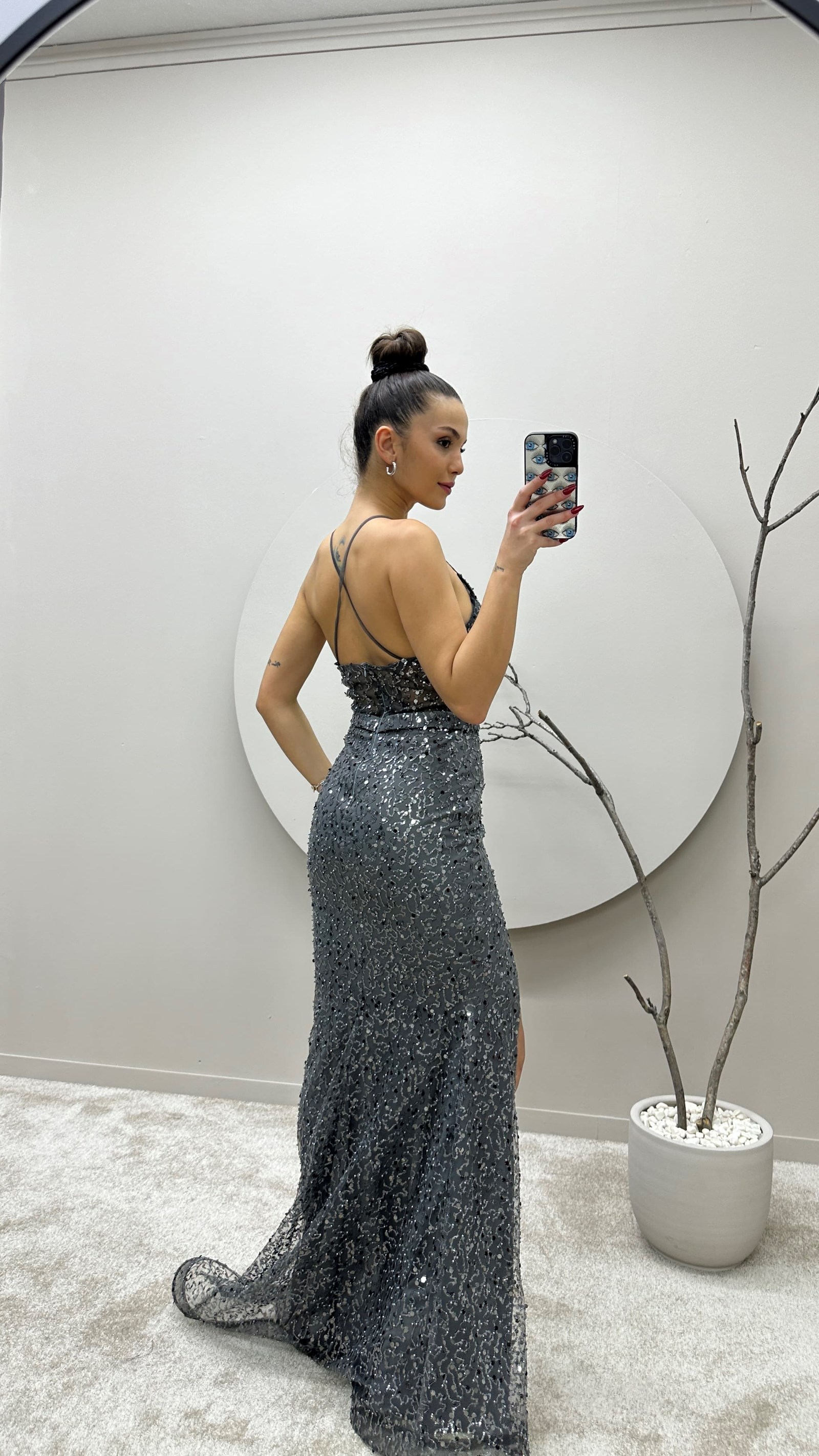 Antrasit İp Askılı Yırtmaçlı Tasarım Pul Detay Abiye Elbise