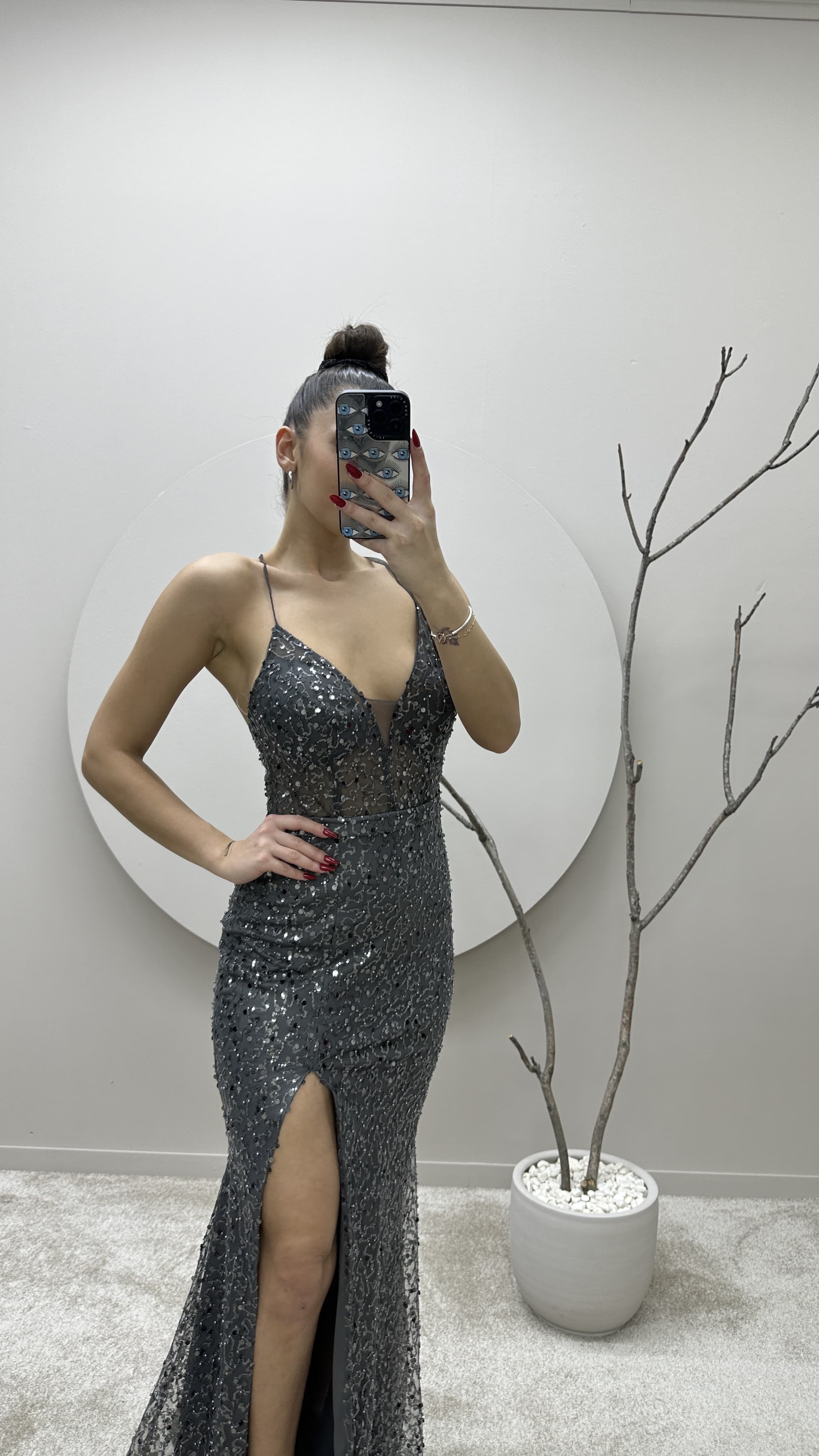 • Antrasit İp Askılı Yırtmaçlı Tasarım Pul Detay Abiye Elbise