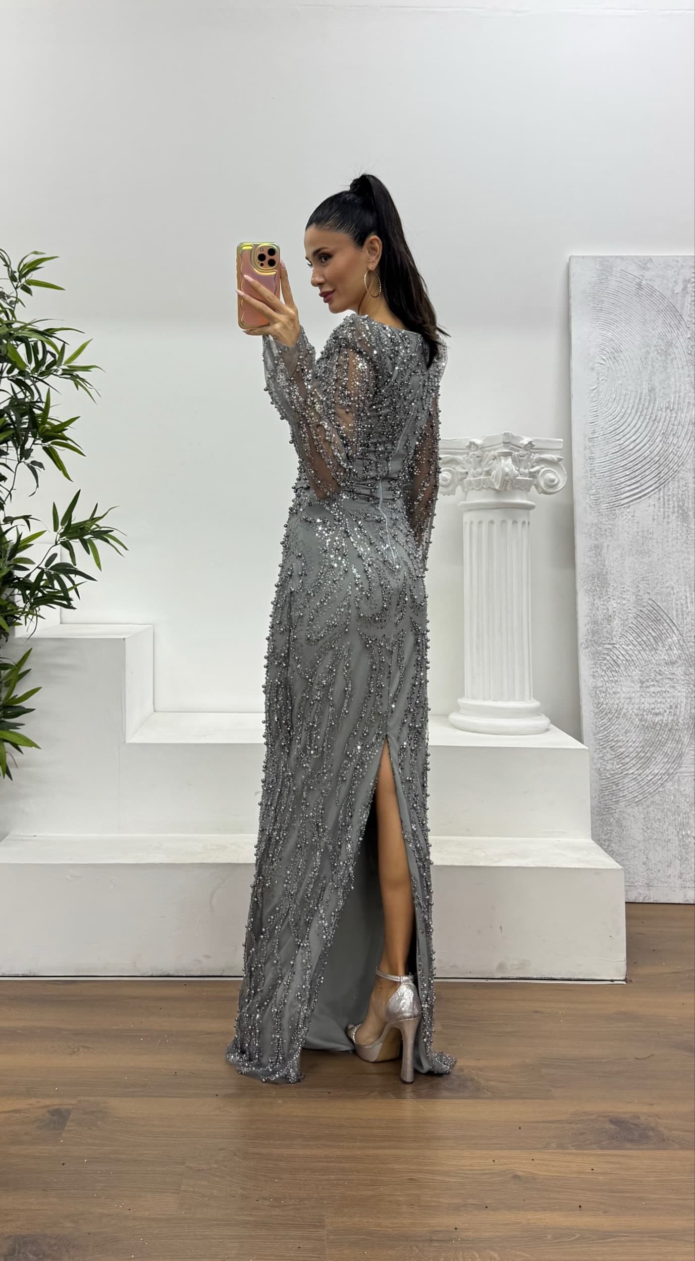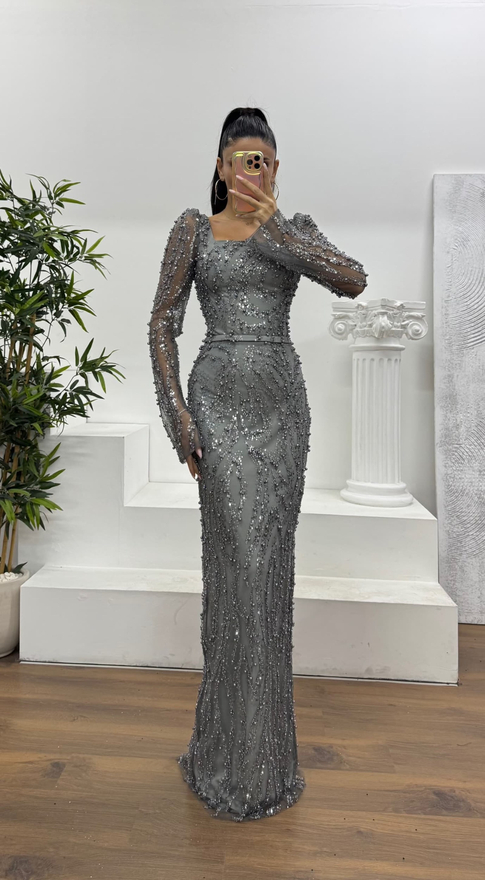 • Antrasit Kare Yaka İşlemeli Abiye Elbise