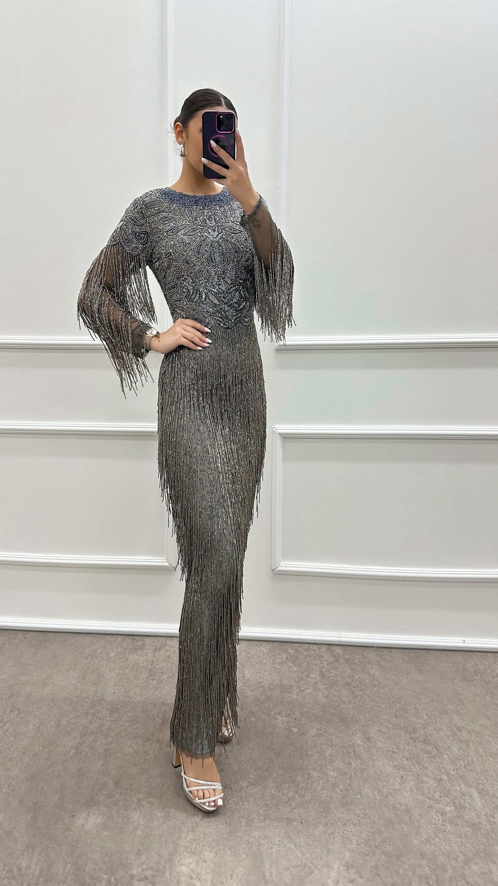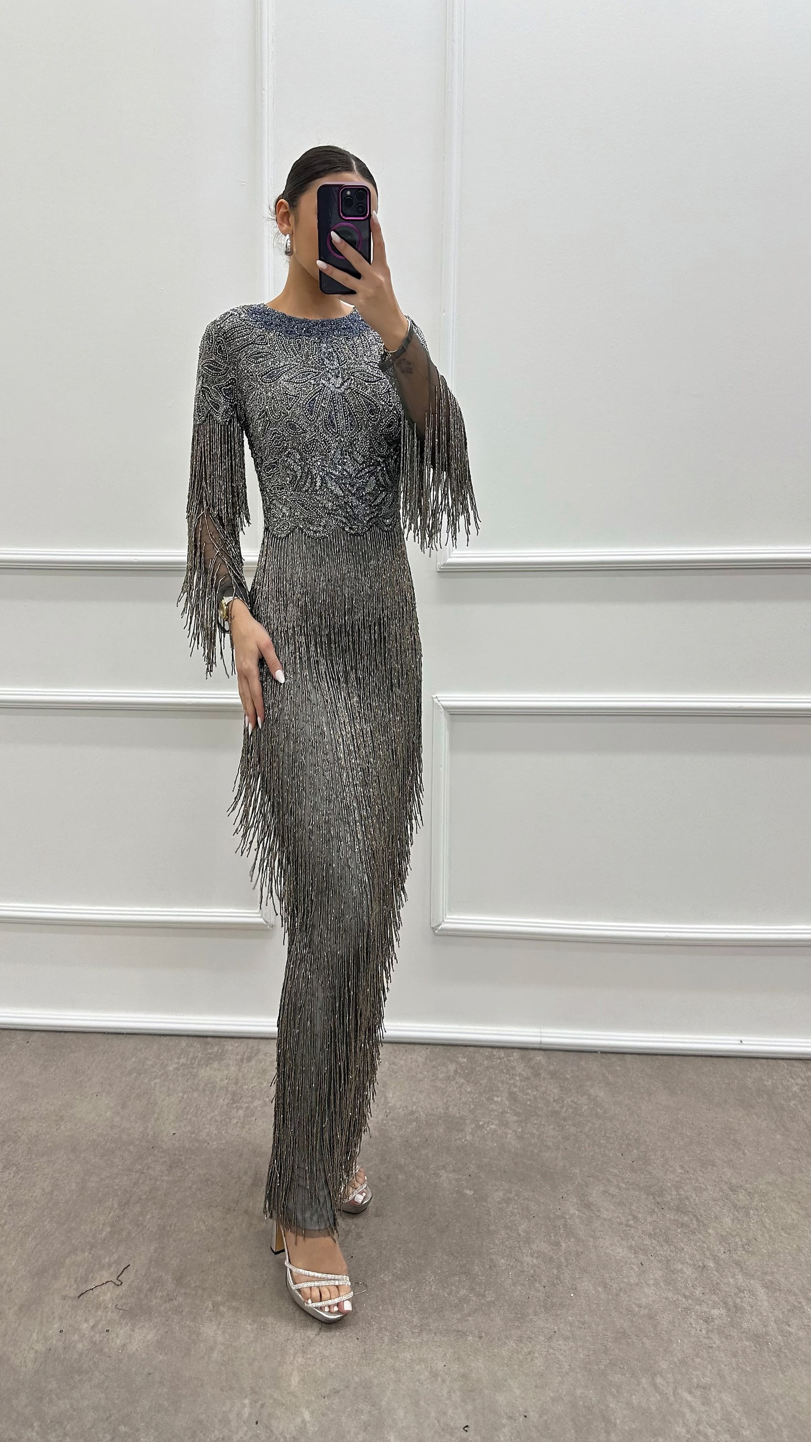 • Gri Kolları püskül Özel İşlemeli Tasarım Abiye Elbise