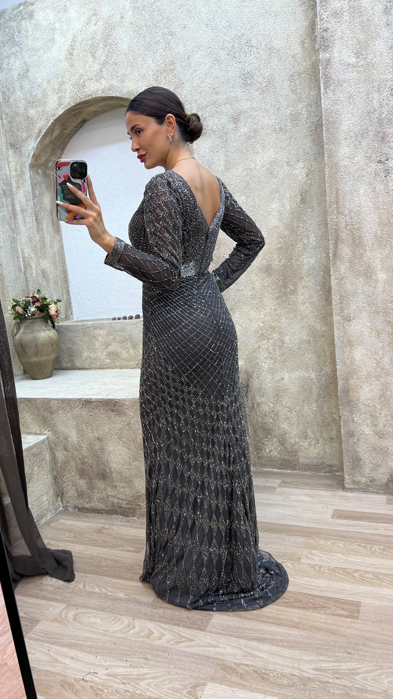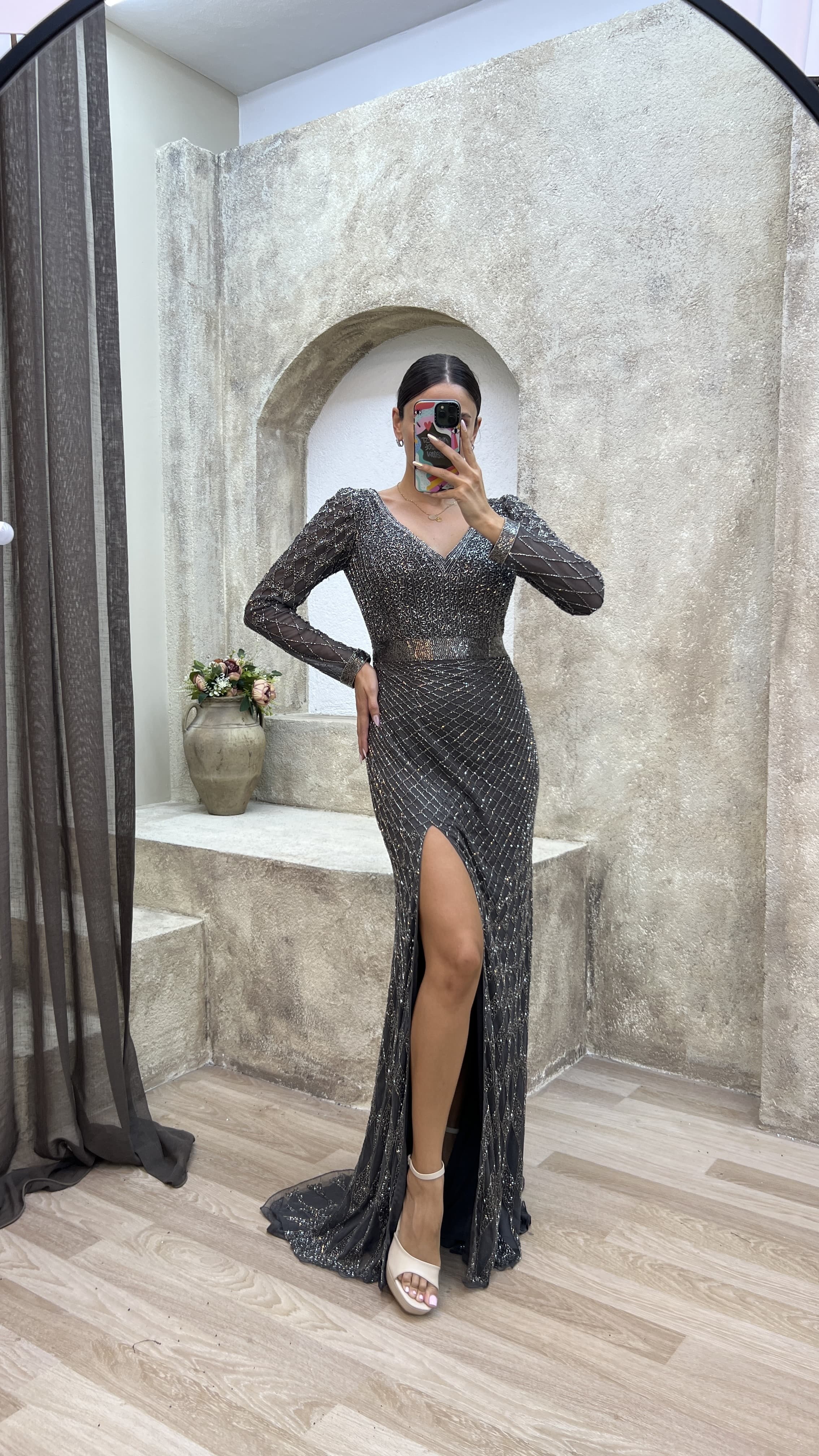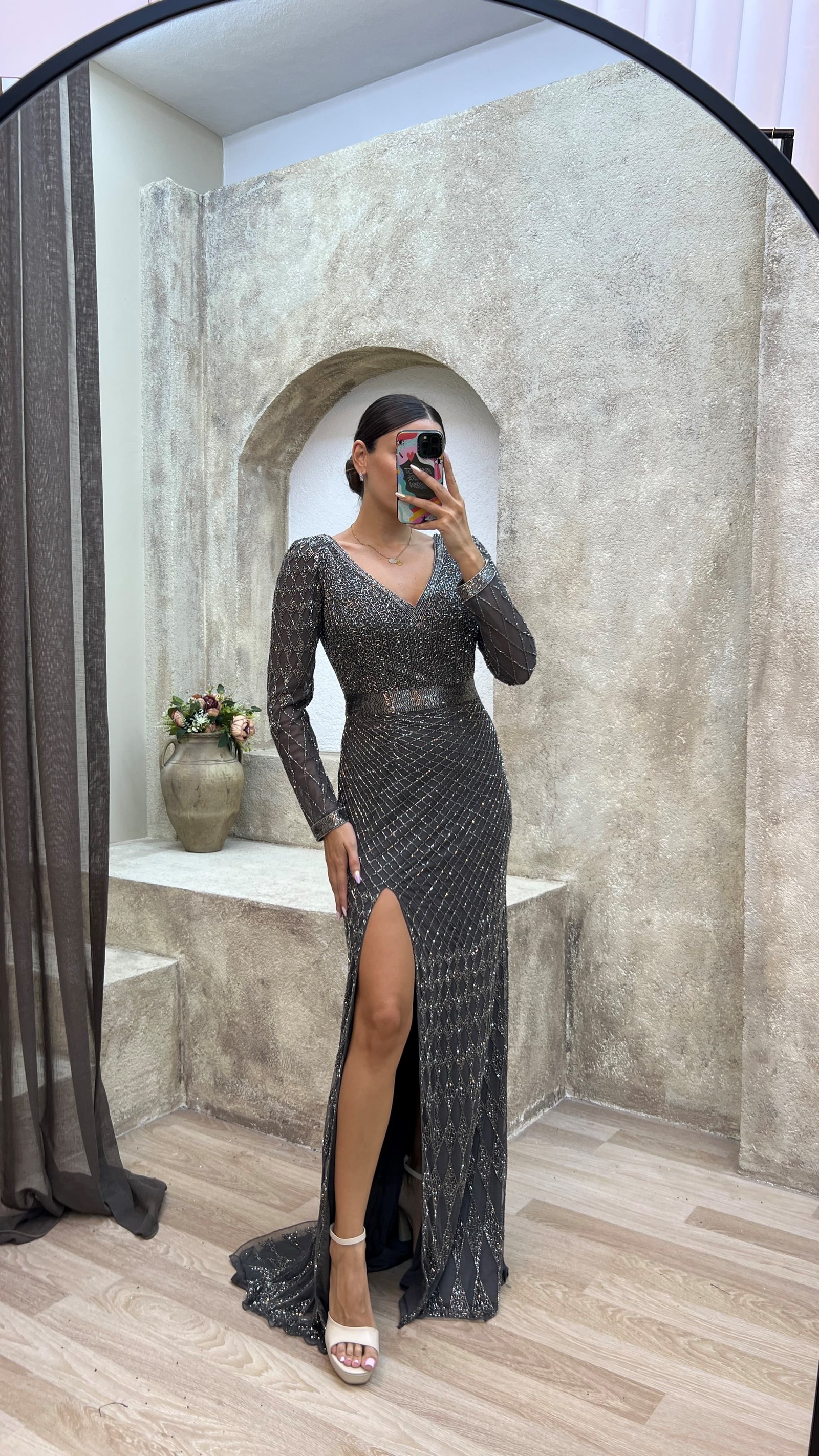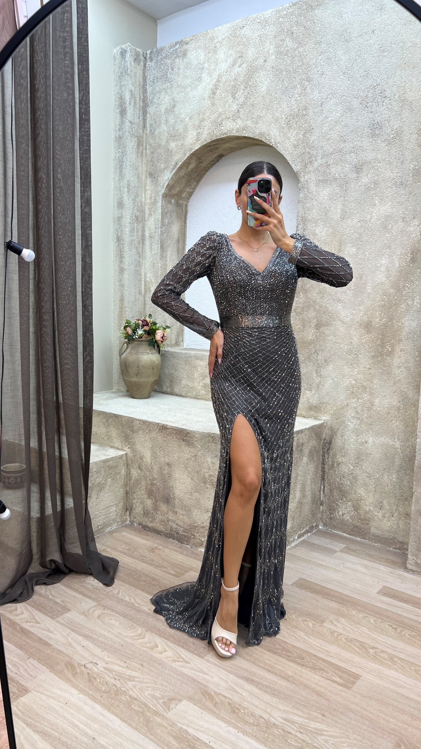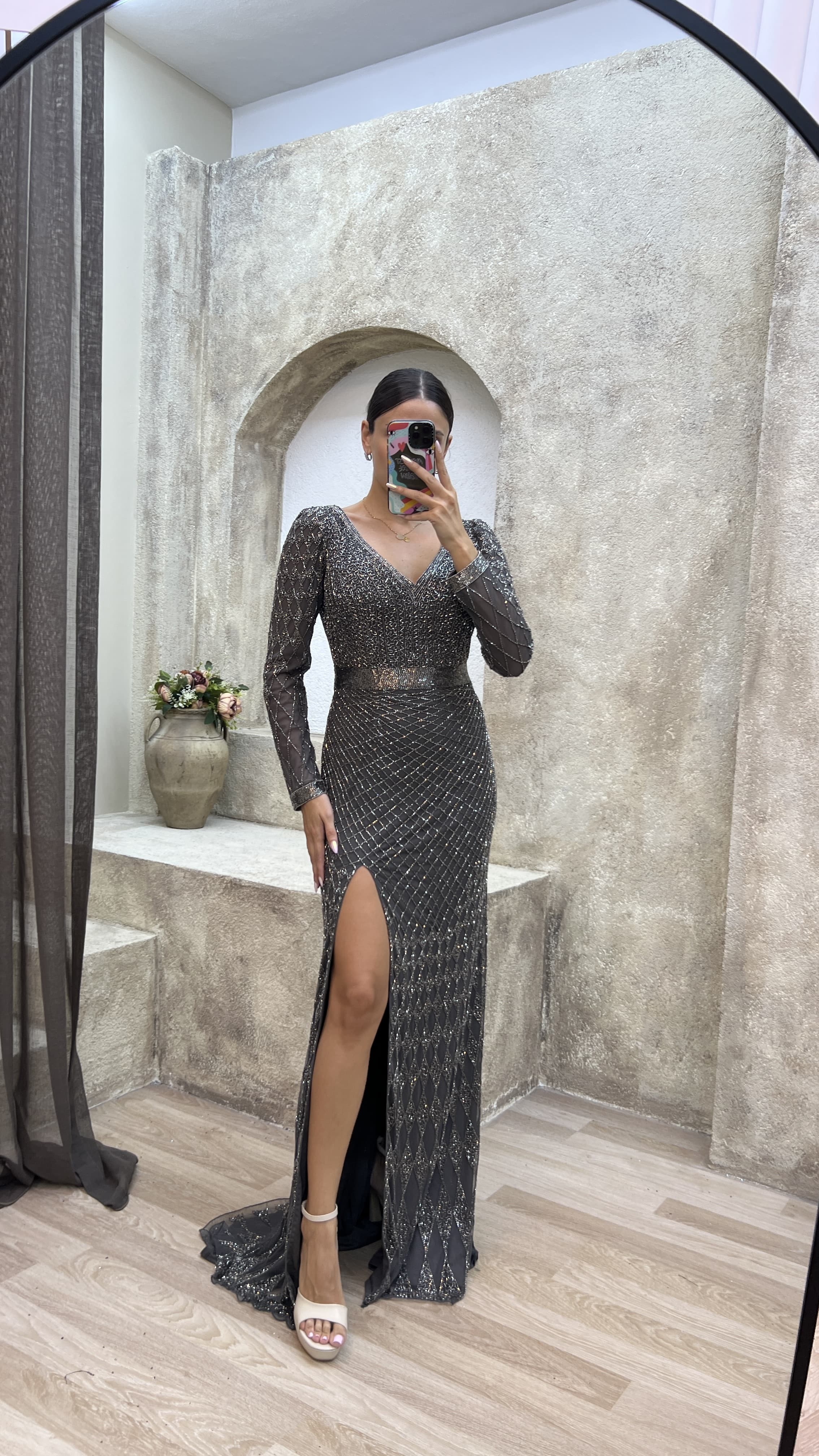 Antrasit V Yaka Bel Detay Yırtmaçlı Özel İşleme Tasarım Abiye Elbise