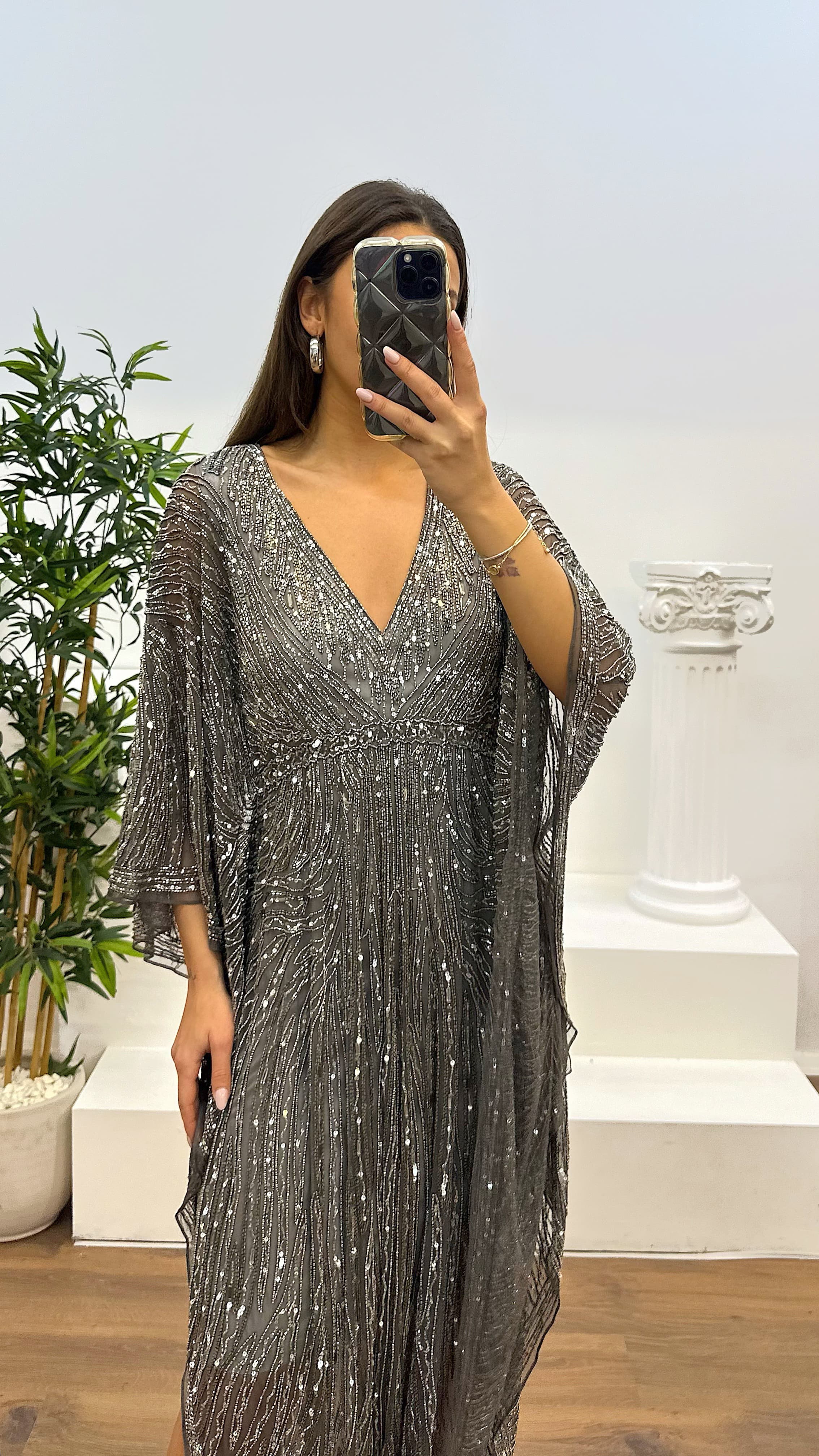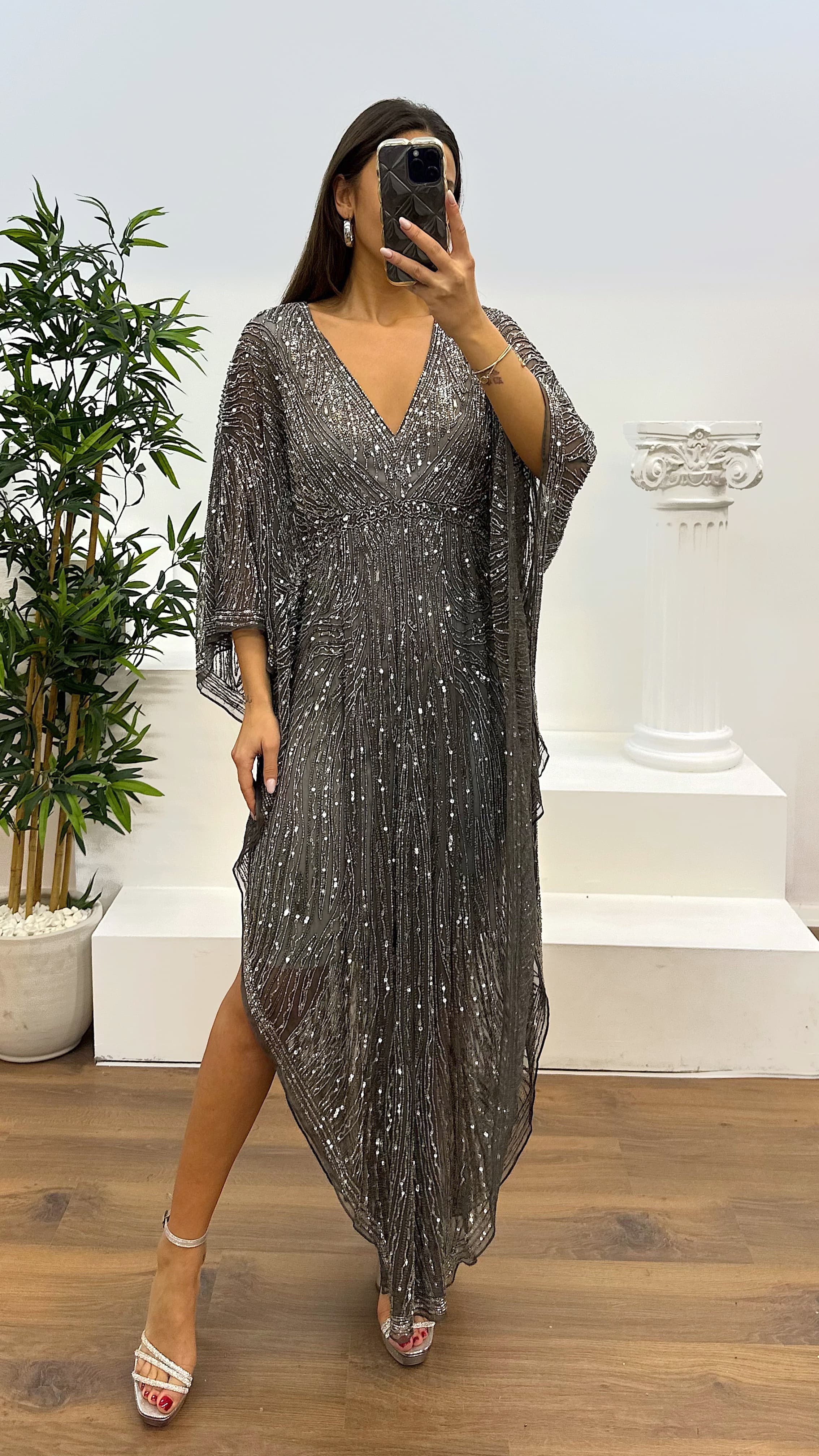 • Antrasit Yarasa Kol El İşlemesi Tasarım Abiye Elbise