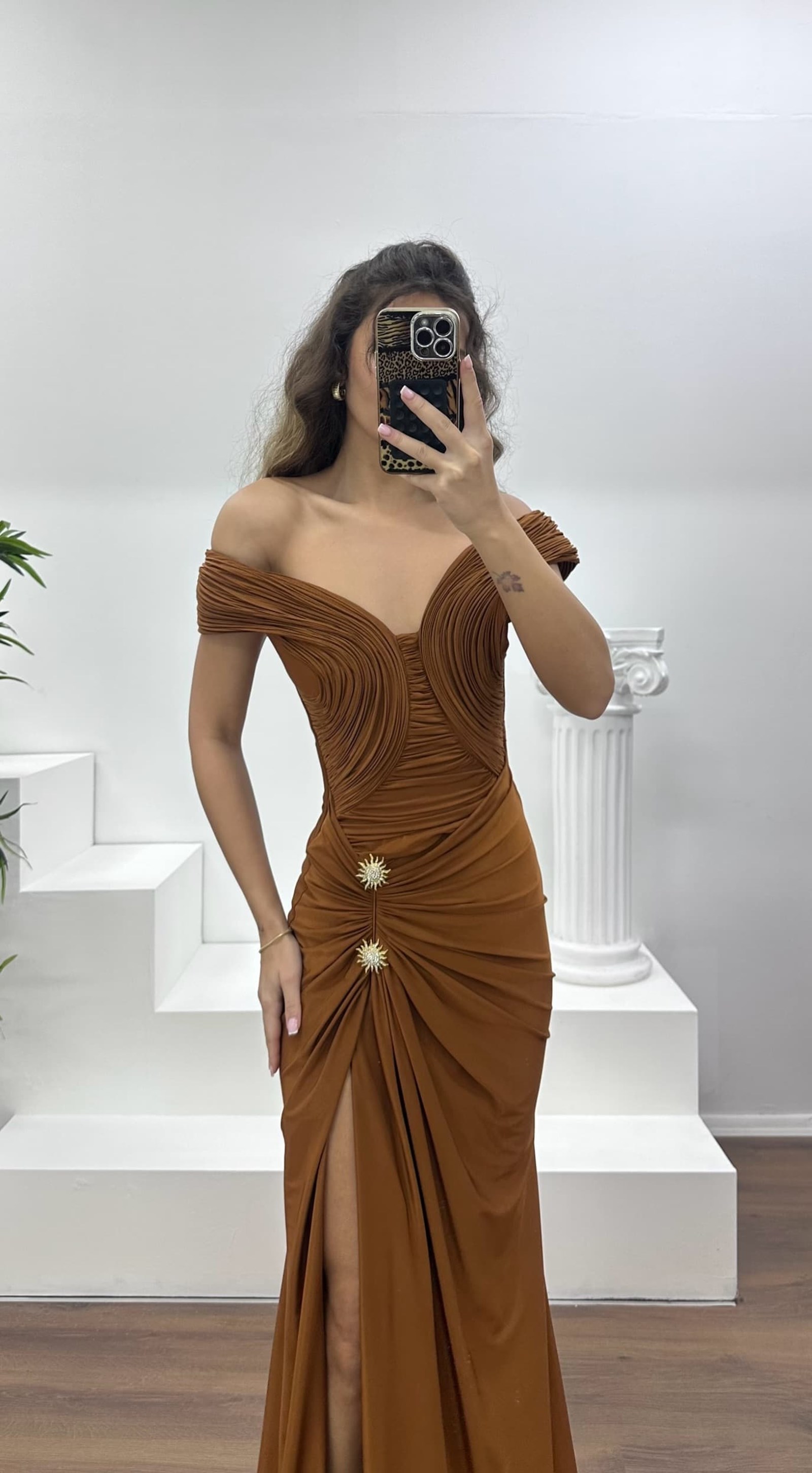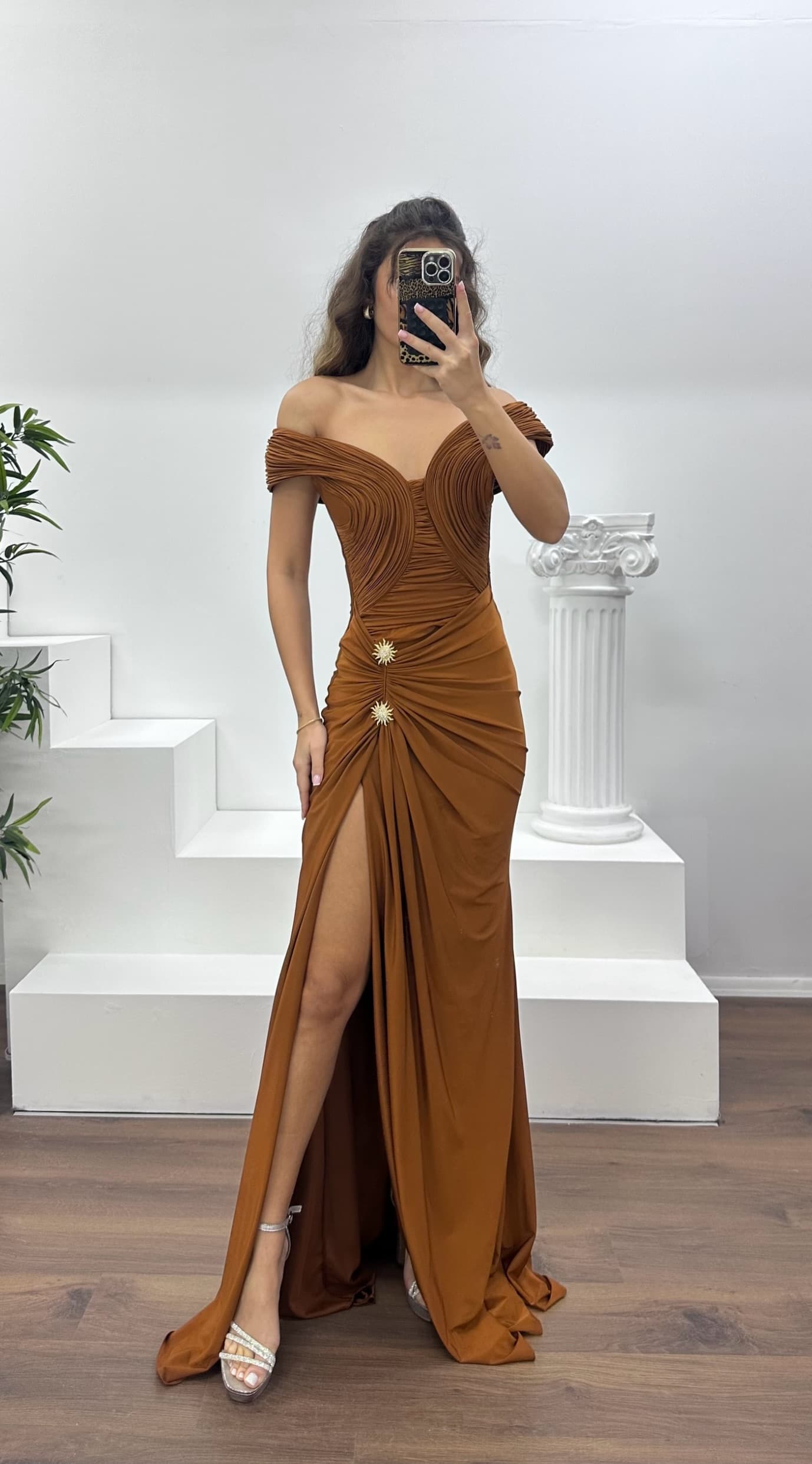 Kayık yaka broş detay abiye elbise