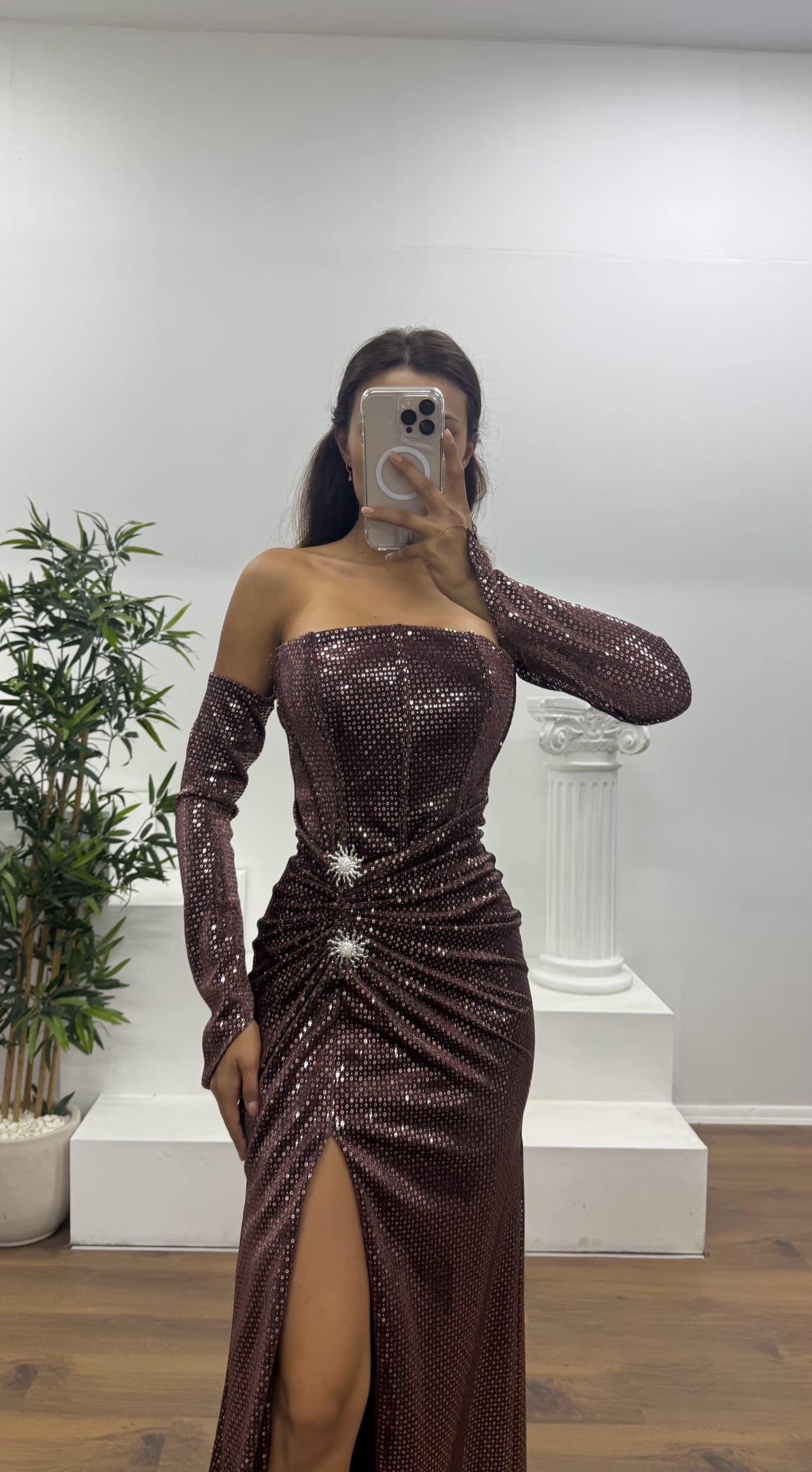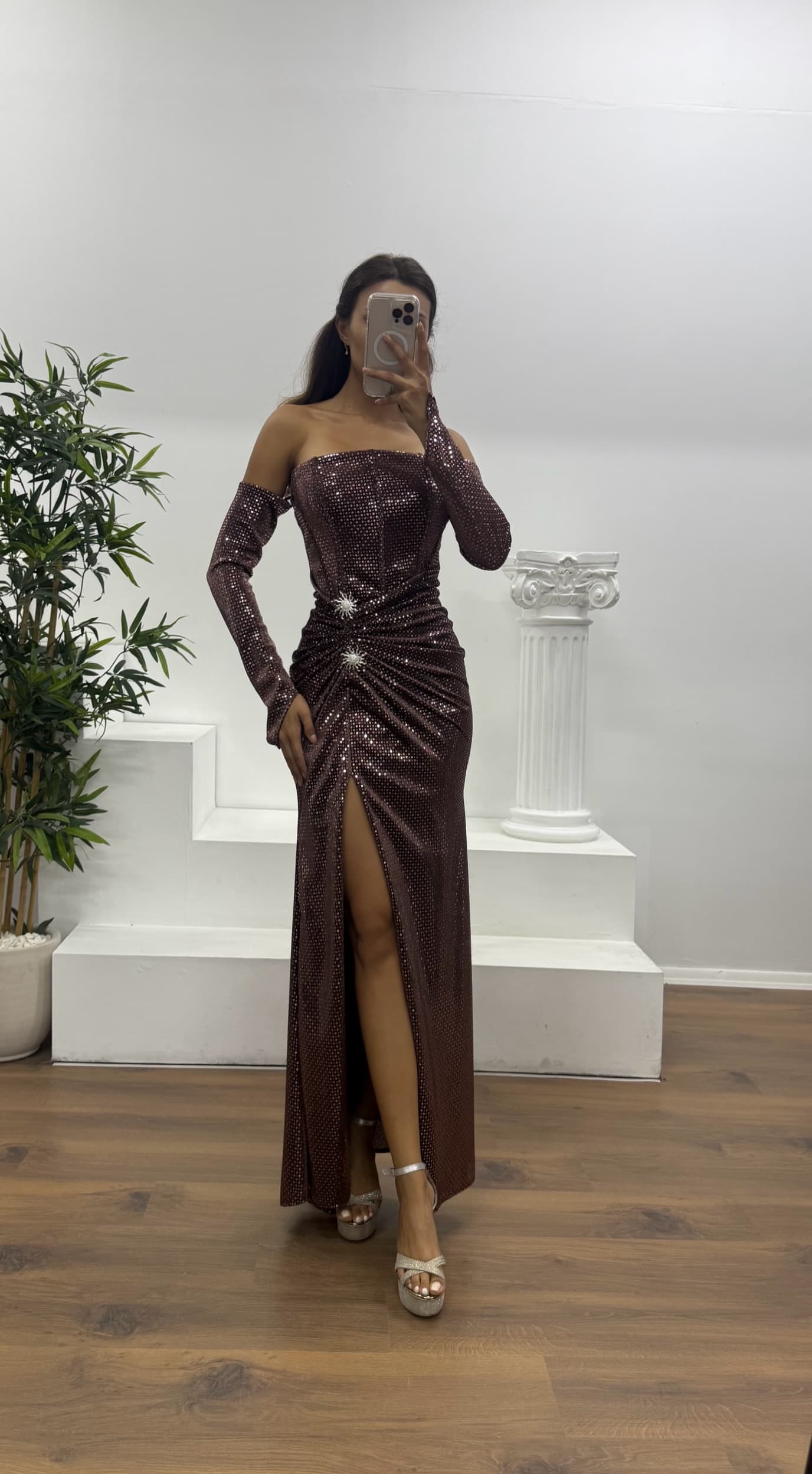 • Bakır Straplez Broş Detay Abiye Elbise