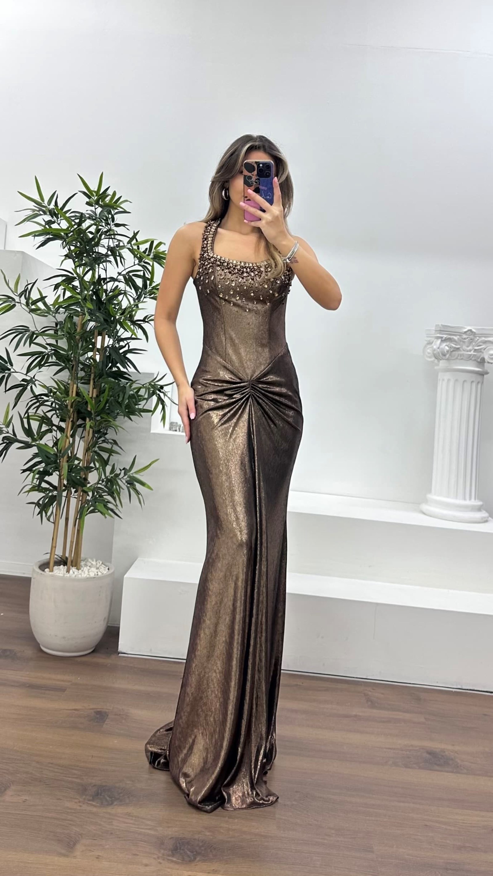 • Bakır Taş İşlemeli Drapeli Saten Abiye Elbise