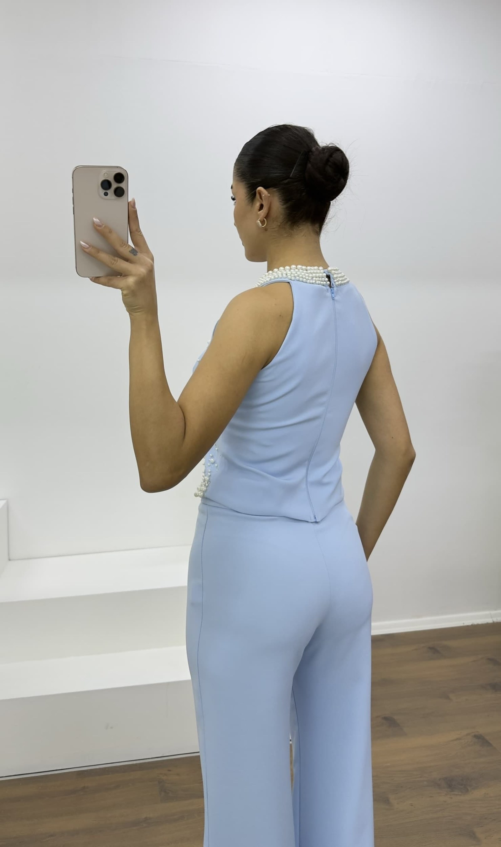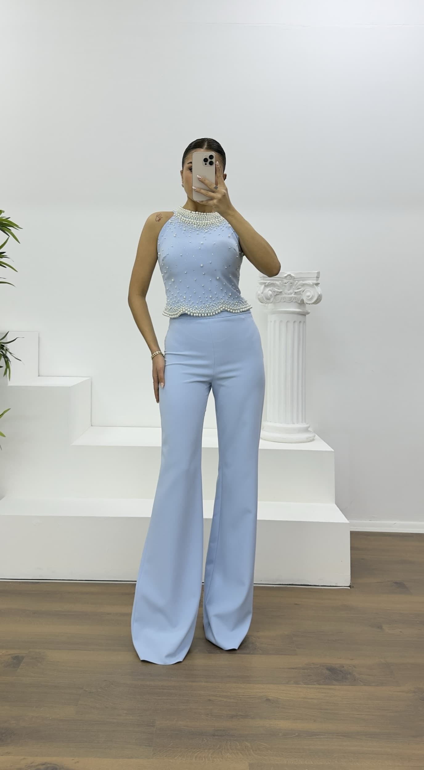 Ürün 36-42 bedene kadar uyumludur. göğüs pedli, astarlı, bluz halter yaka, düğmeli ve fermuarlı, pantolon yüksek bel , bol paça kesim, inci detaylı abiye olarak tasarlanmıştır.