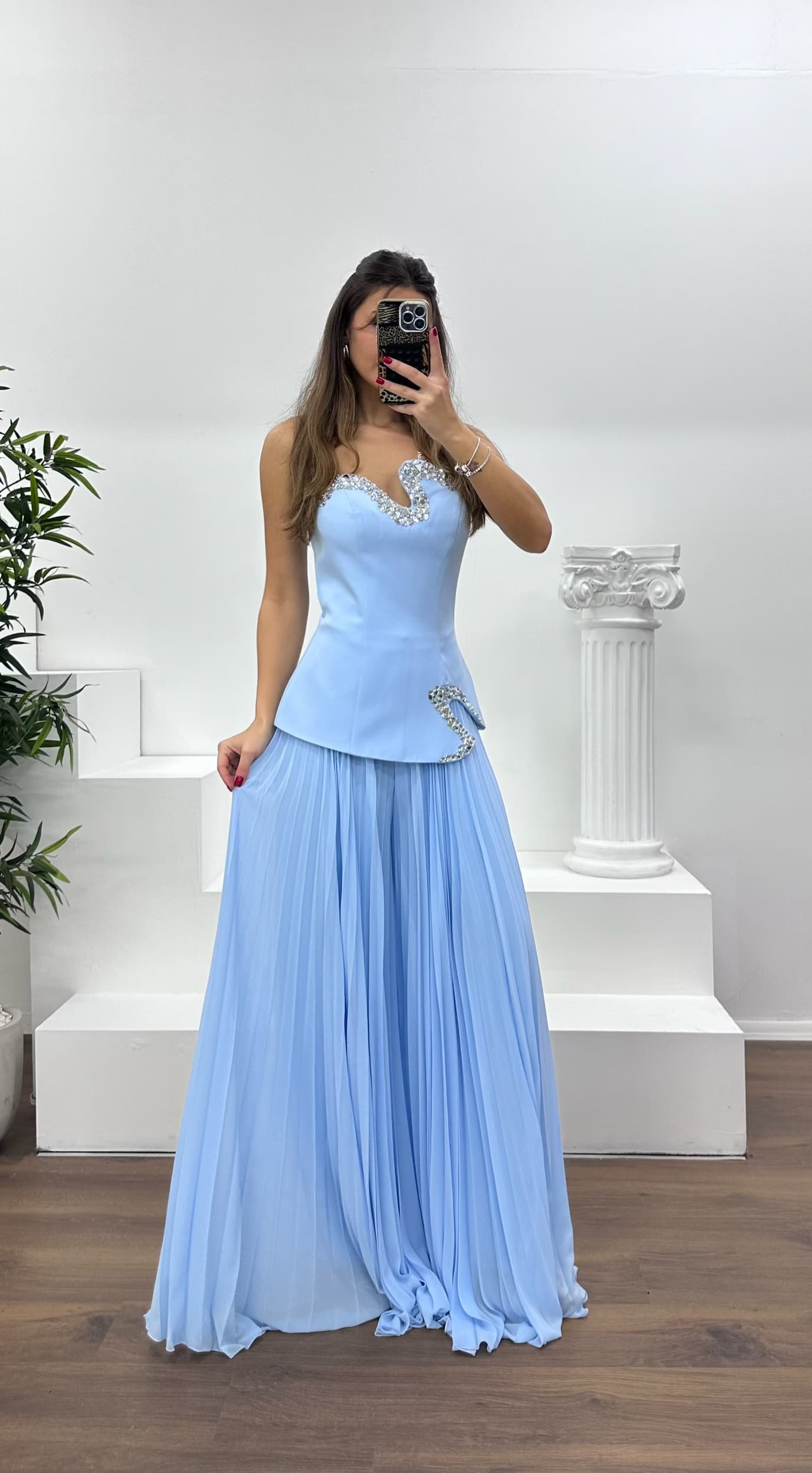 • Bebe Mavi Straplez  Asimetrik Desen Taşlı Abiye Tulum