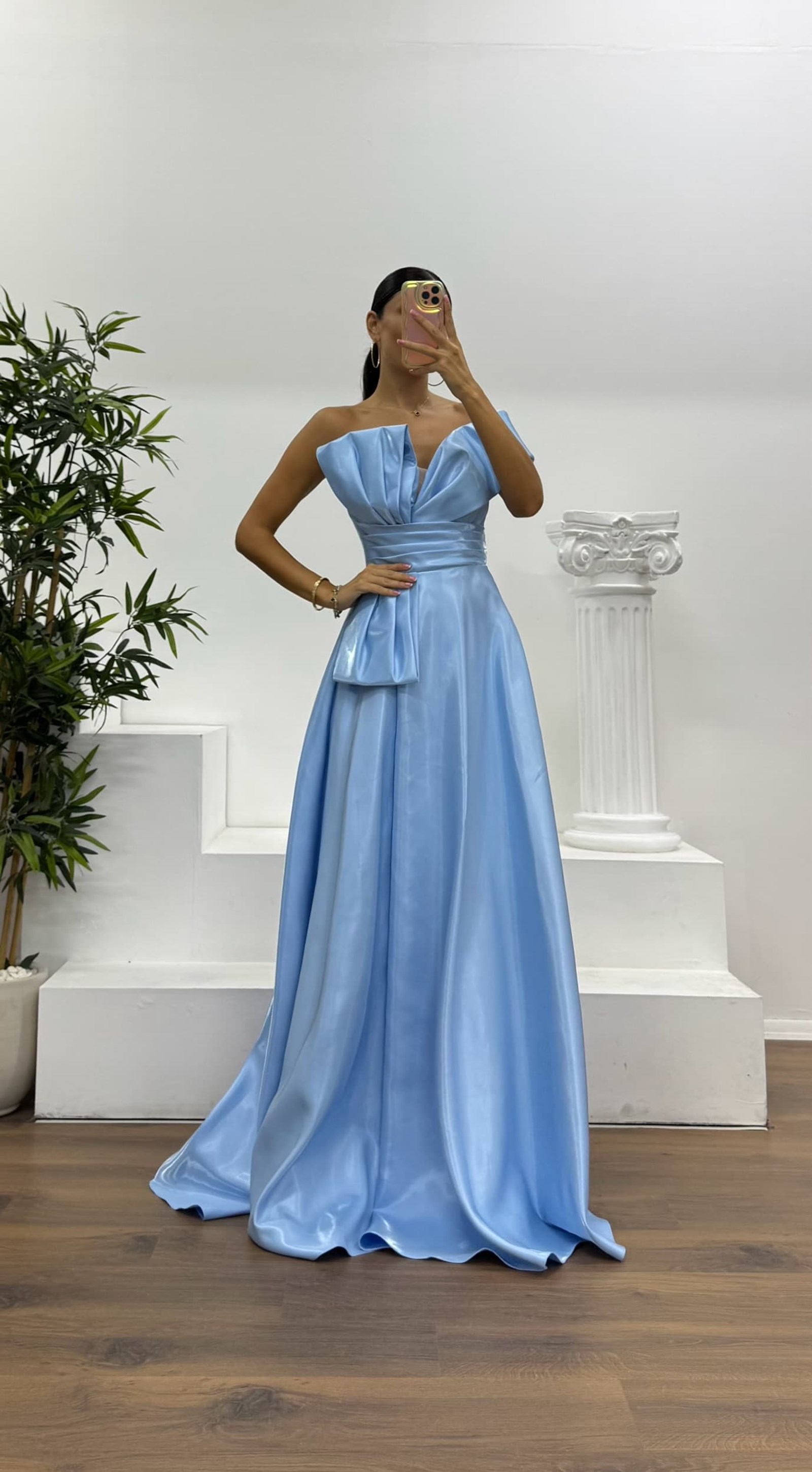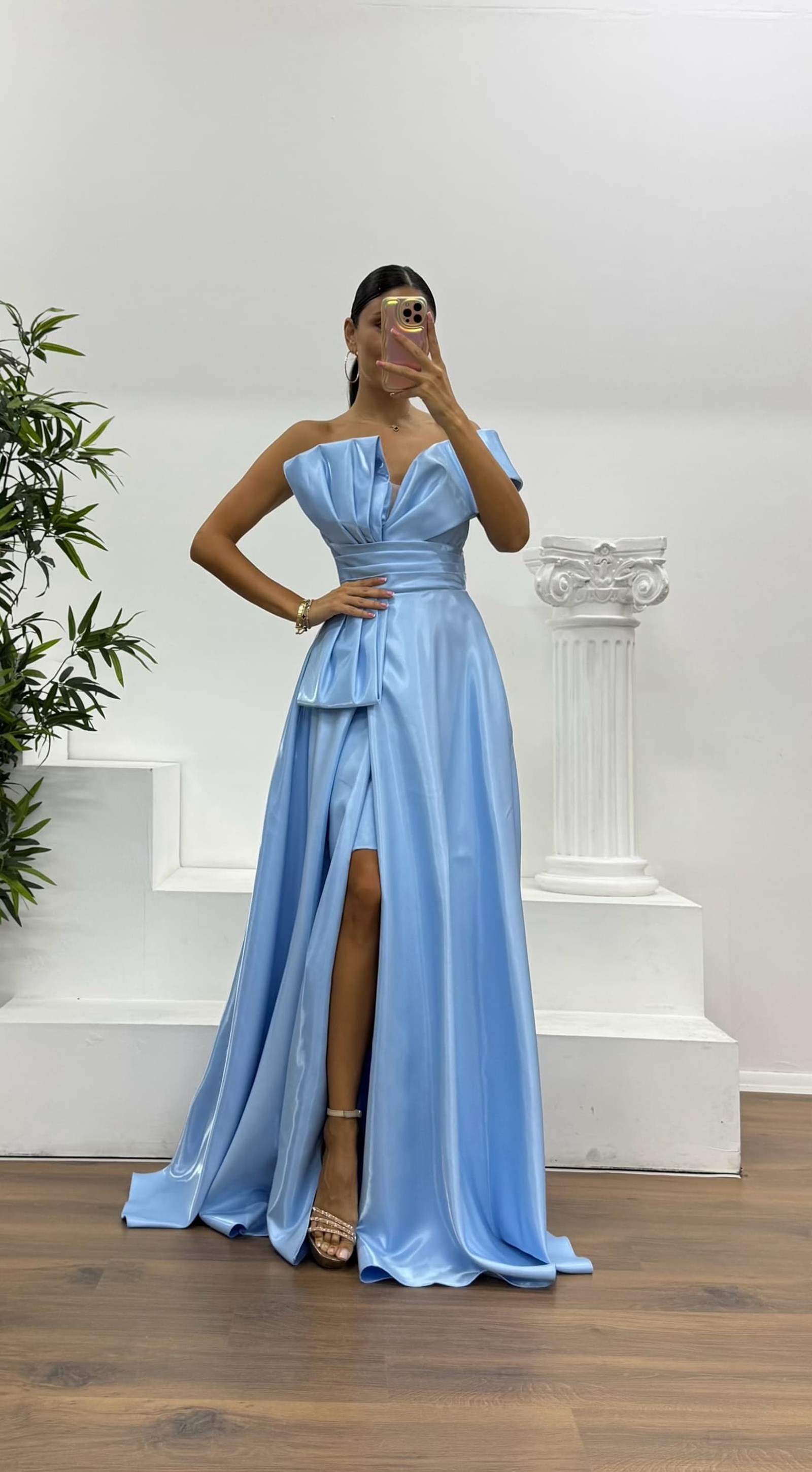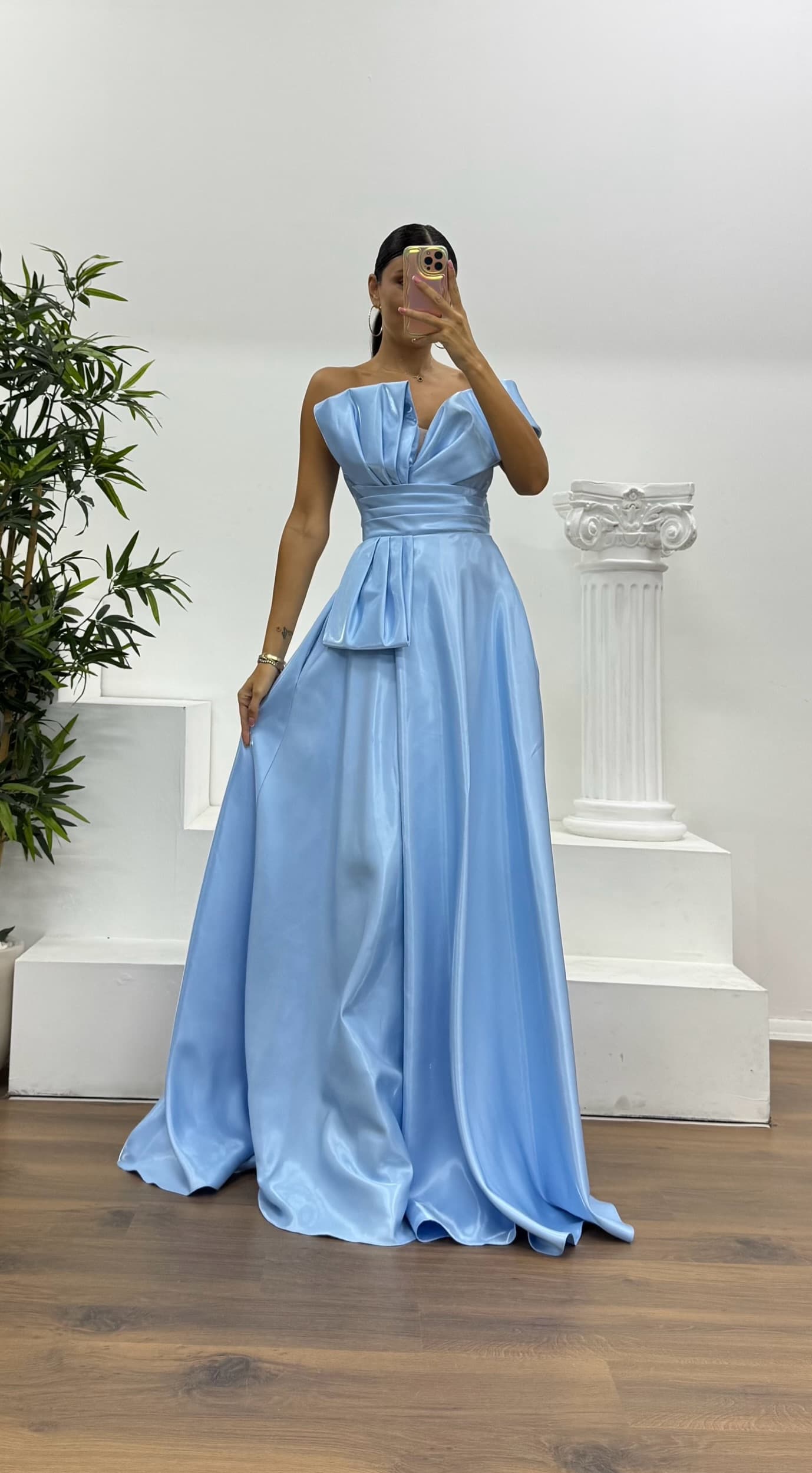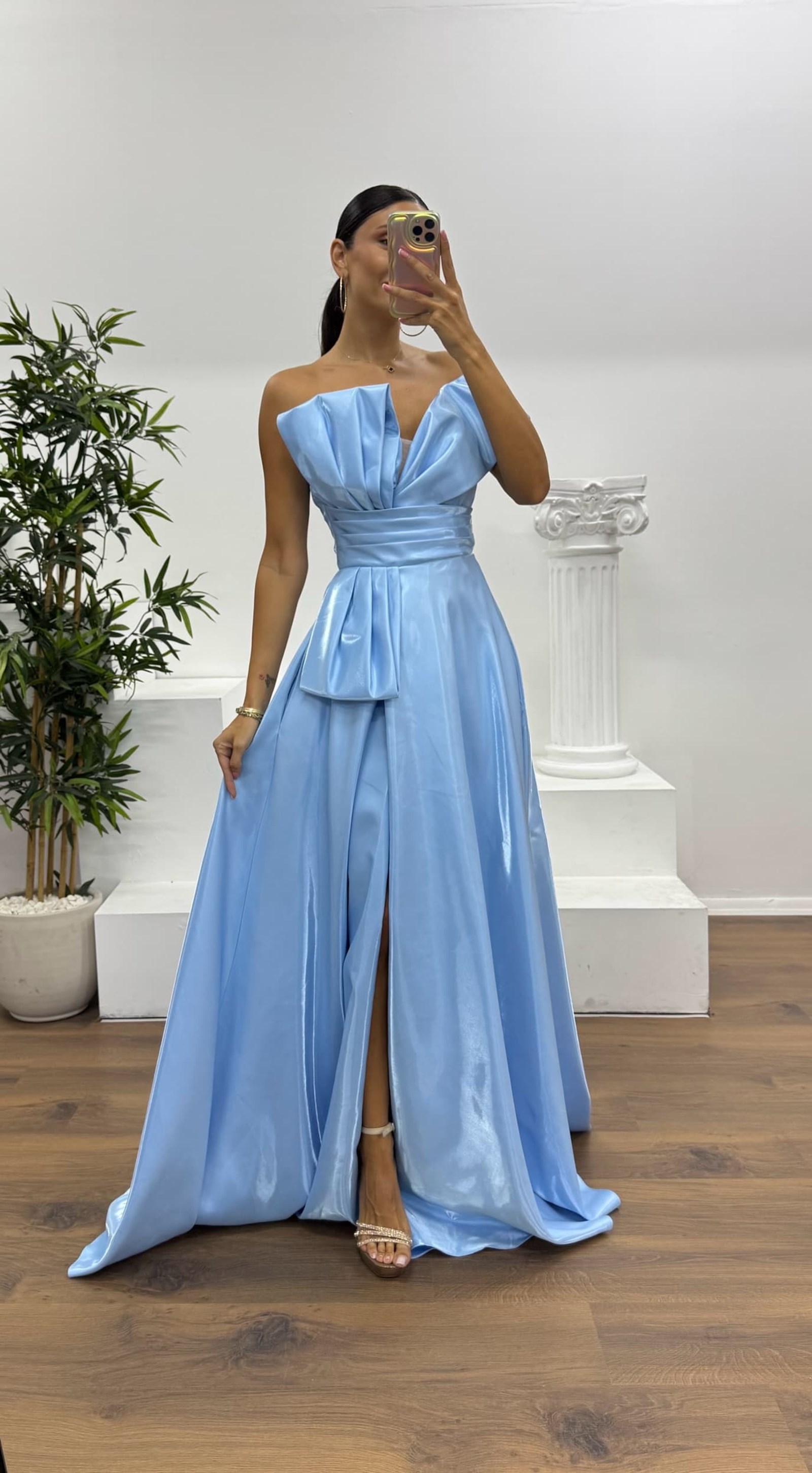 Ürün 36-42 bedene kadar uyumlu, göğüs pedli, astarlı, arka kapama fermuar, yırtmaçlı abiye olarak tasarlanmıştır.
