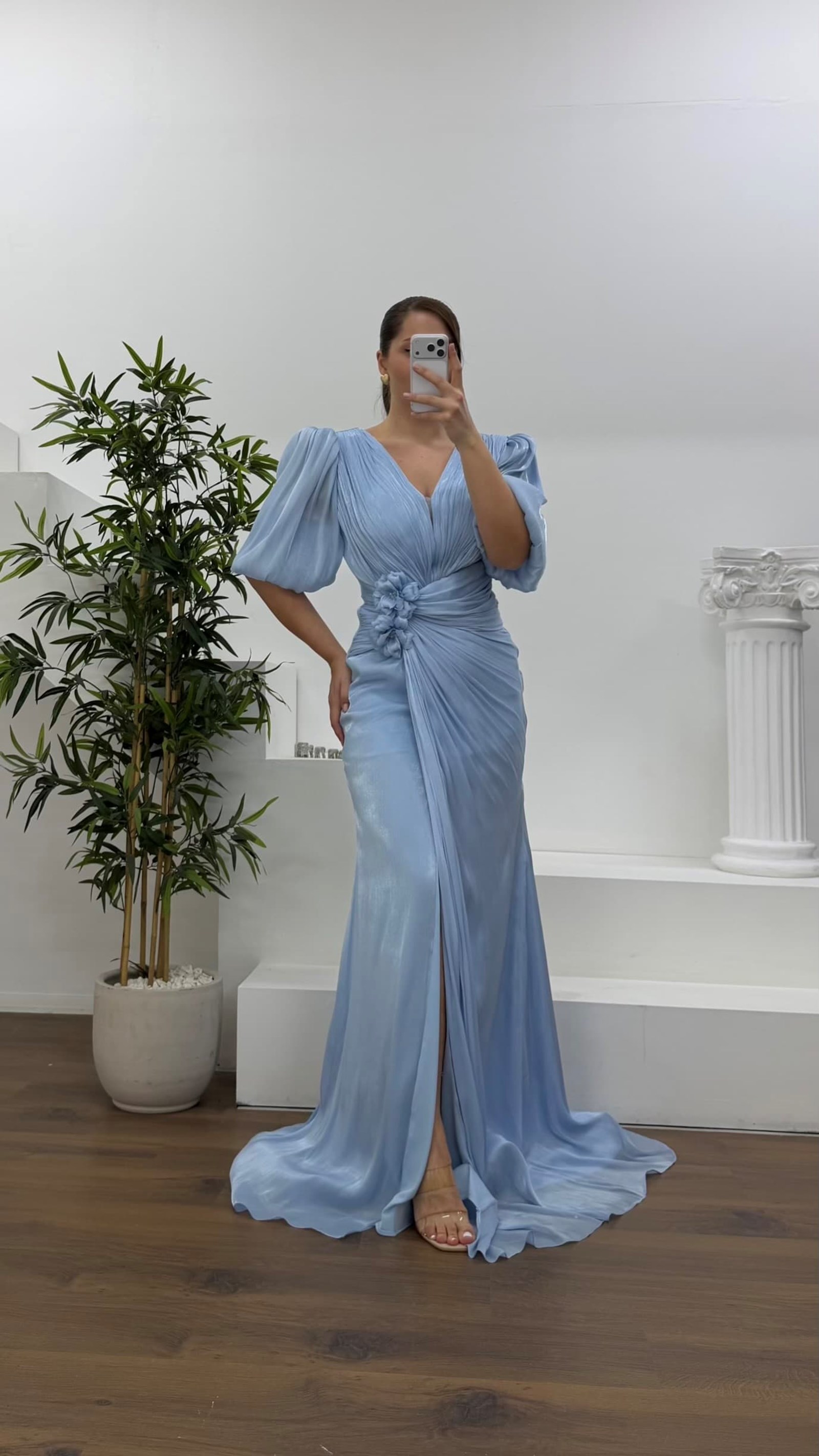 V yaka çiçek detay abiye elbise