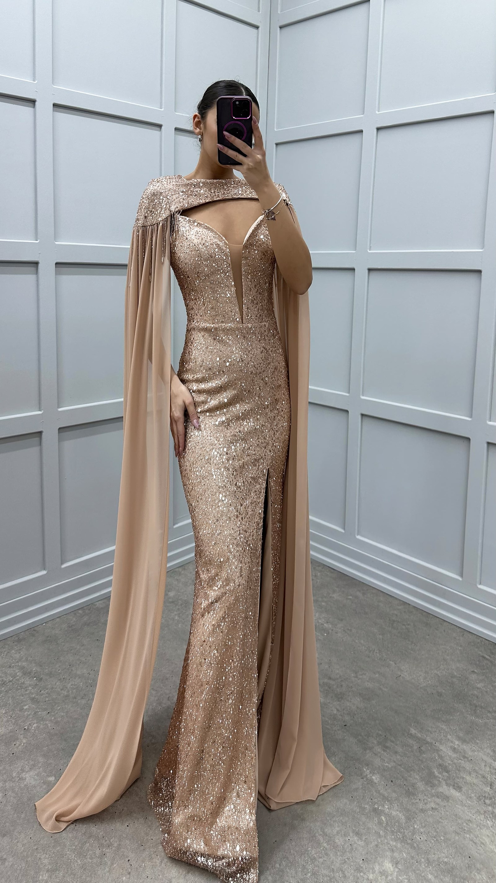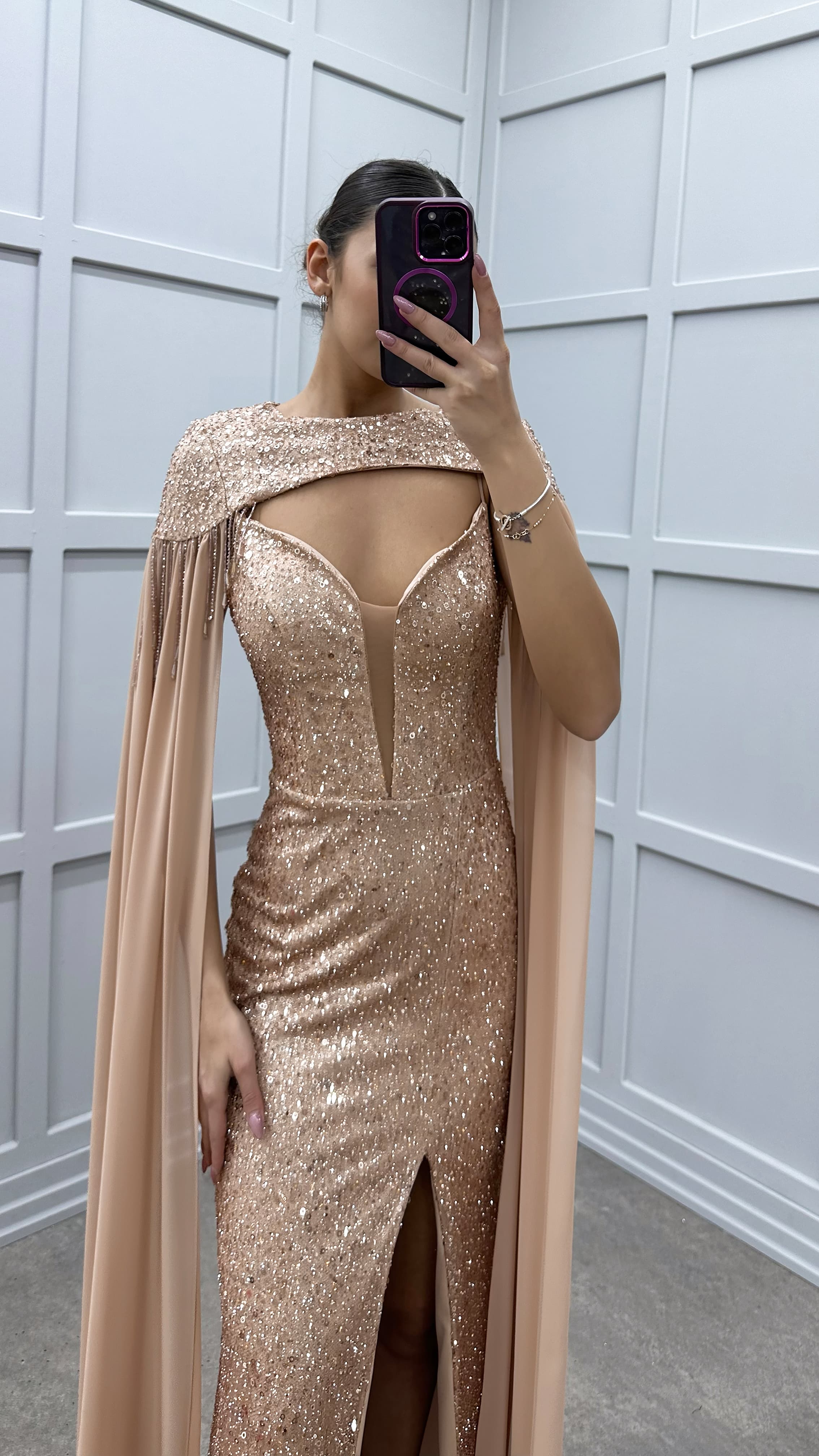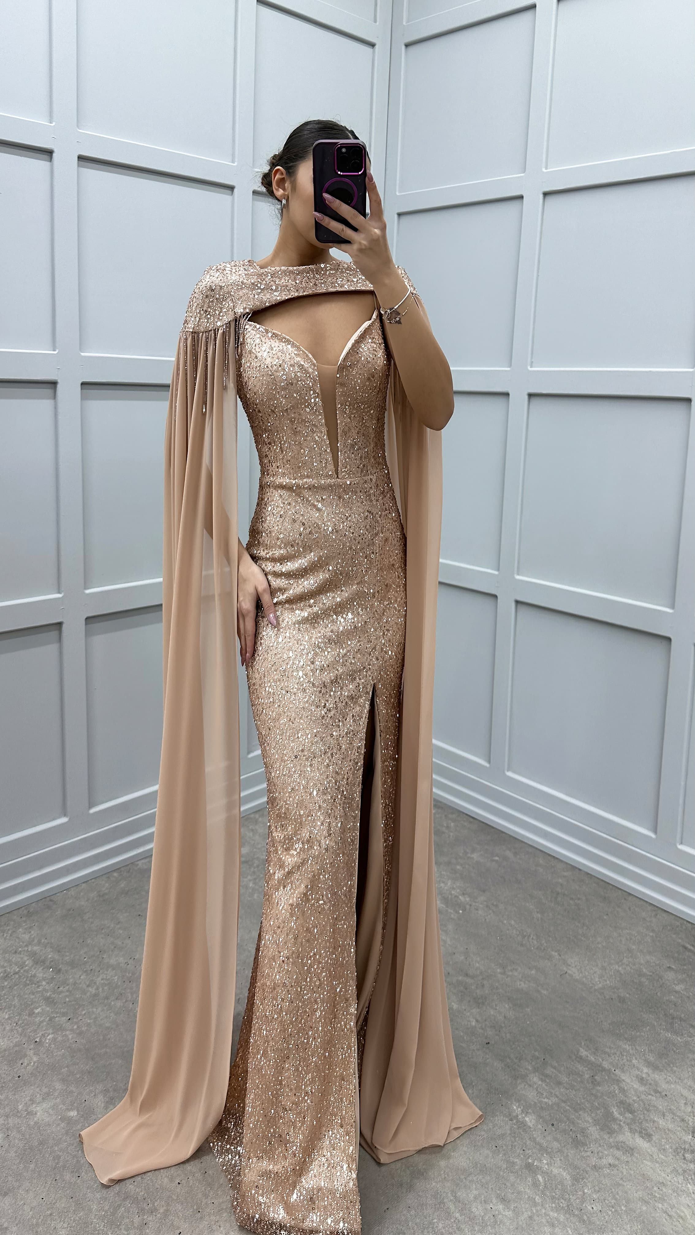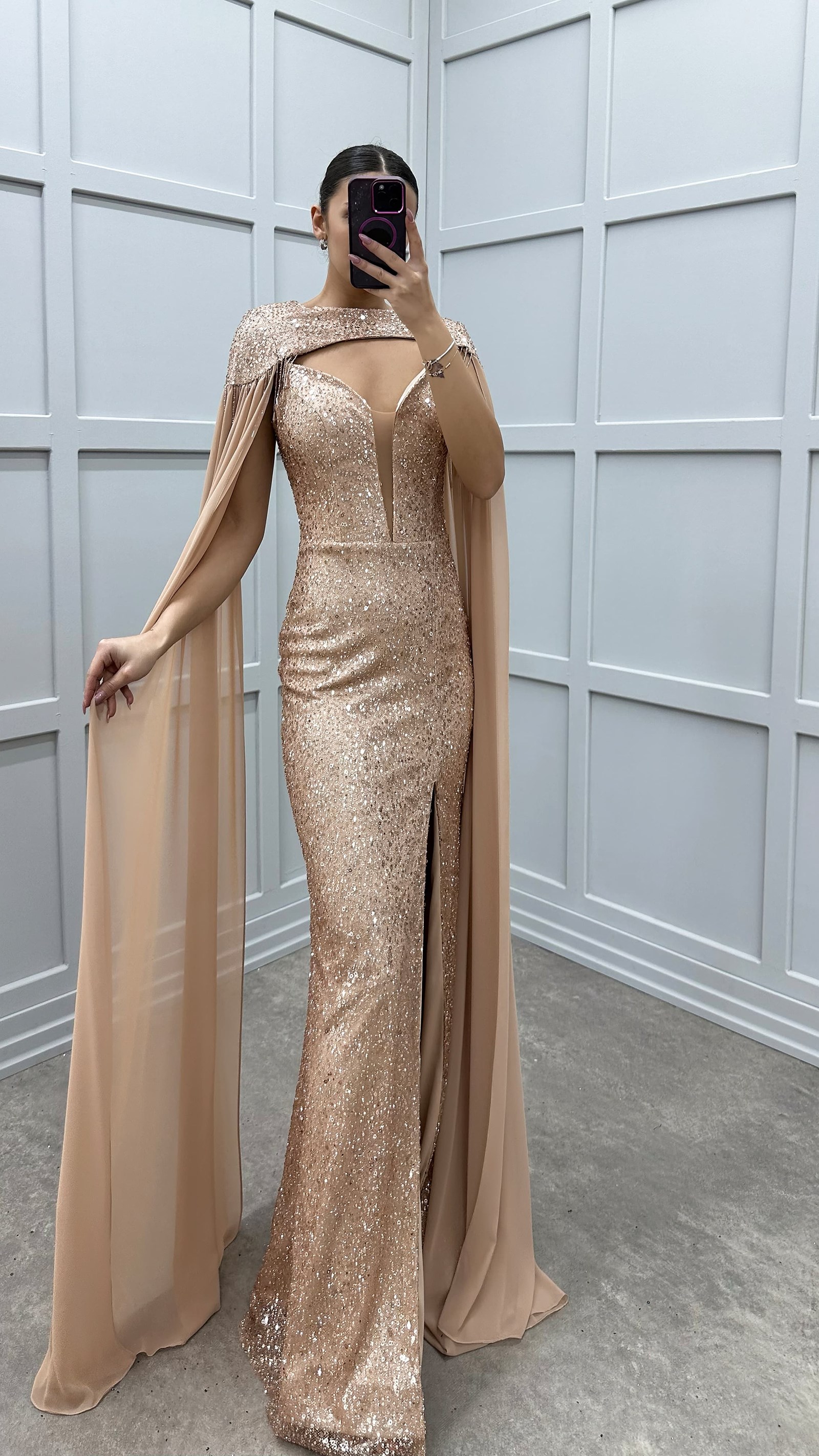 • Bej Boyun Detay Pelerinli Tasarım Payet Abiye Elbise