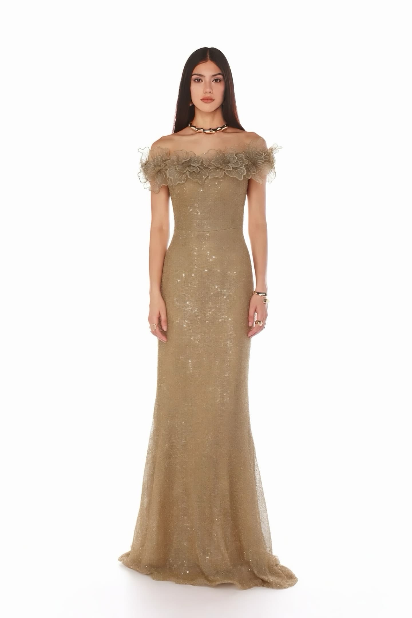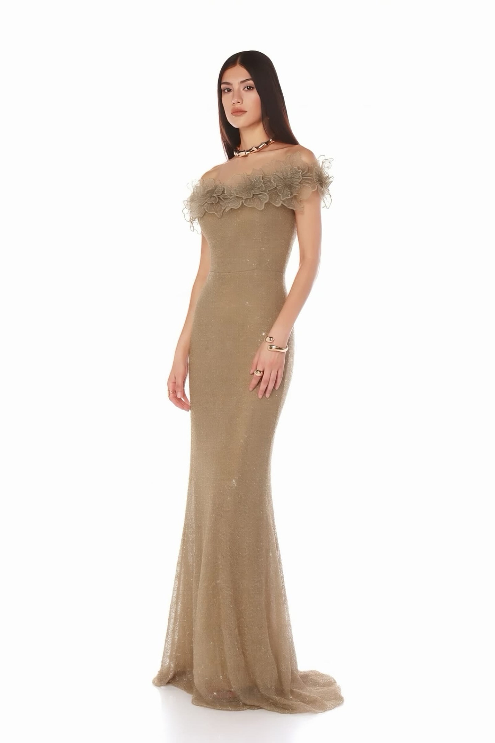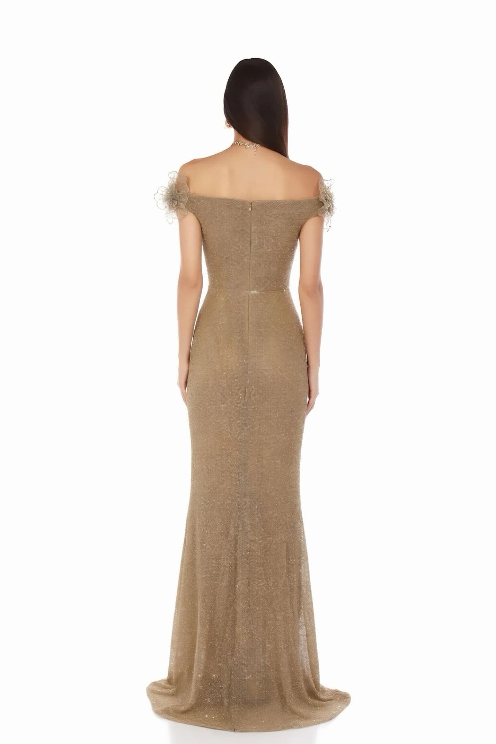 • Gold Çiçek Nakışlı Payetli Abiye Elbise