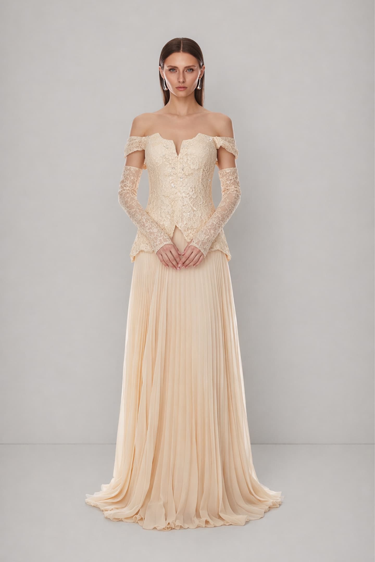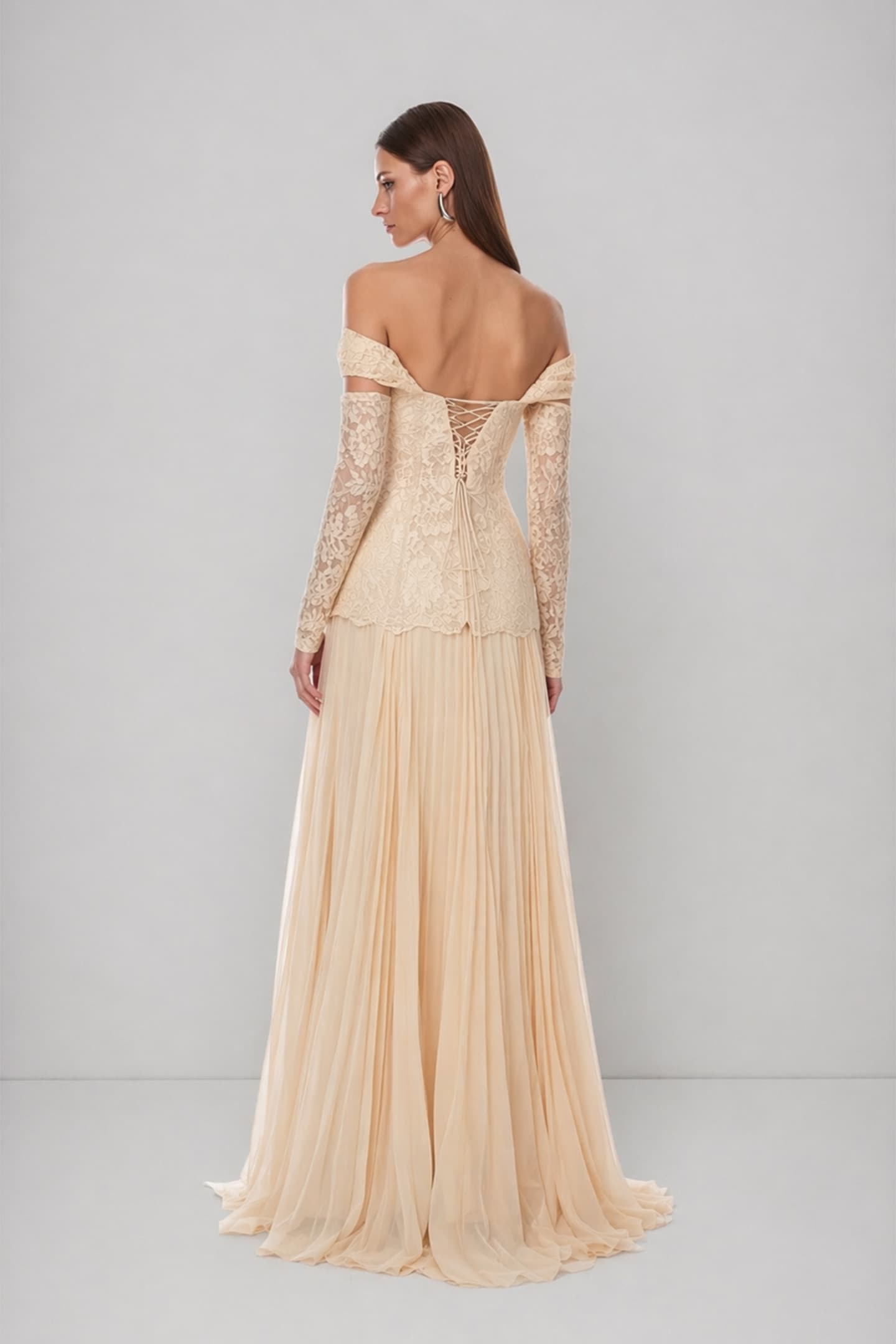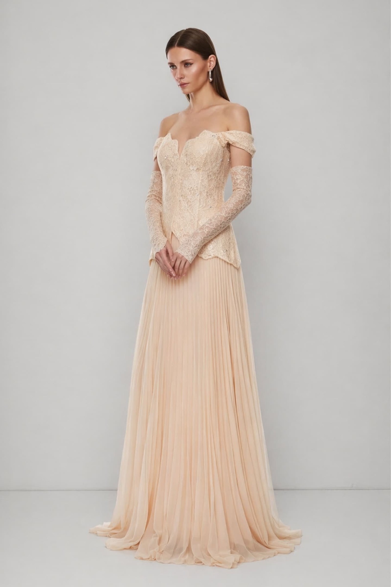 Bej Düşük Omuzlu Pileli Abiye Elbise