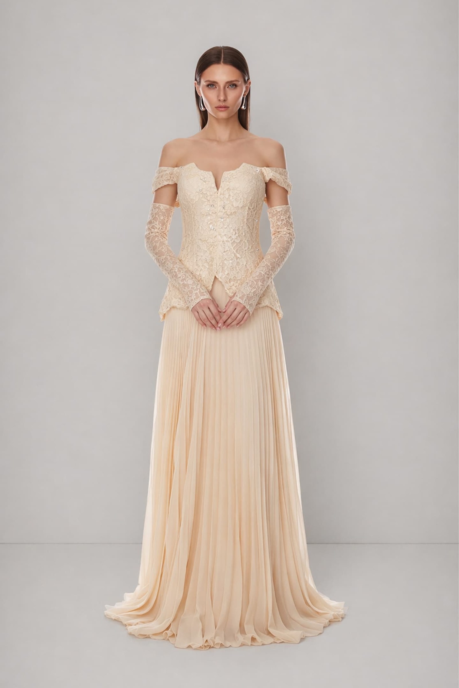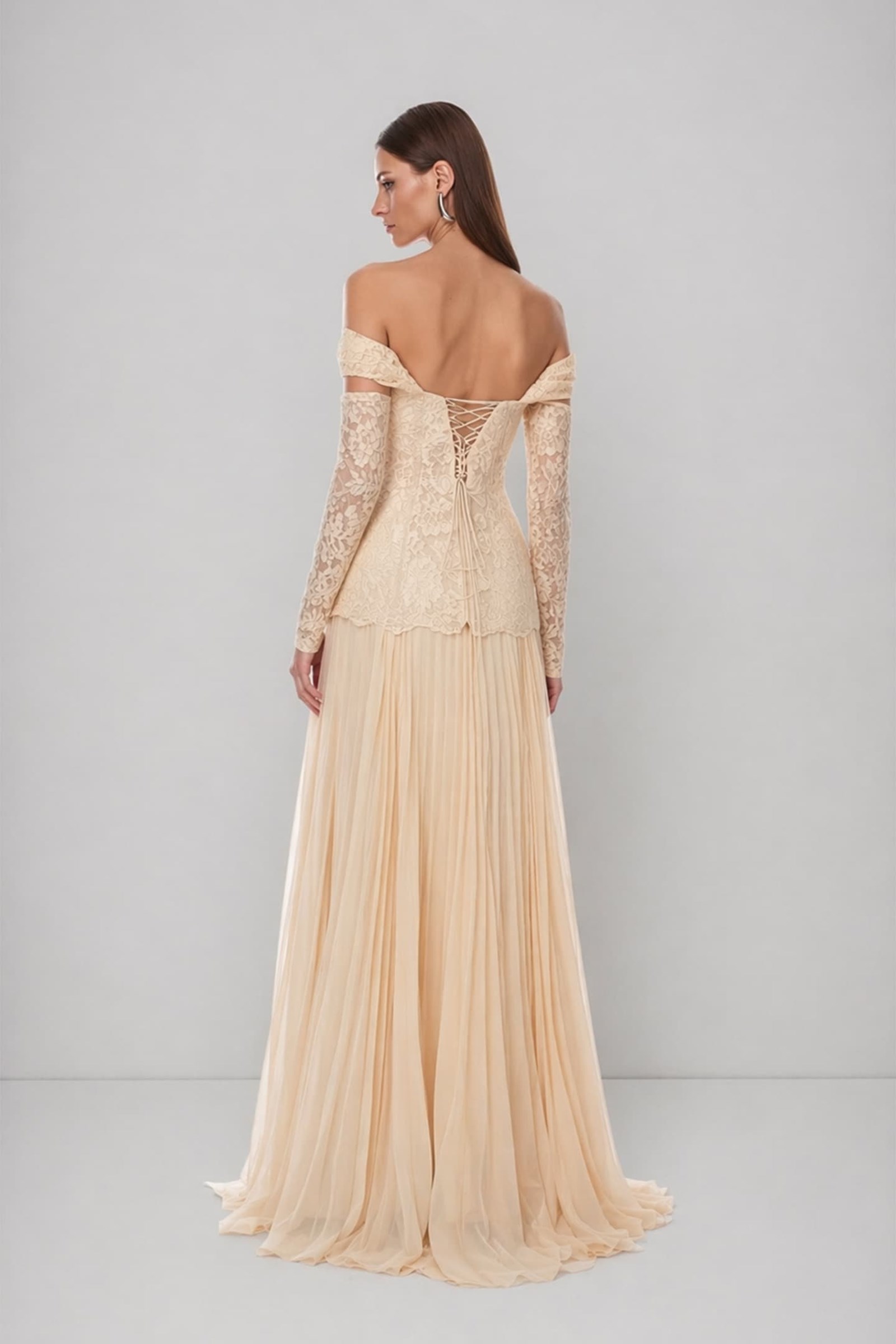 • Bej Düşük Omuzlu Pileli Abiye Elbise