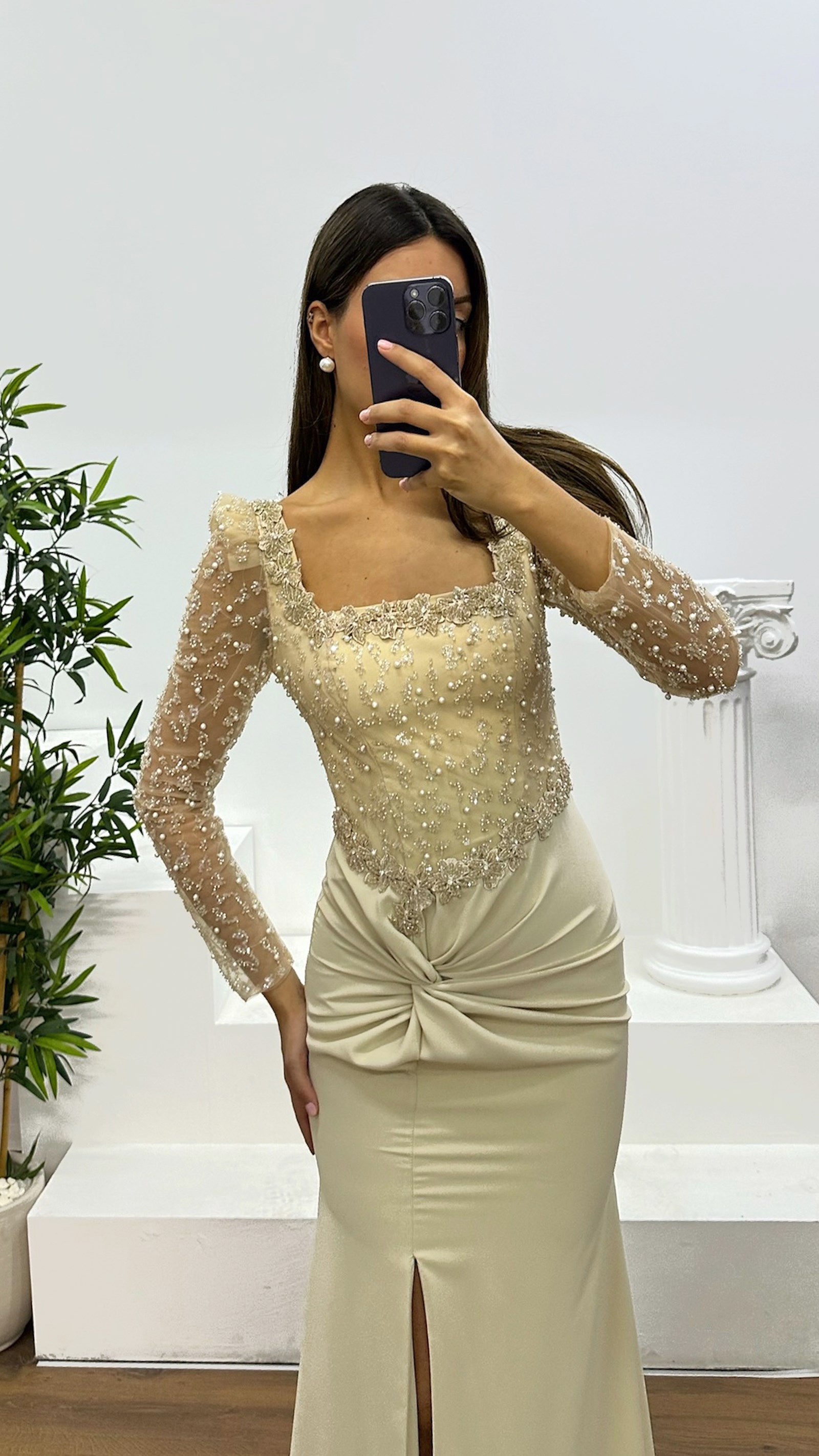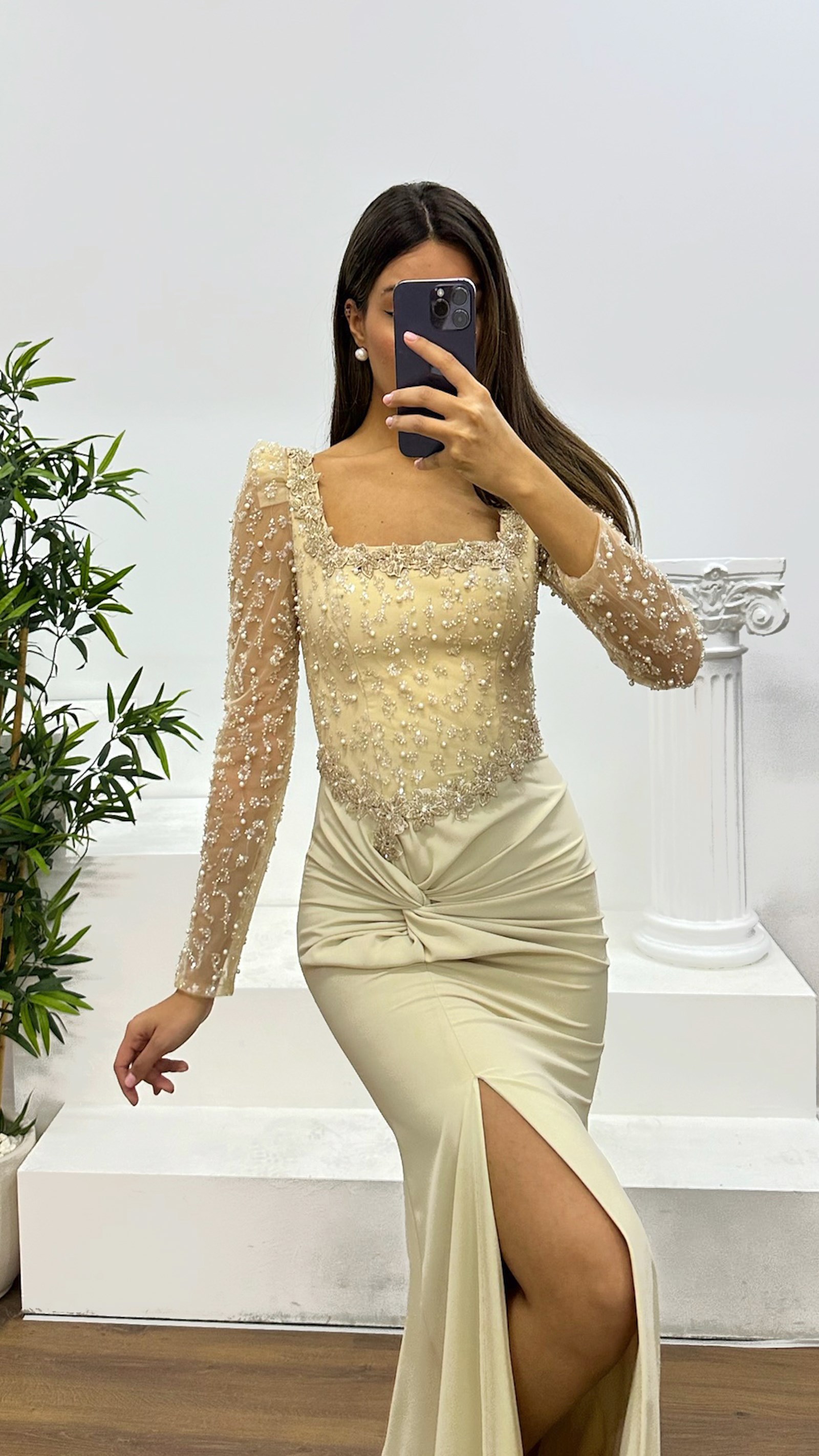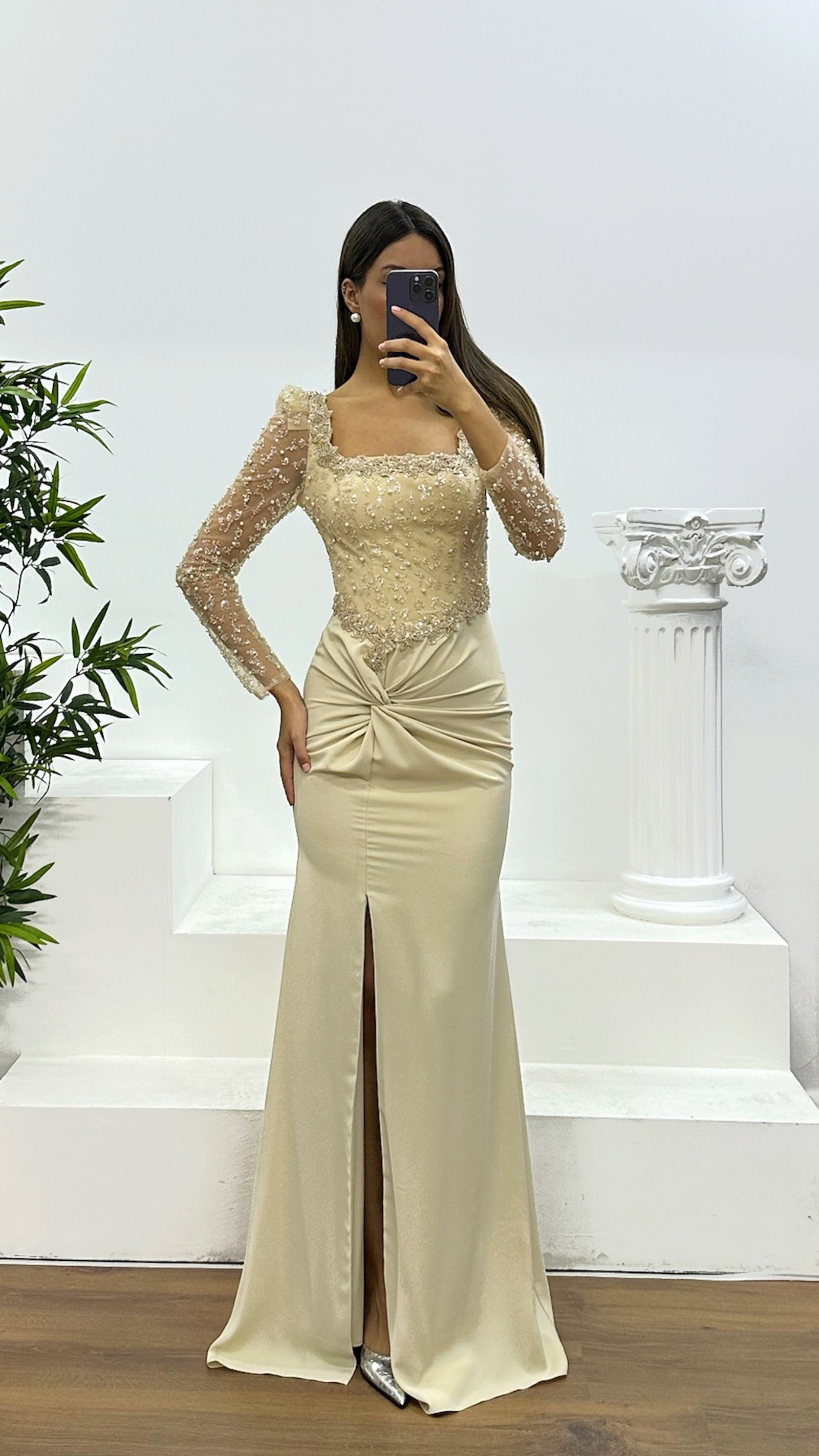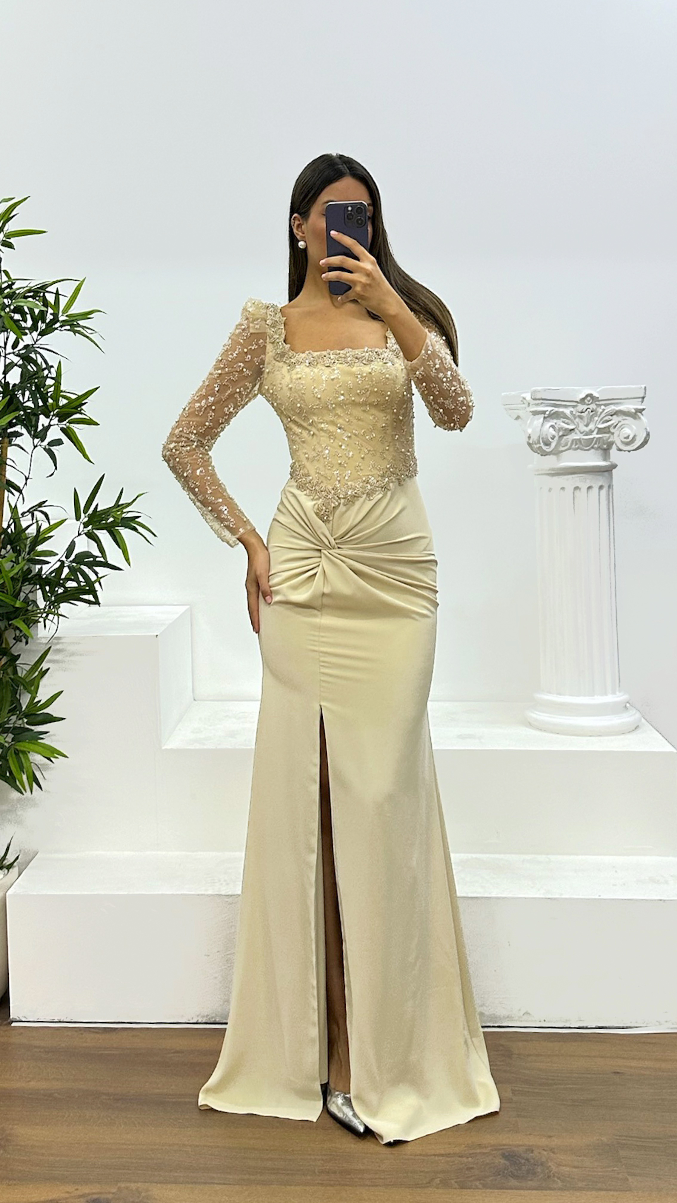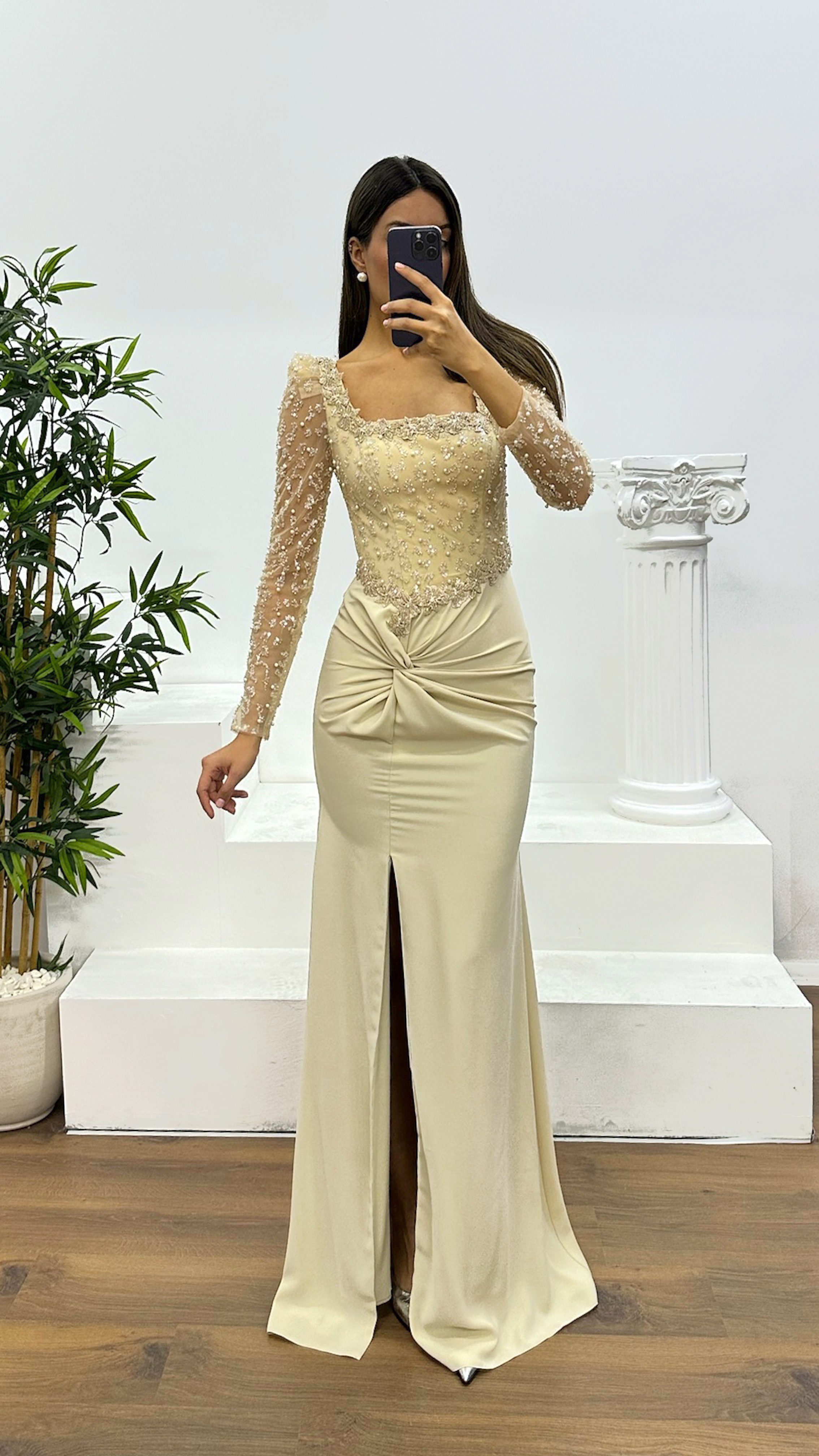 Ürün 36-44 bedene kadar uyumlu, göğüs pedli, astarlı, arka kapama fermuar, yırtmaçlı, işlemeli abiye olarak tasarlanmıştır.