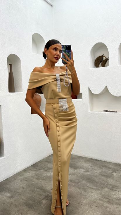 Bej Kayık Yaka Düğme Detay Abiye Elbise
