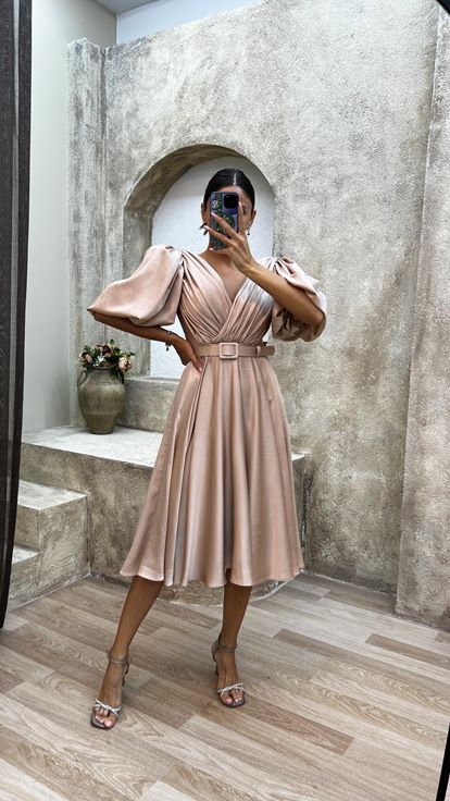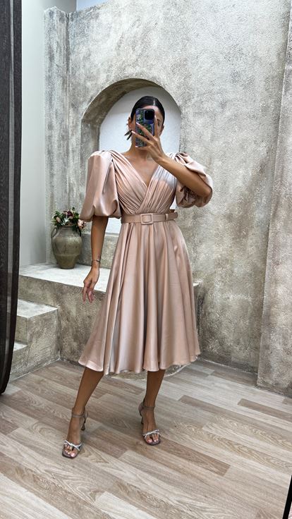 Bej Kruvaze Yaka Balon Kol Midi Boy Abiye Elbise
