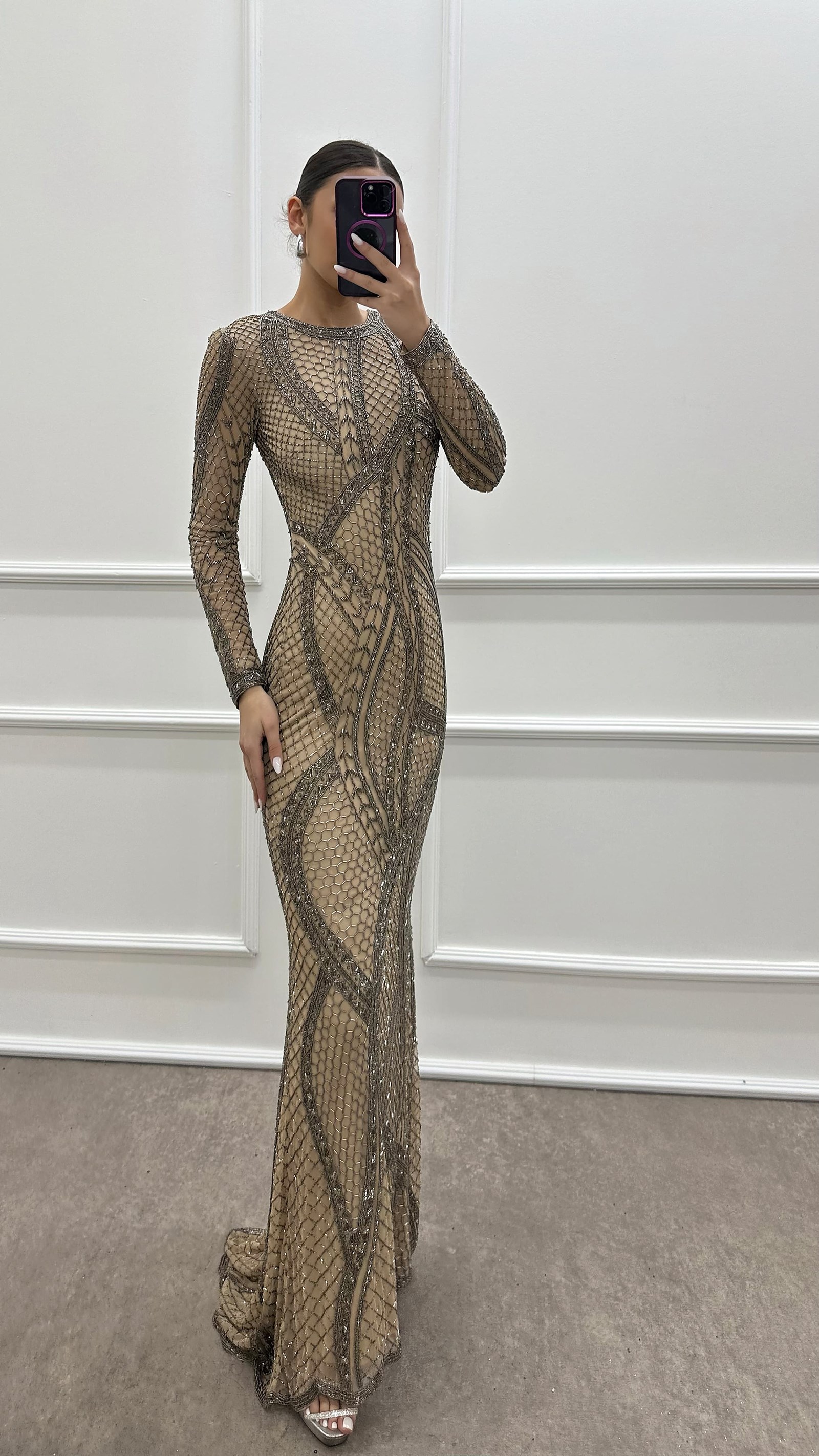 • Bej Özel İşlemeli Tasarım Abiye Elbise