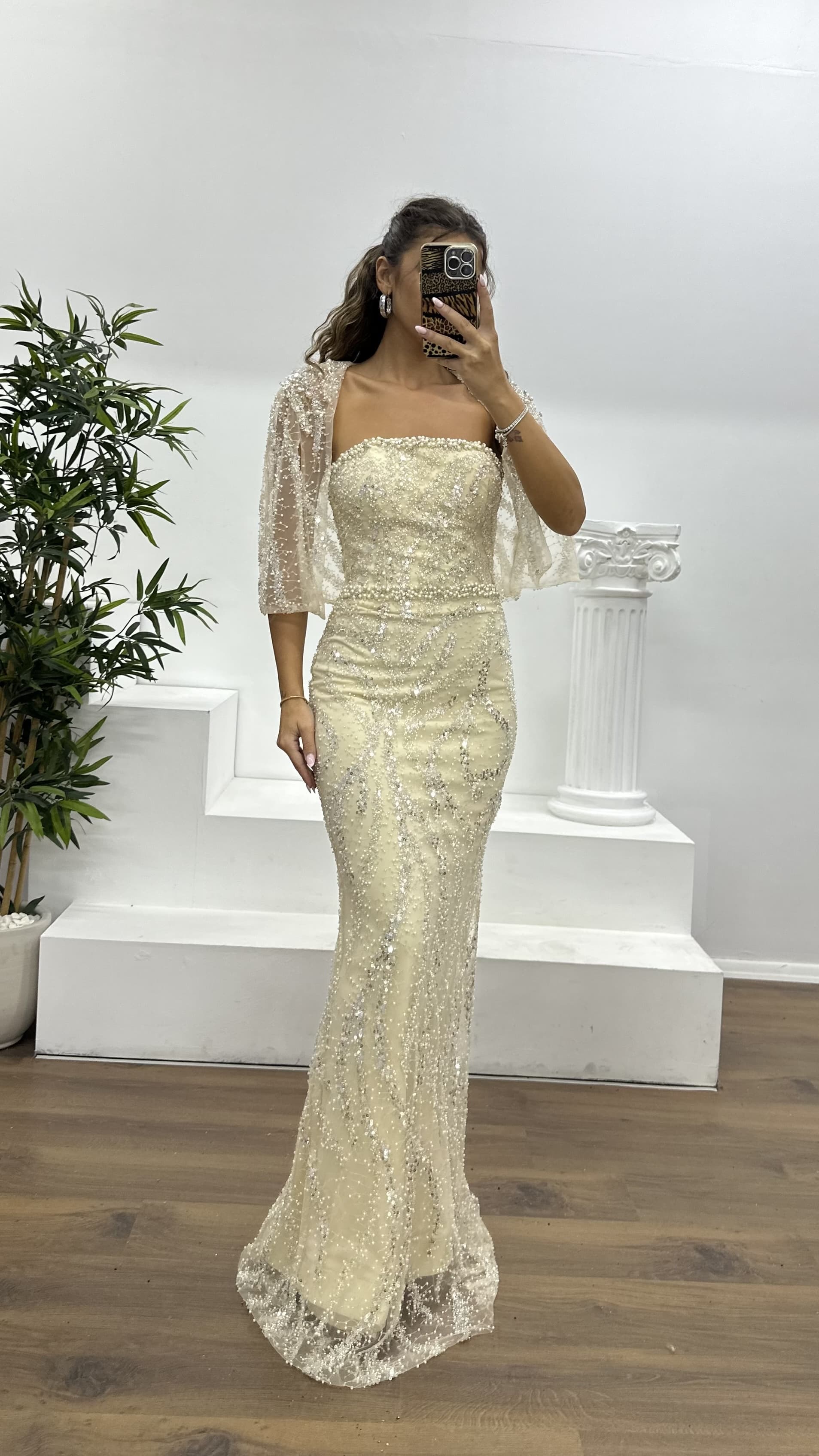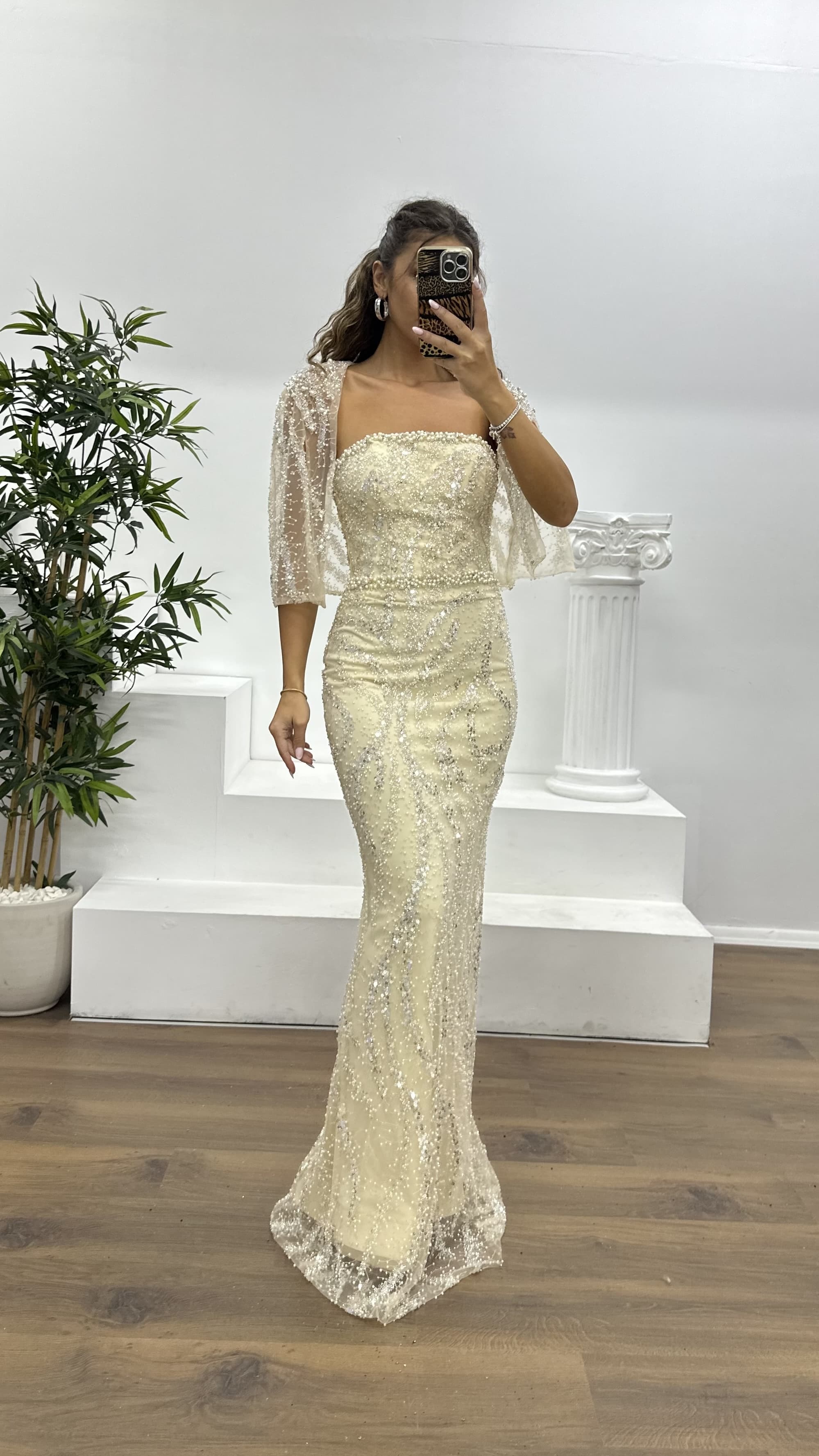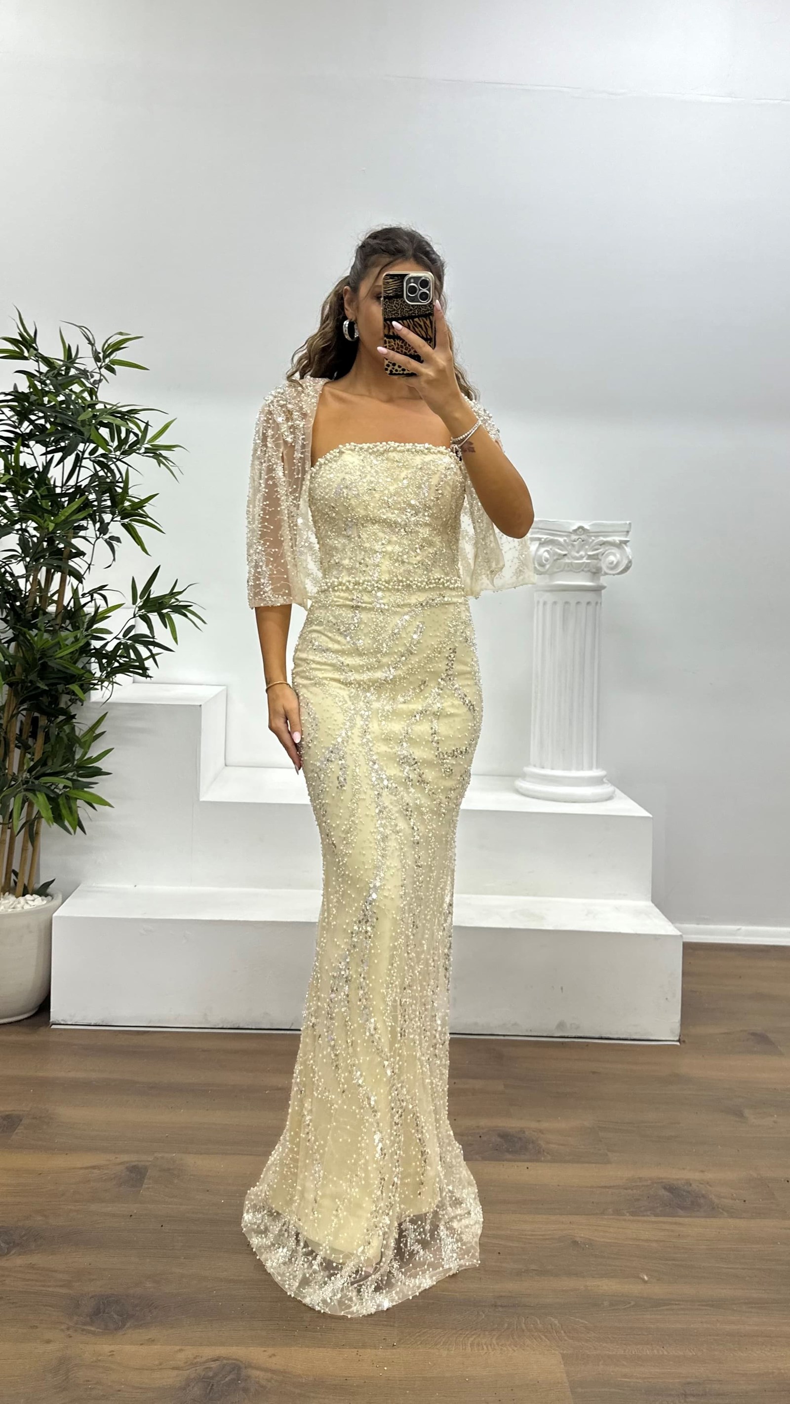 Ürün 36-42 bedene kadar uyumlu, göğüs pedli, astarlı, arka kapama fermuar, pelerinli, işlemeli abiye olarak tasarlanmıştır.