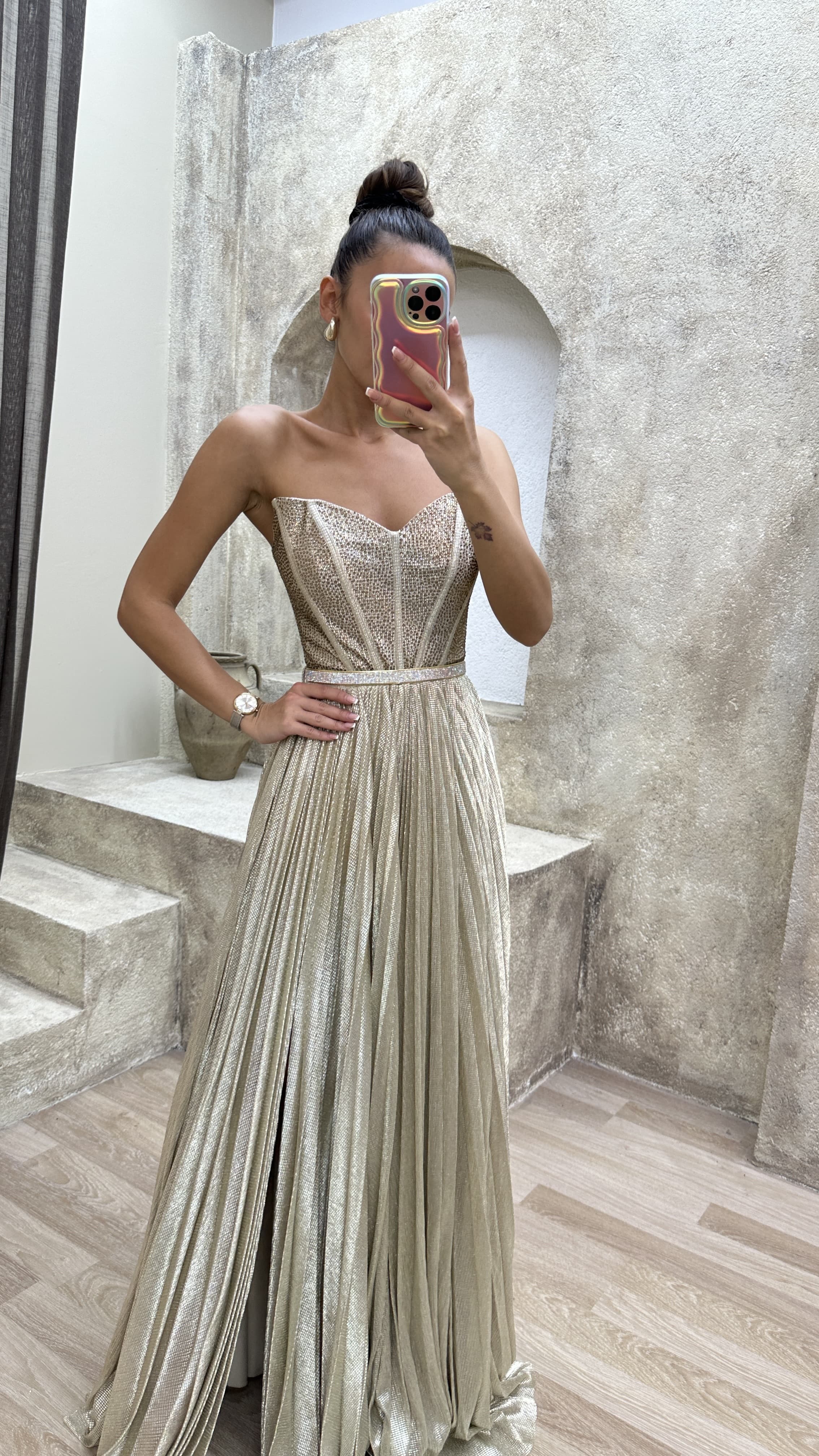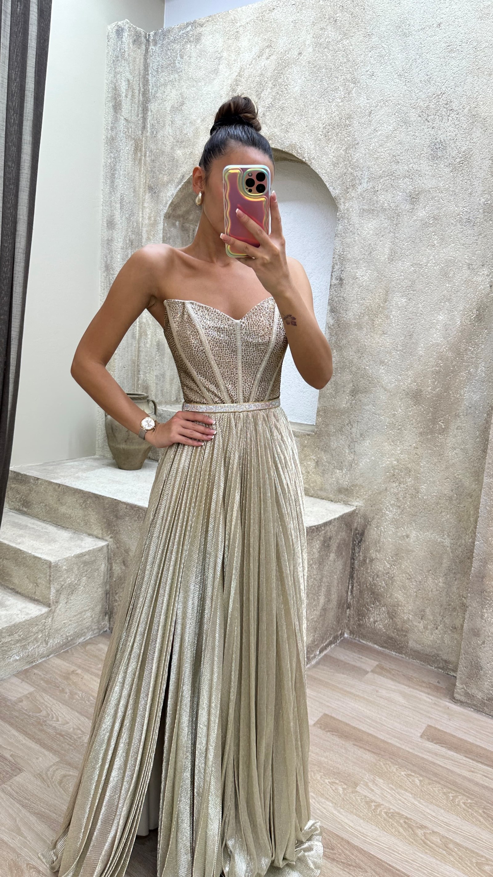 • Bej Straplez Pliseli İşlemeli Abiye Elbise