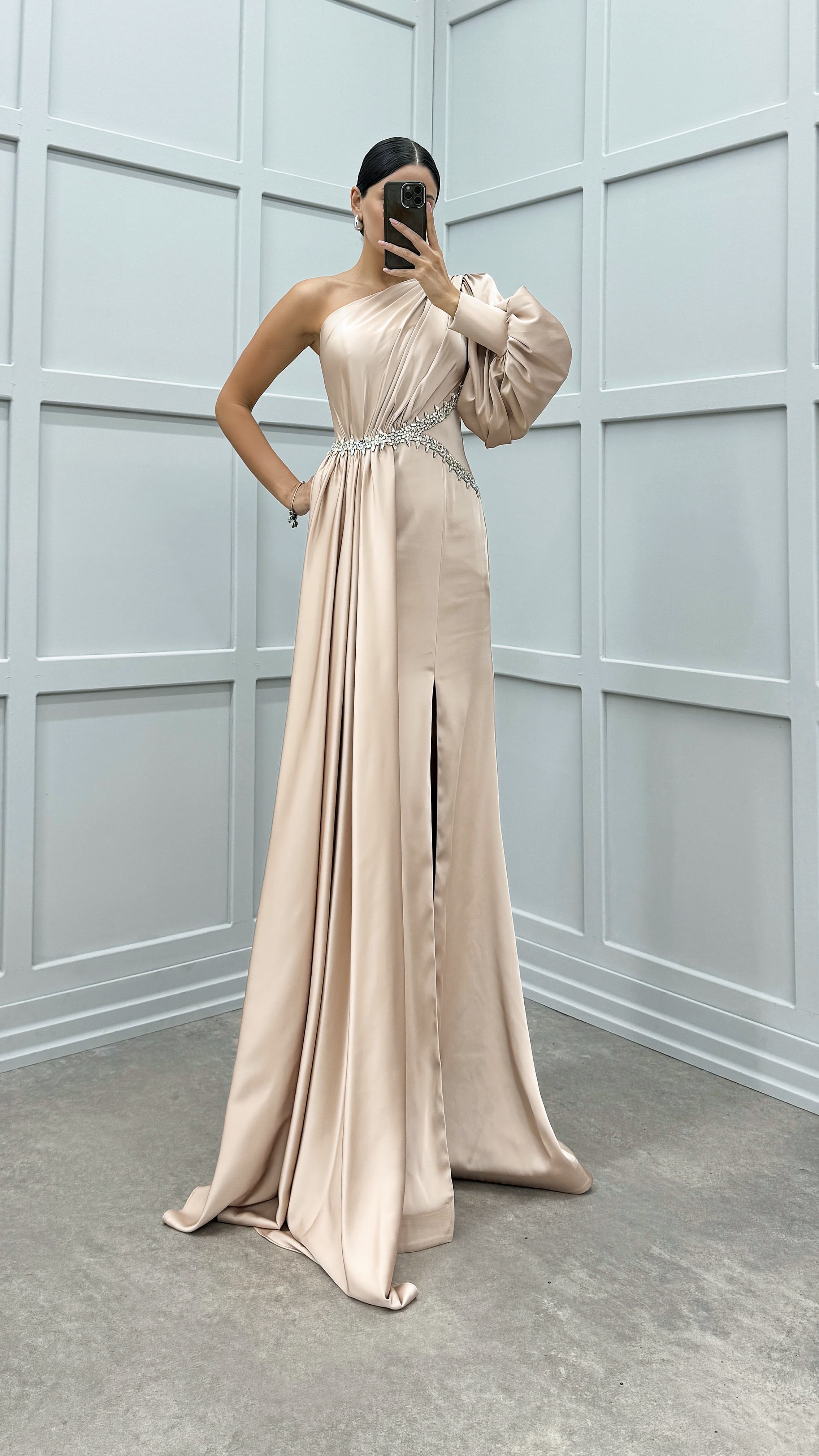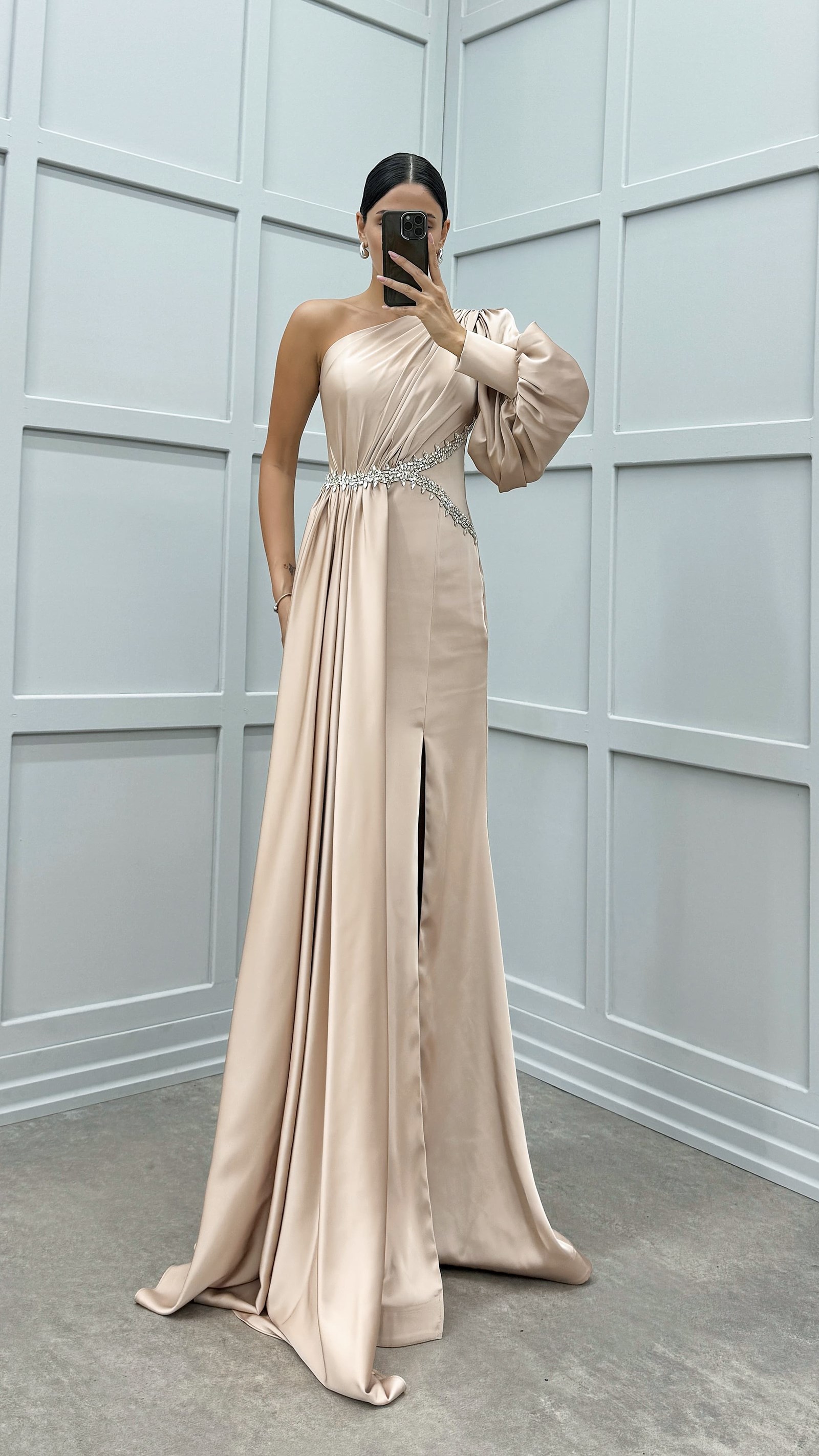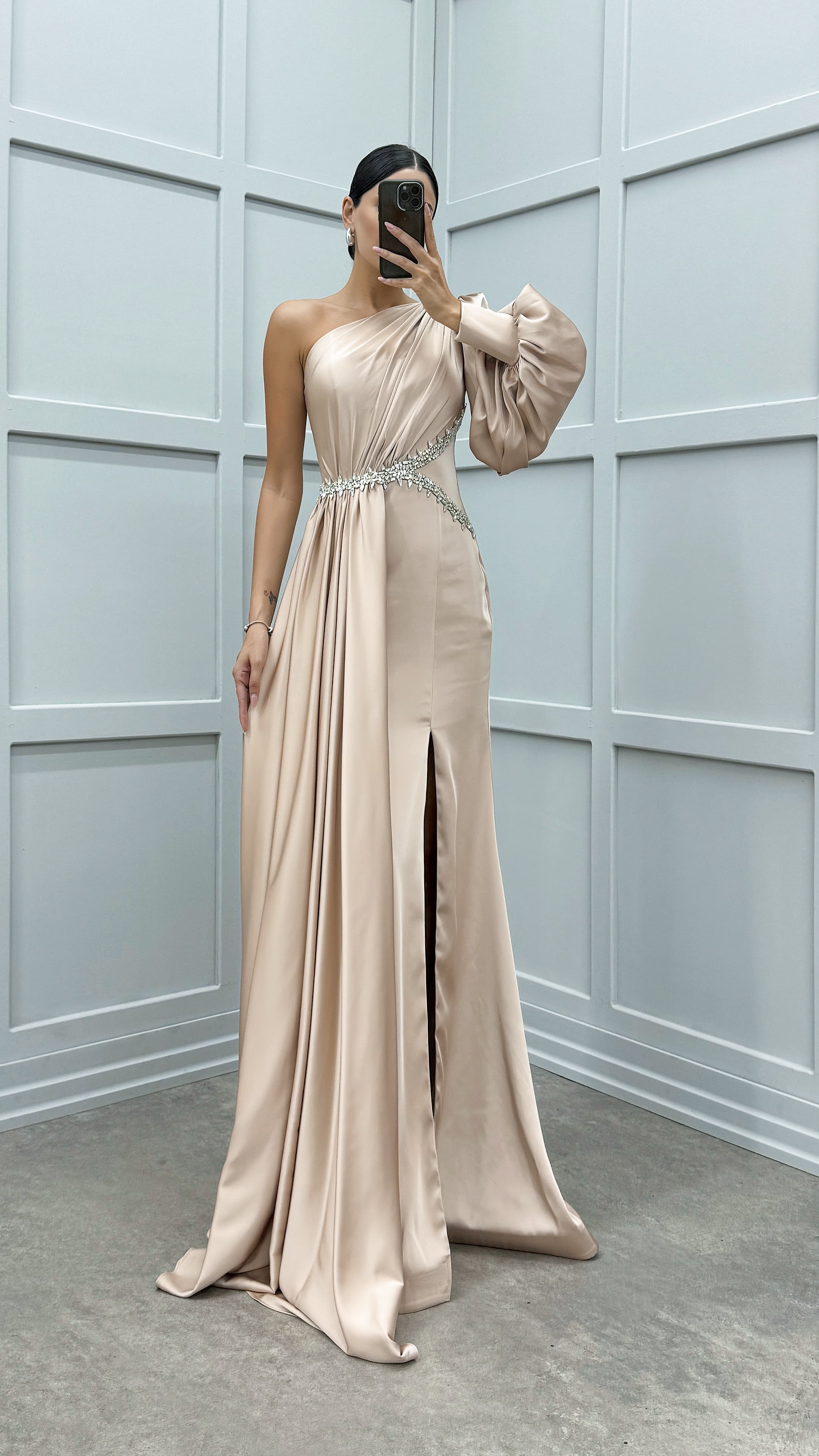 • Bej Tek Omuz Beli Taşlı Tasarım Elbise