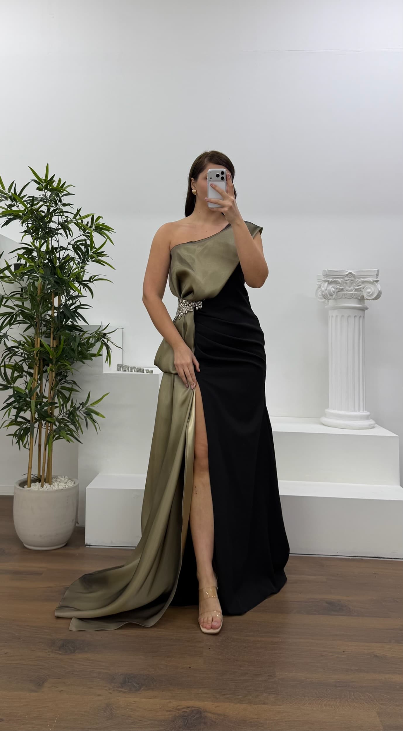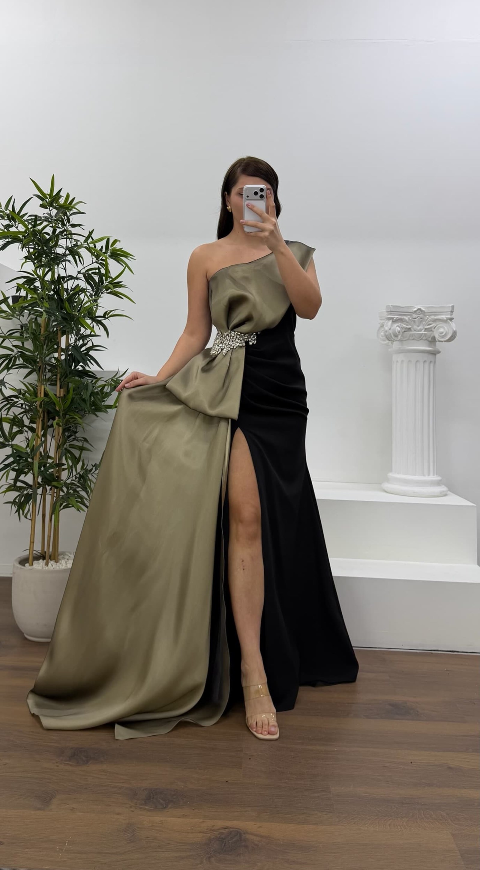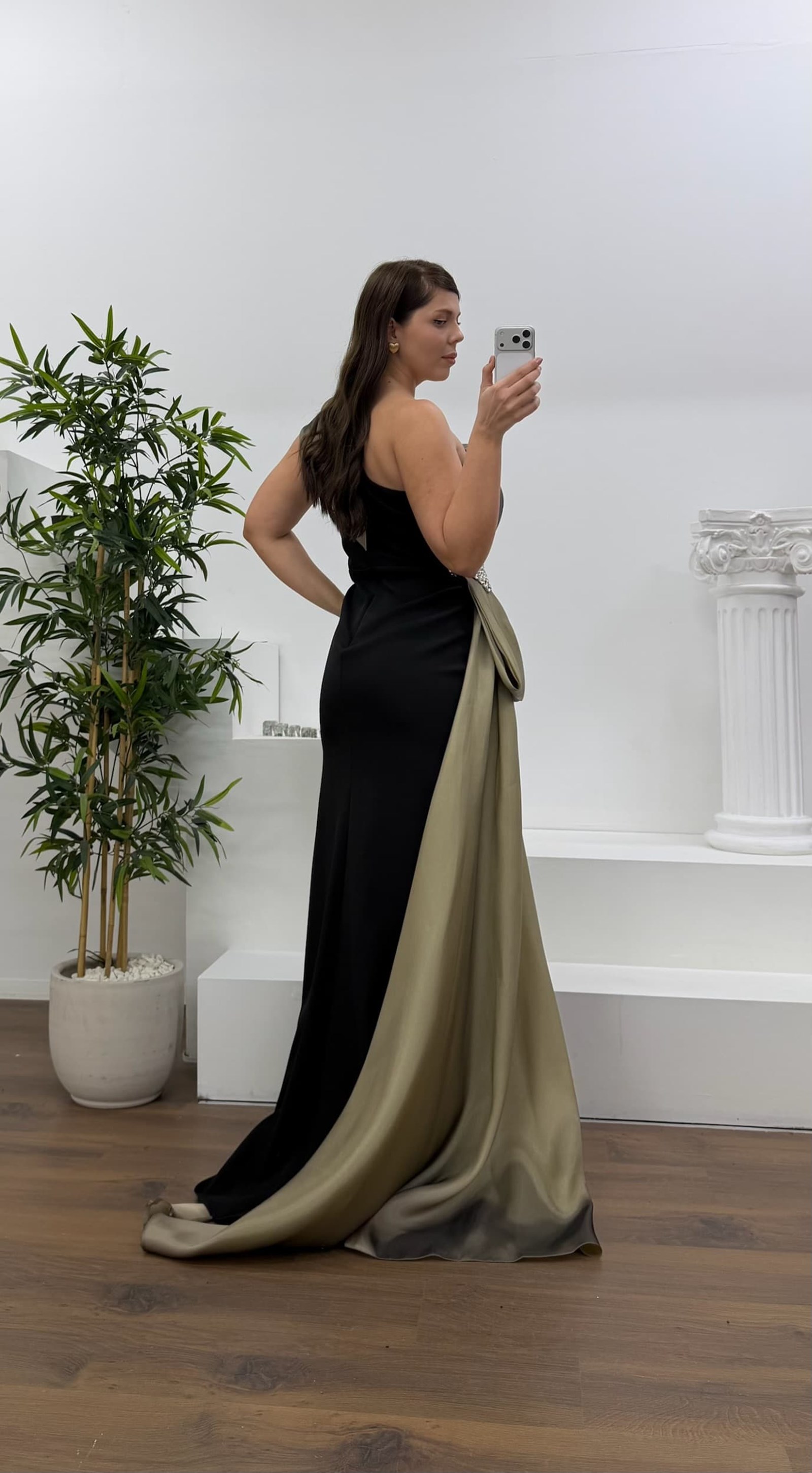 • Kemik Tek Omuz Taş Detay Büyük Beden Abiye Elbise