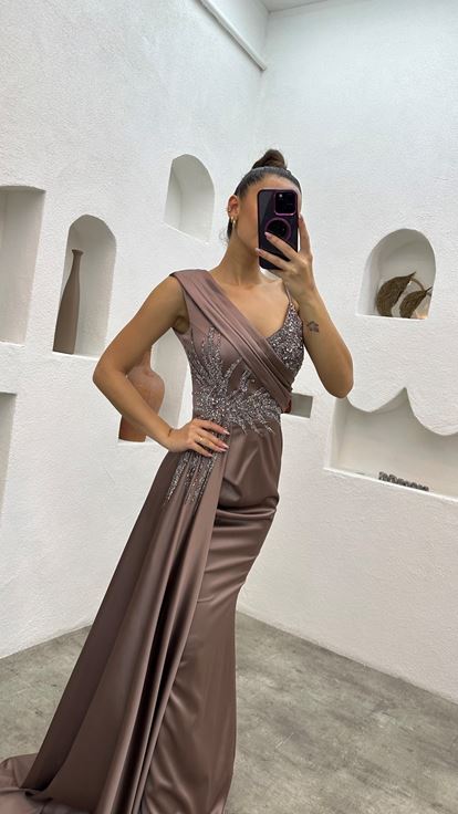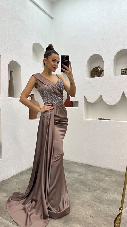 • Bej Tek Omuz Taş İşlemeli Saten Abiye Elbise