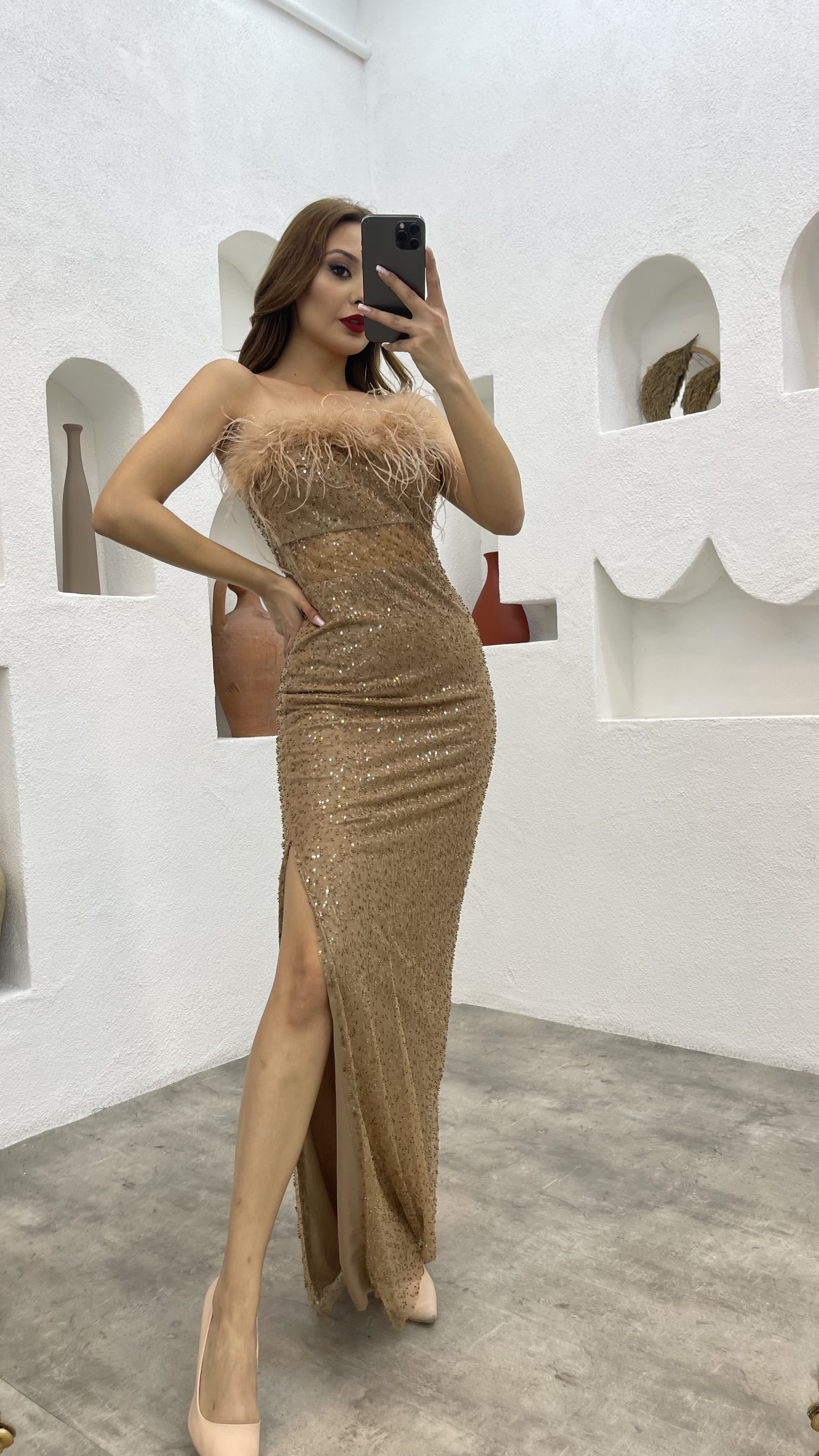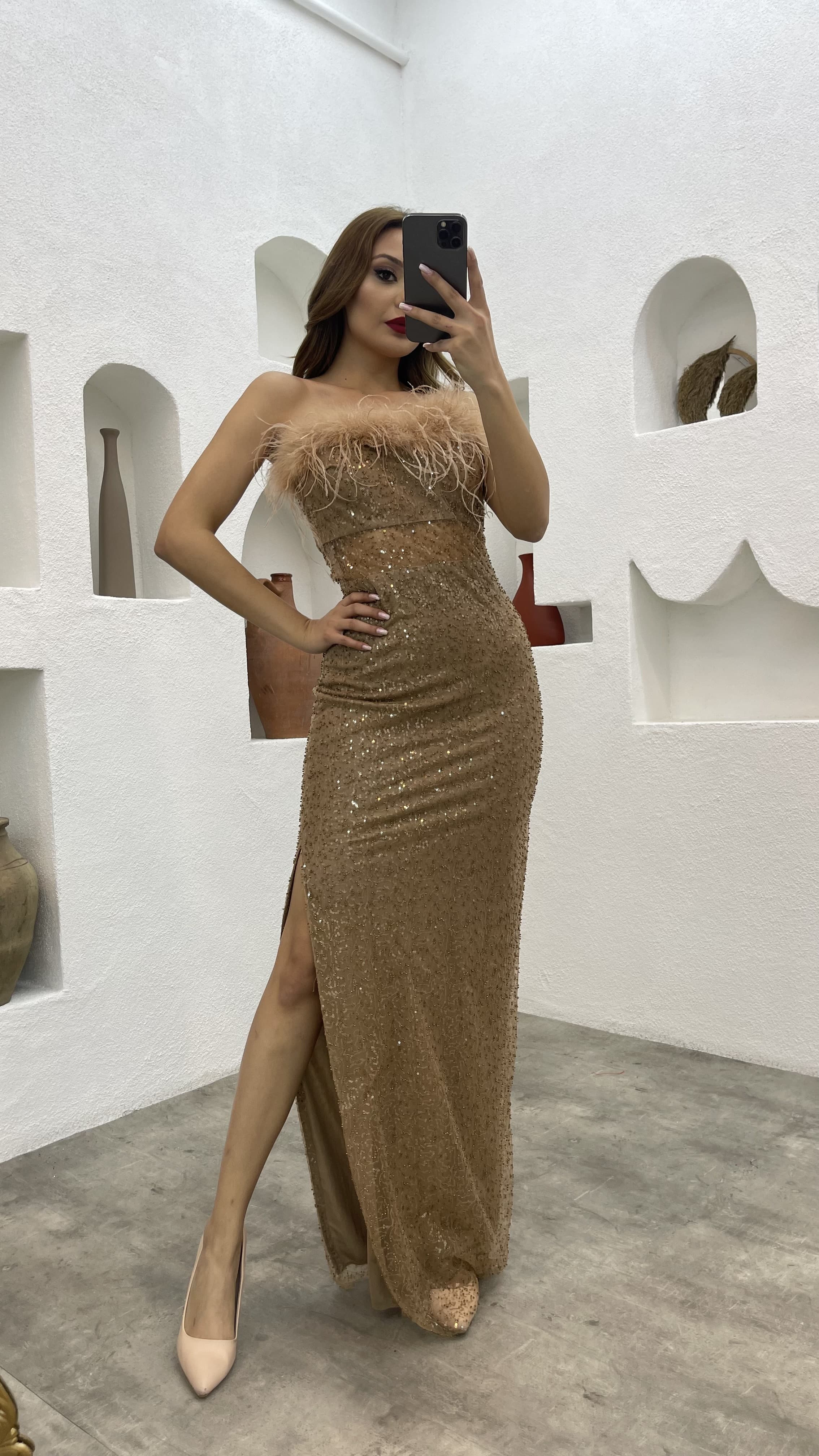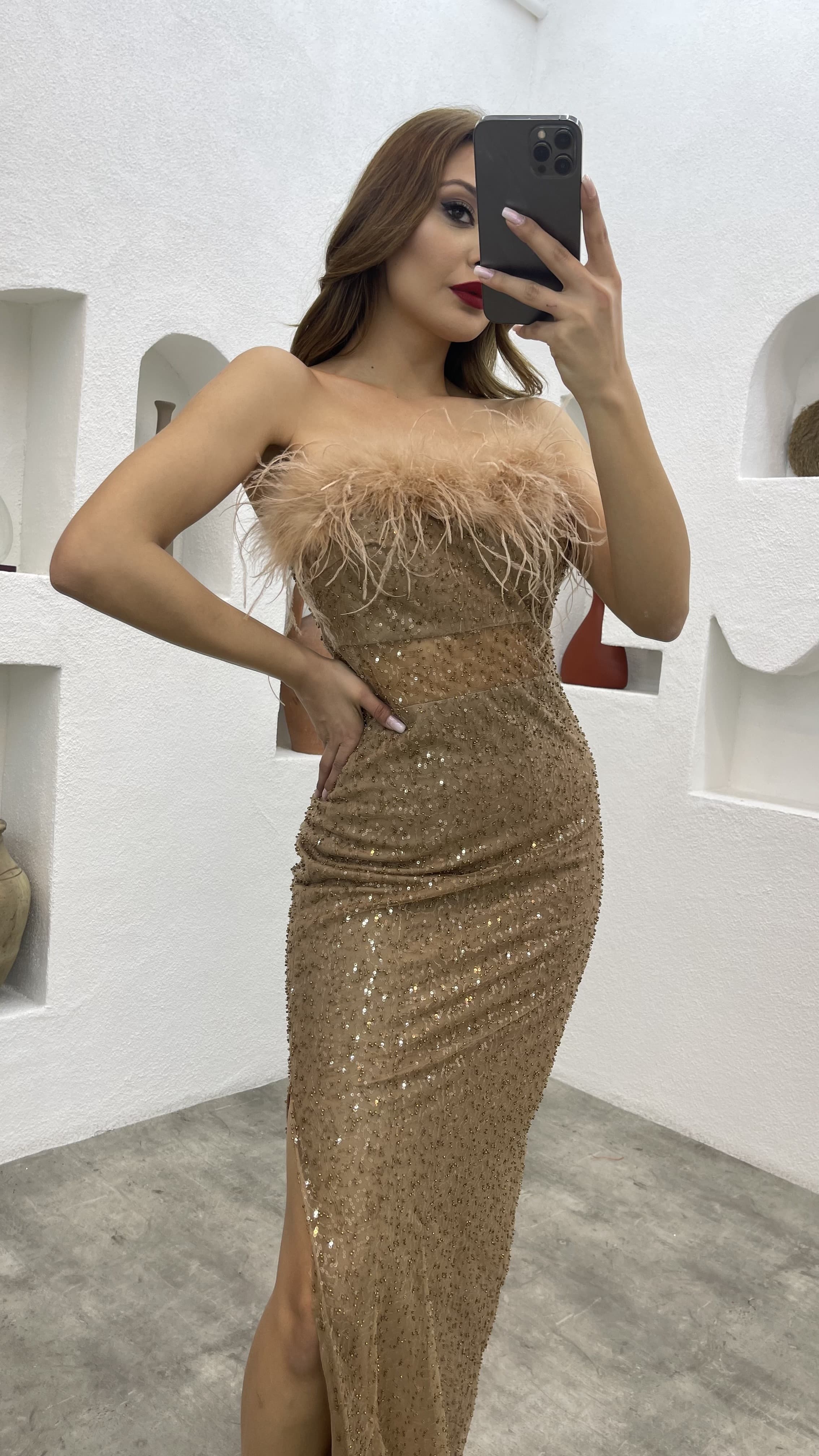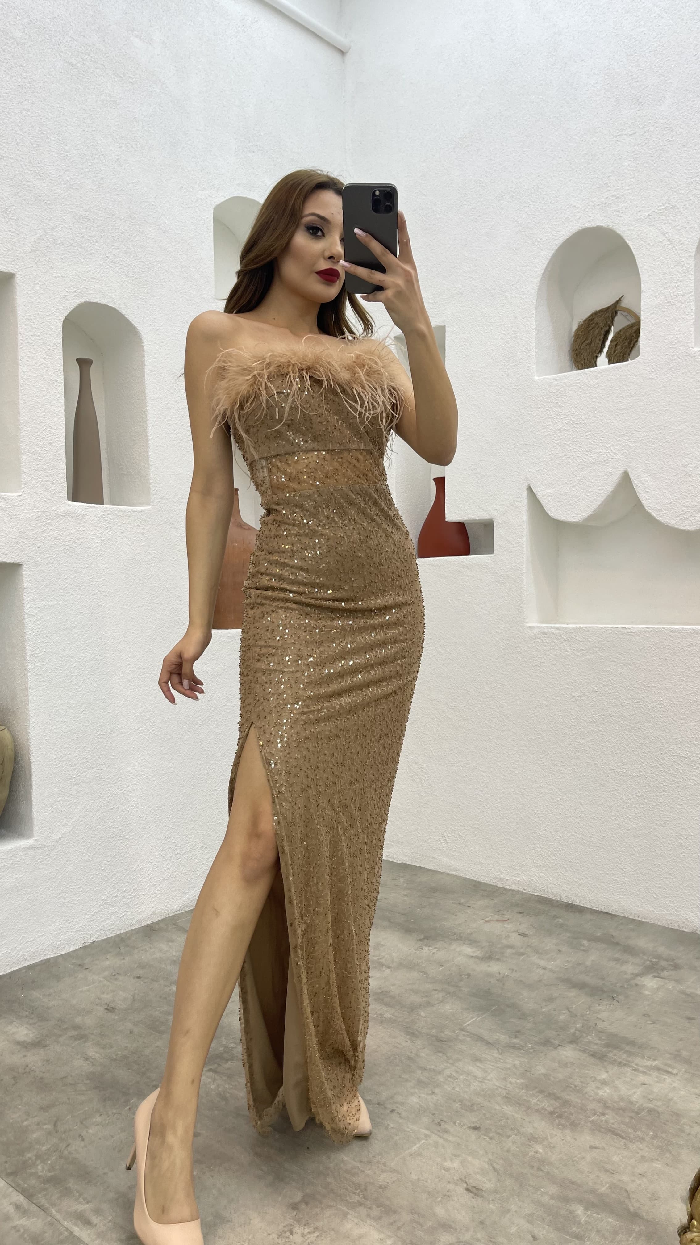 • Kırmızı Tüylü Transparan Detay Abiye Elbise