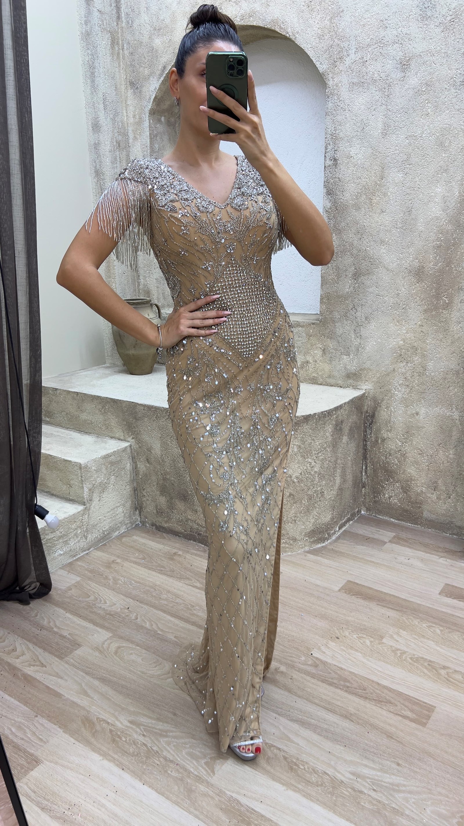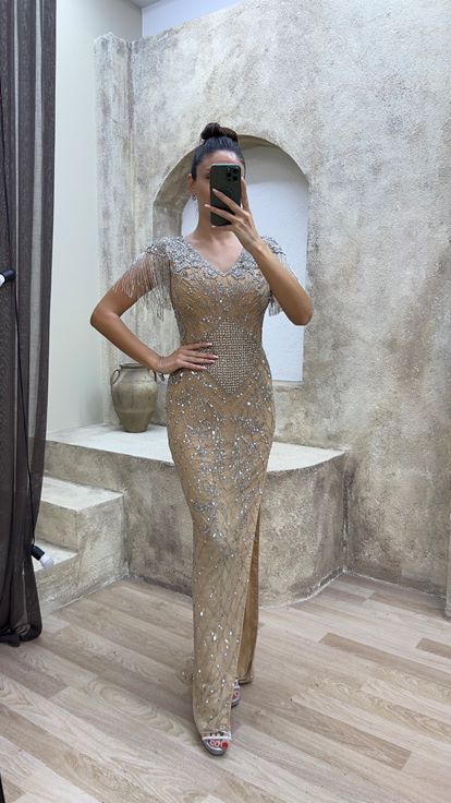 • Bej V Yaka Omuzları Püsküllü Özel İşleme Tasarım Abiye Elbise
