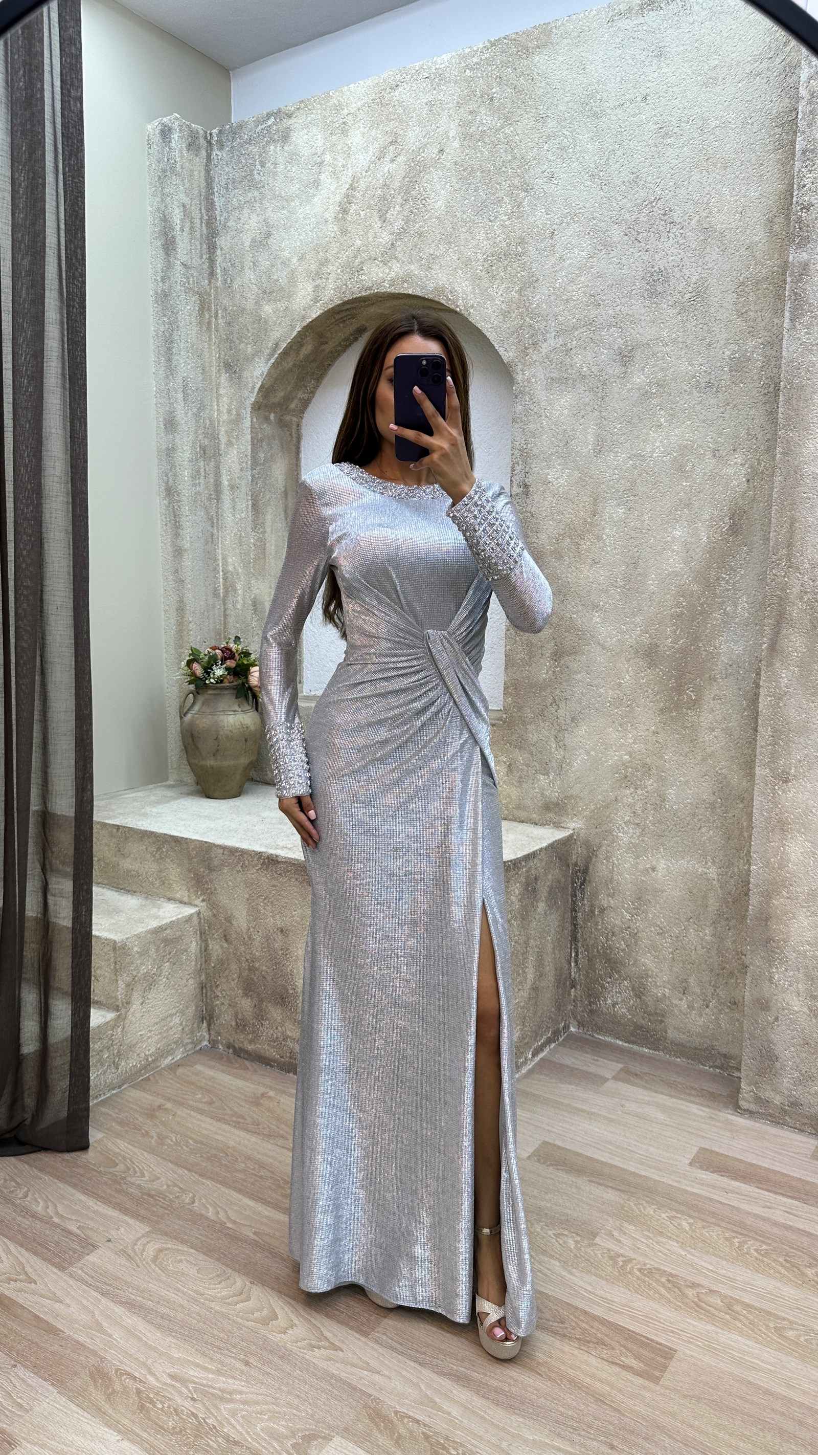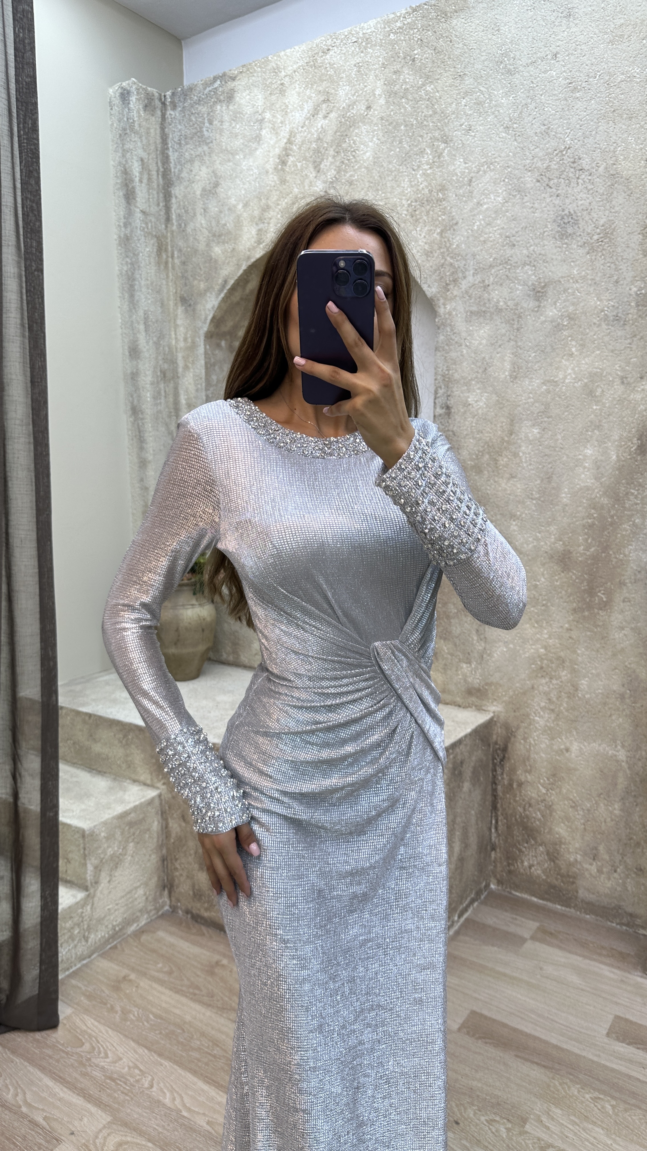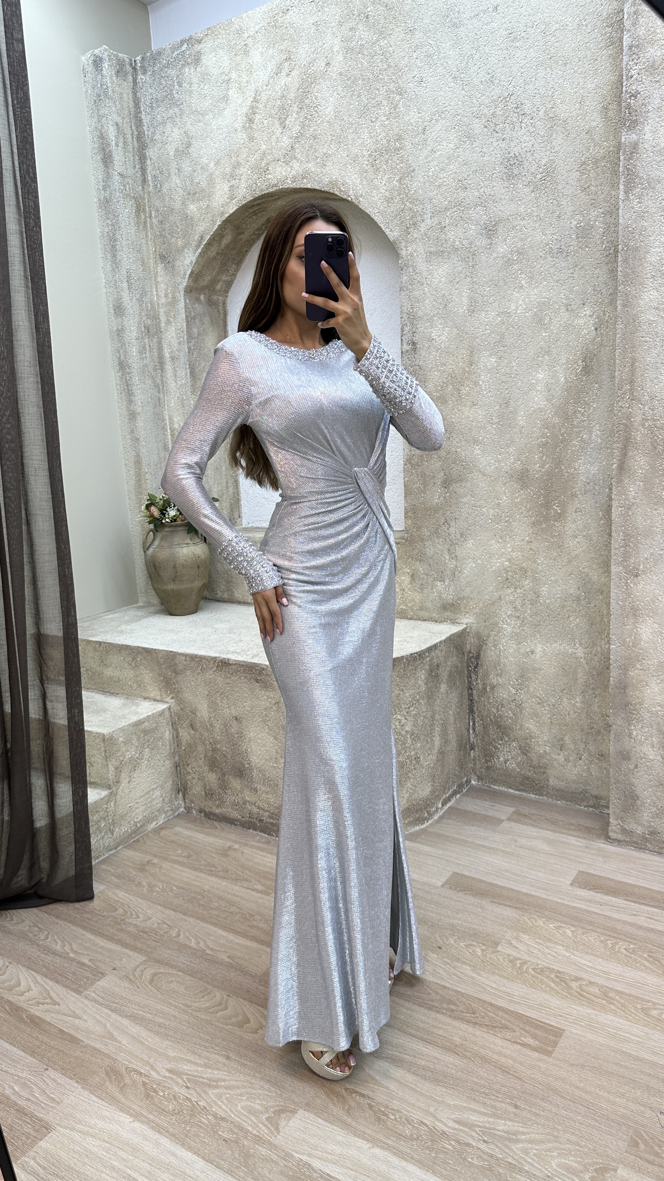 • Vizon Kol ve Yaka Taş Detay Abiye Elbise