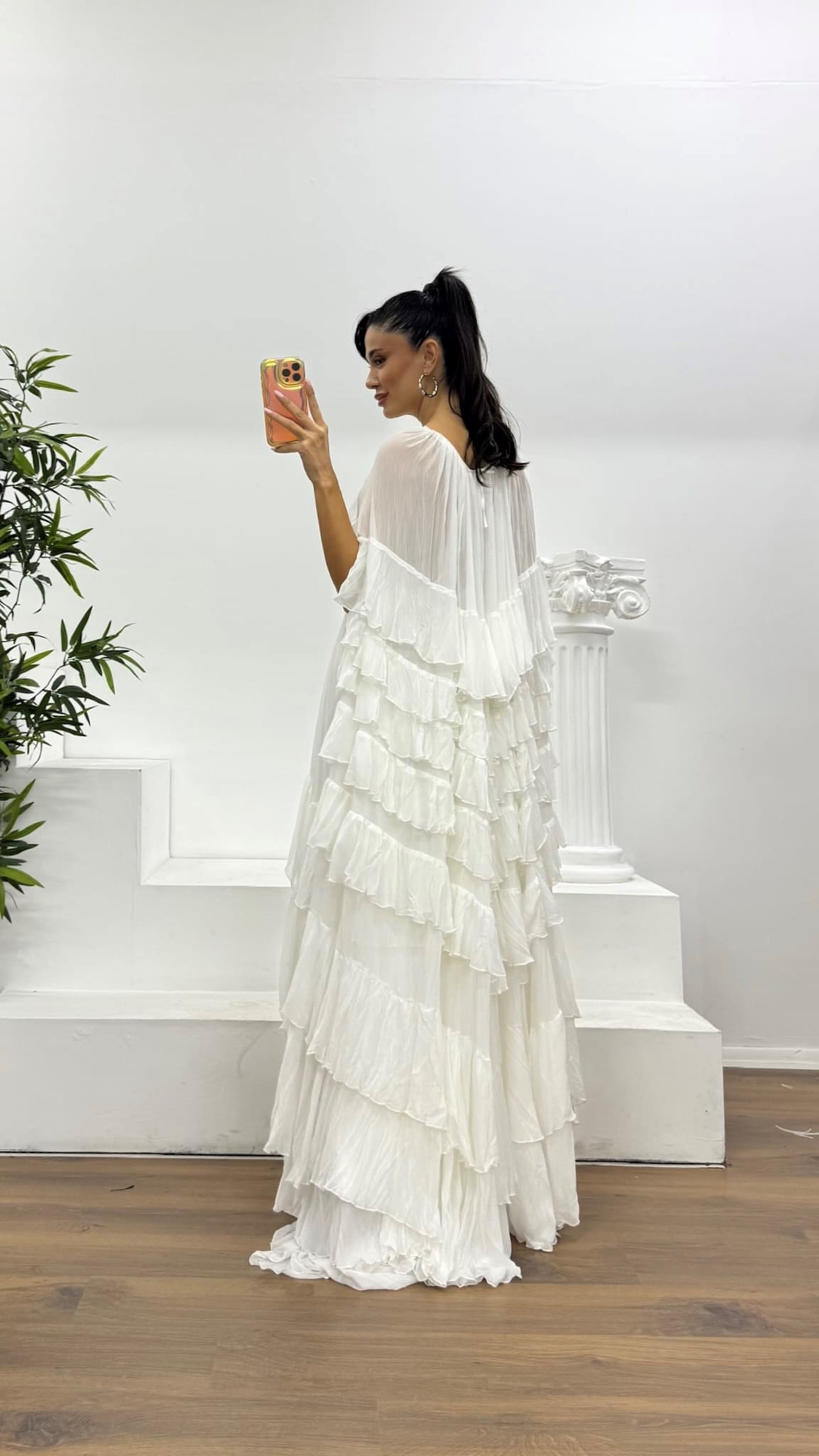 Beyaz Bohem Fırfır Detaylı Özel Tasarım Abiye Elbise