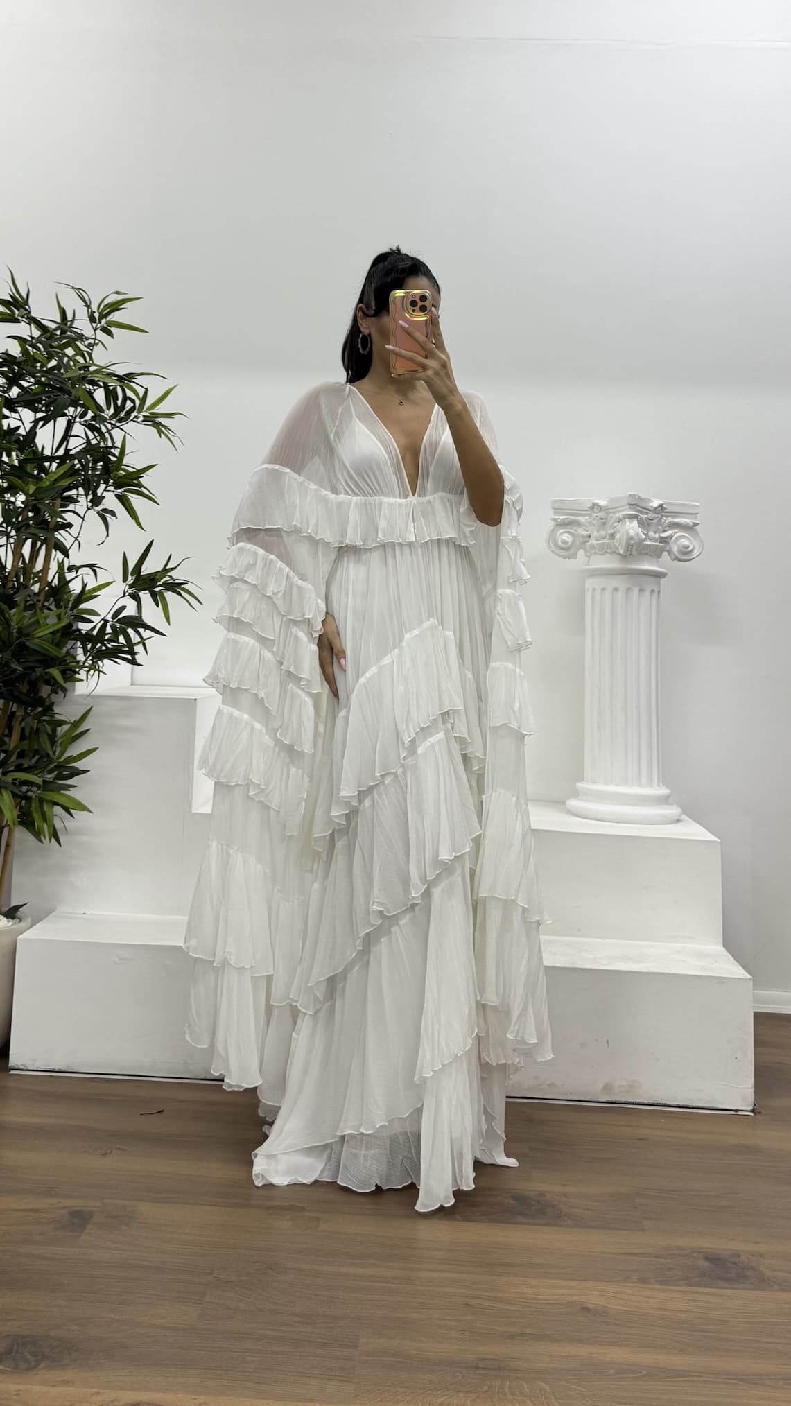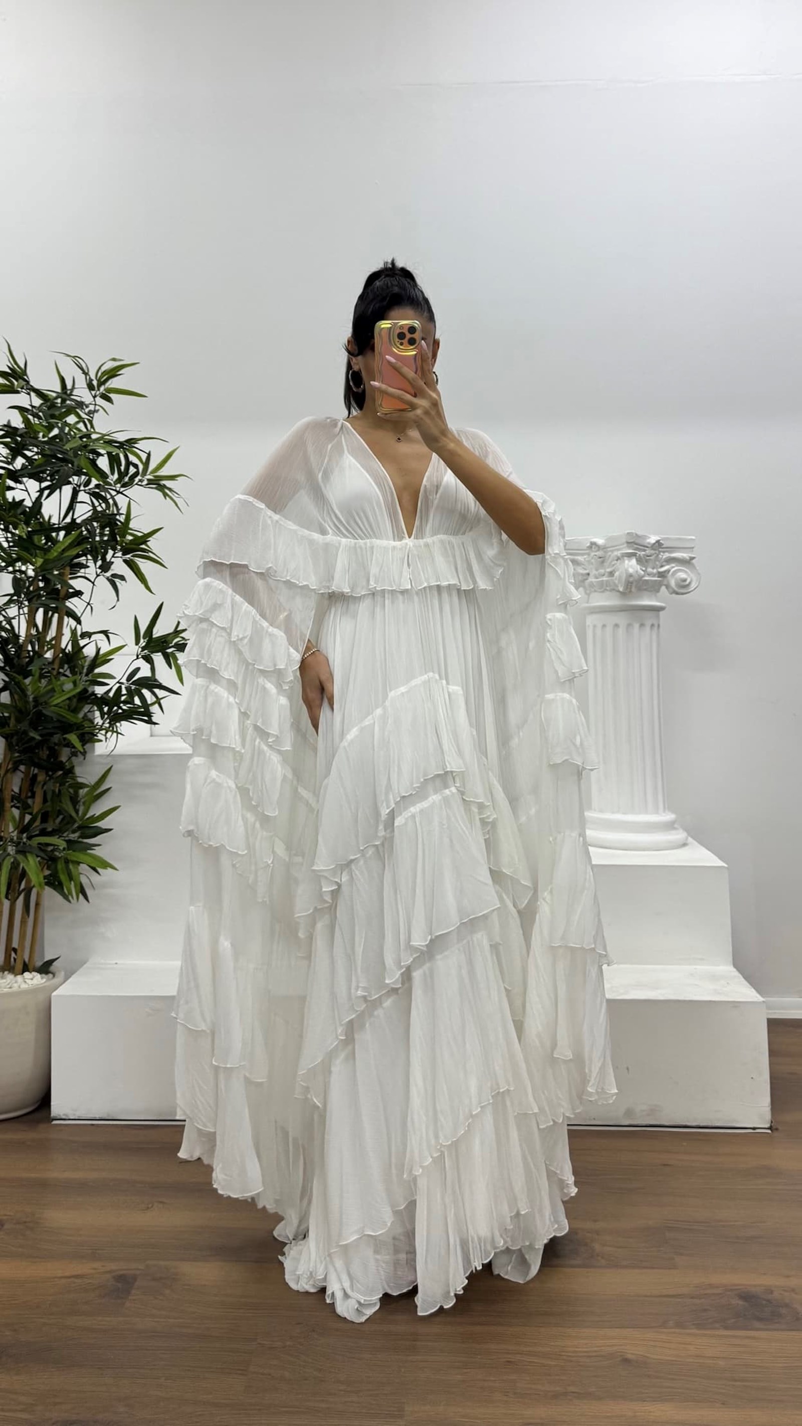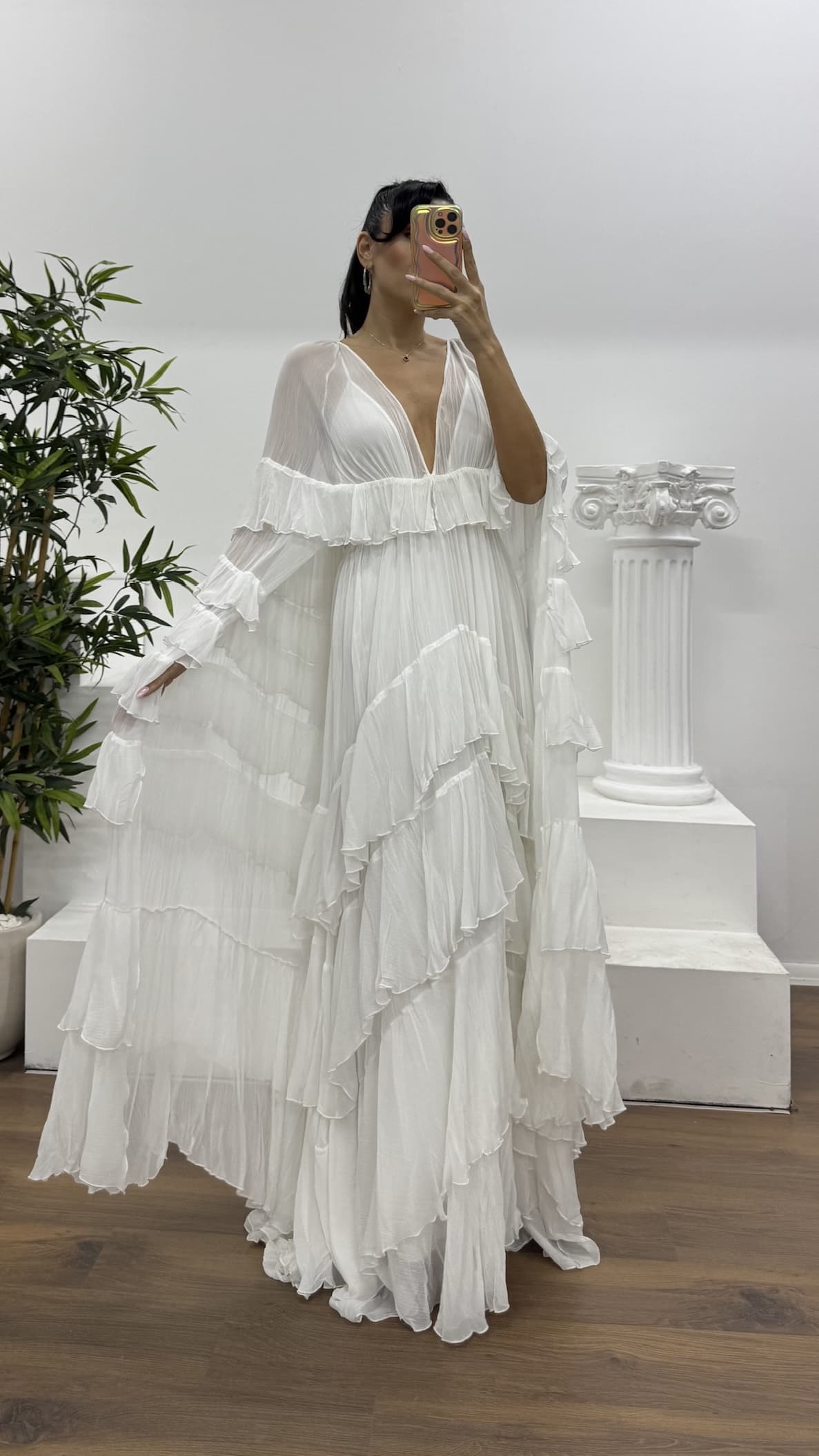 • Beyaz Bohem Fırfır Detaylı Özel Tasarım Abiye Elbise