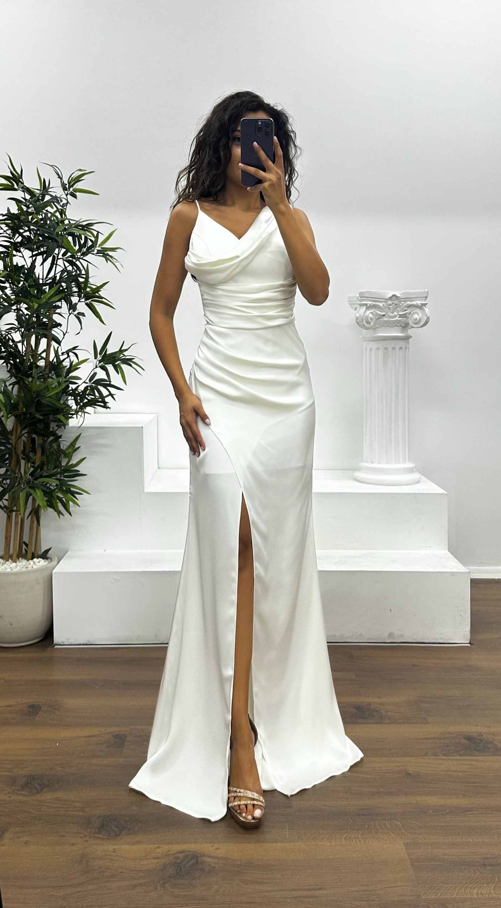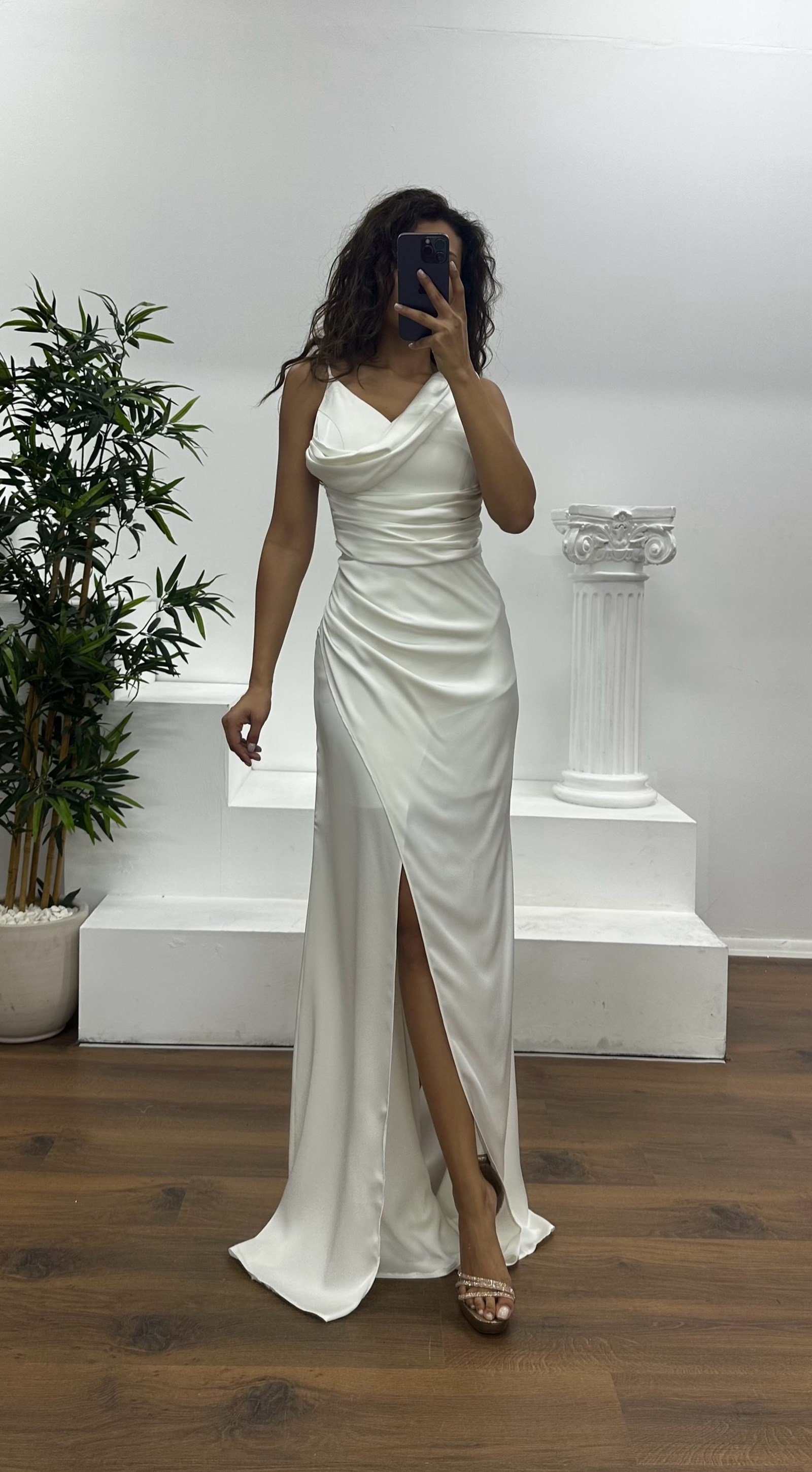 Beyaz Drapeli Saten Abiye Elbise