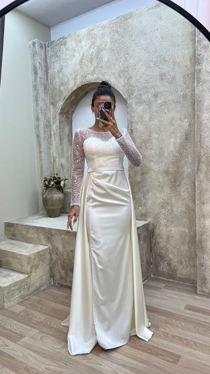 Beyaz Göğsü Pul Detay Saten Abiye Elbise