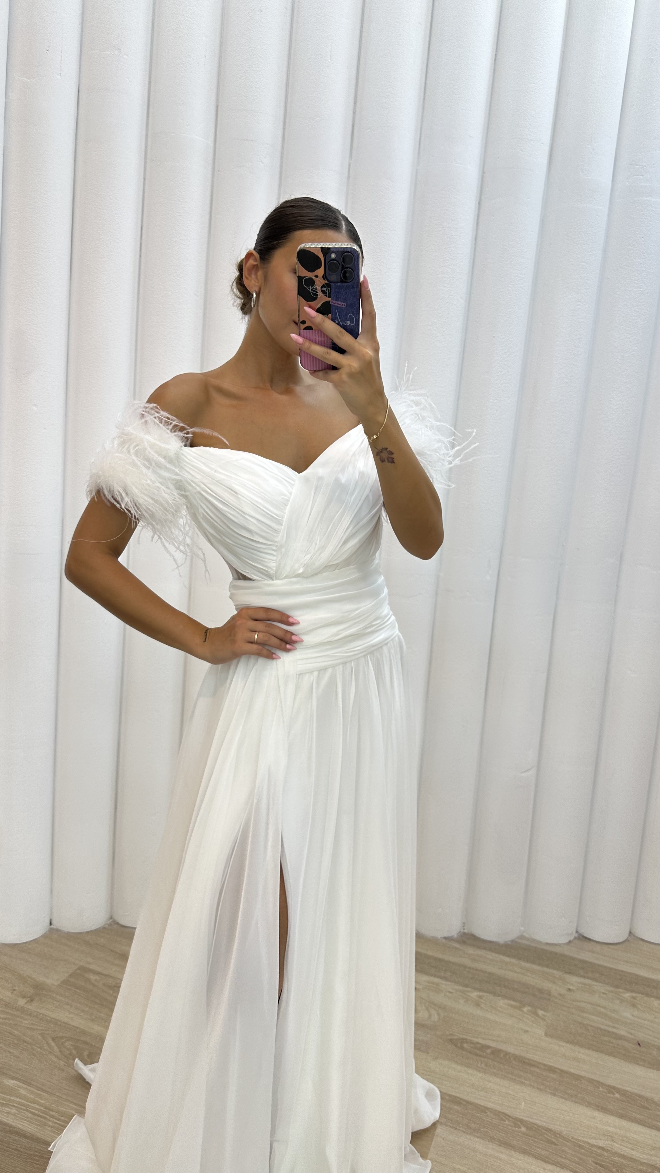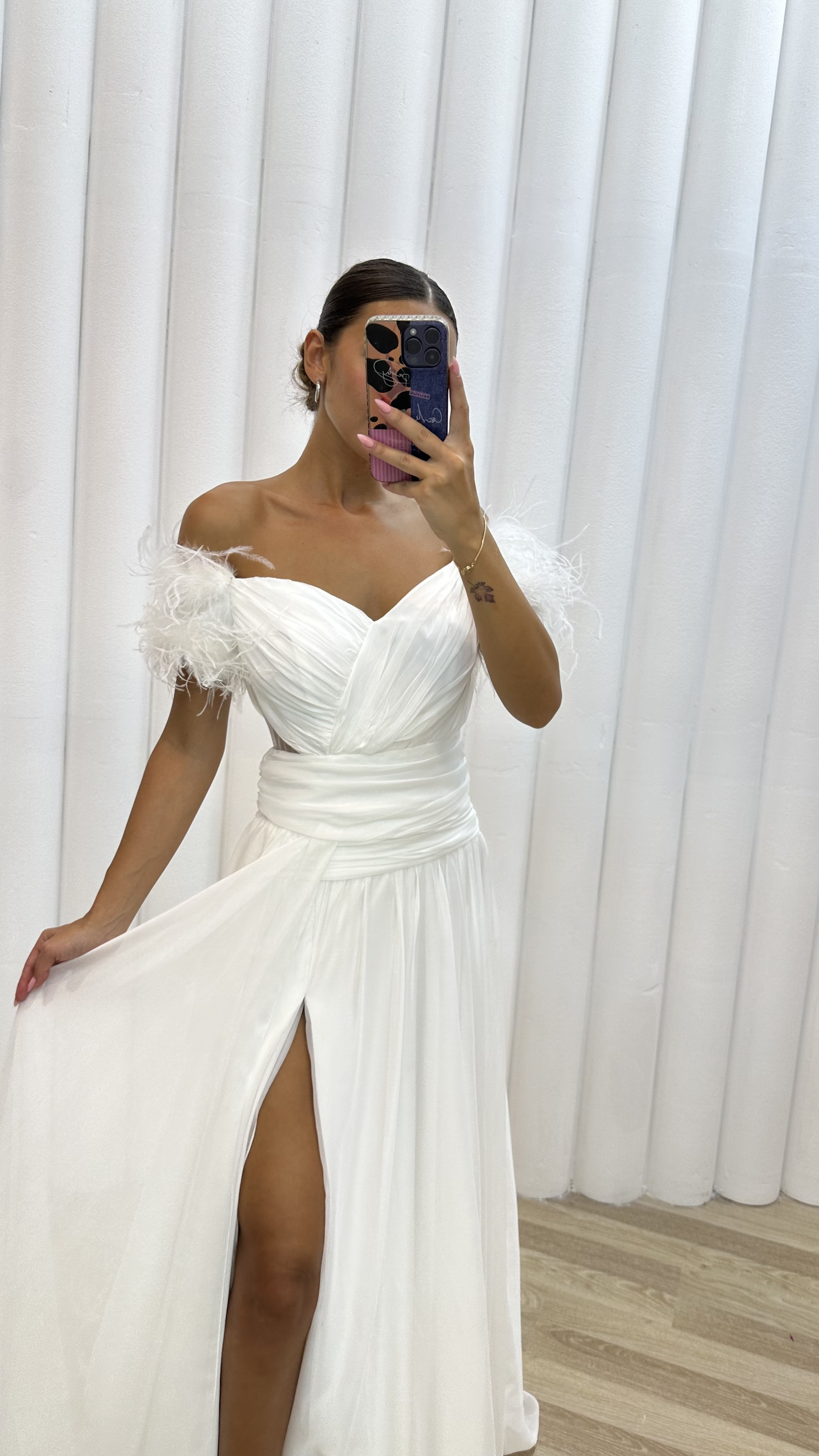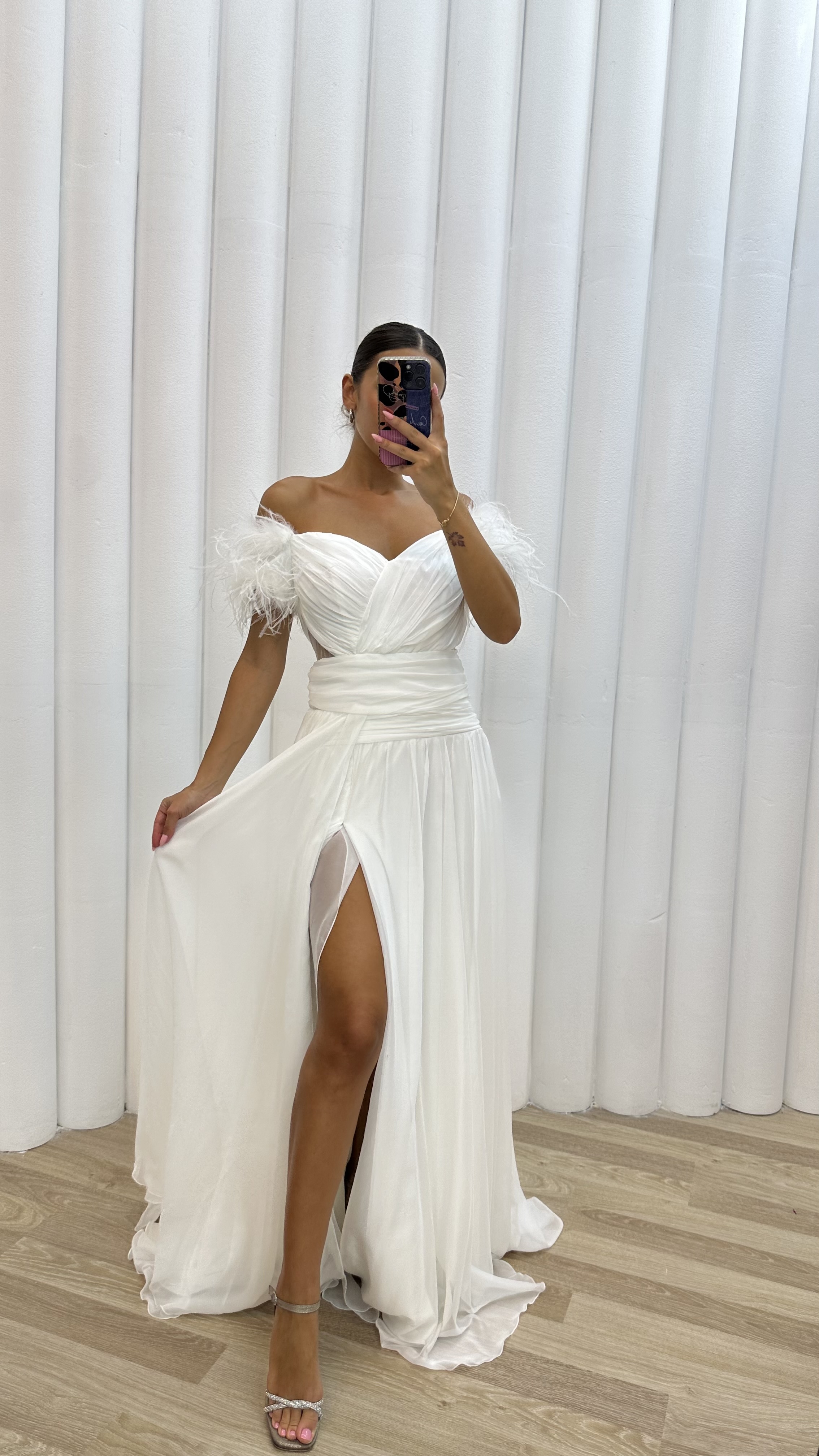 • Beyaz İp Askılı Omuzları Tüylü Tül Abiye Elbise