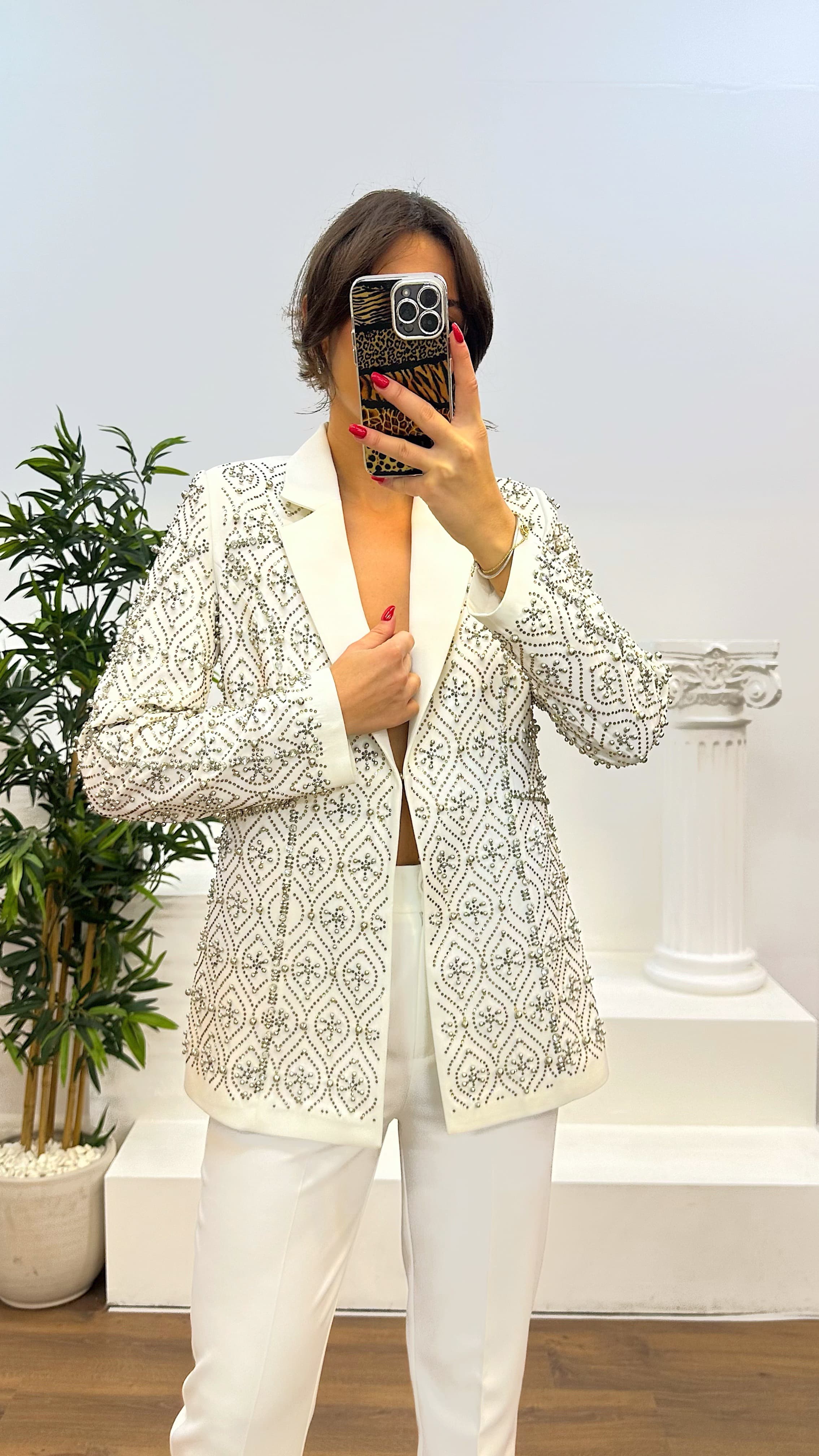 Ürün 36-44 bedene kadar uyumlu, astarlı, kancalı ceket, fermuarlı, vatkalı, işlemeli takım olarak tasarlanmıştır.