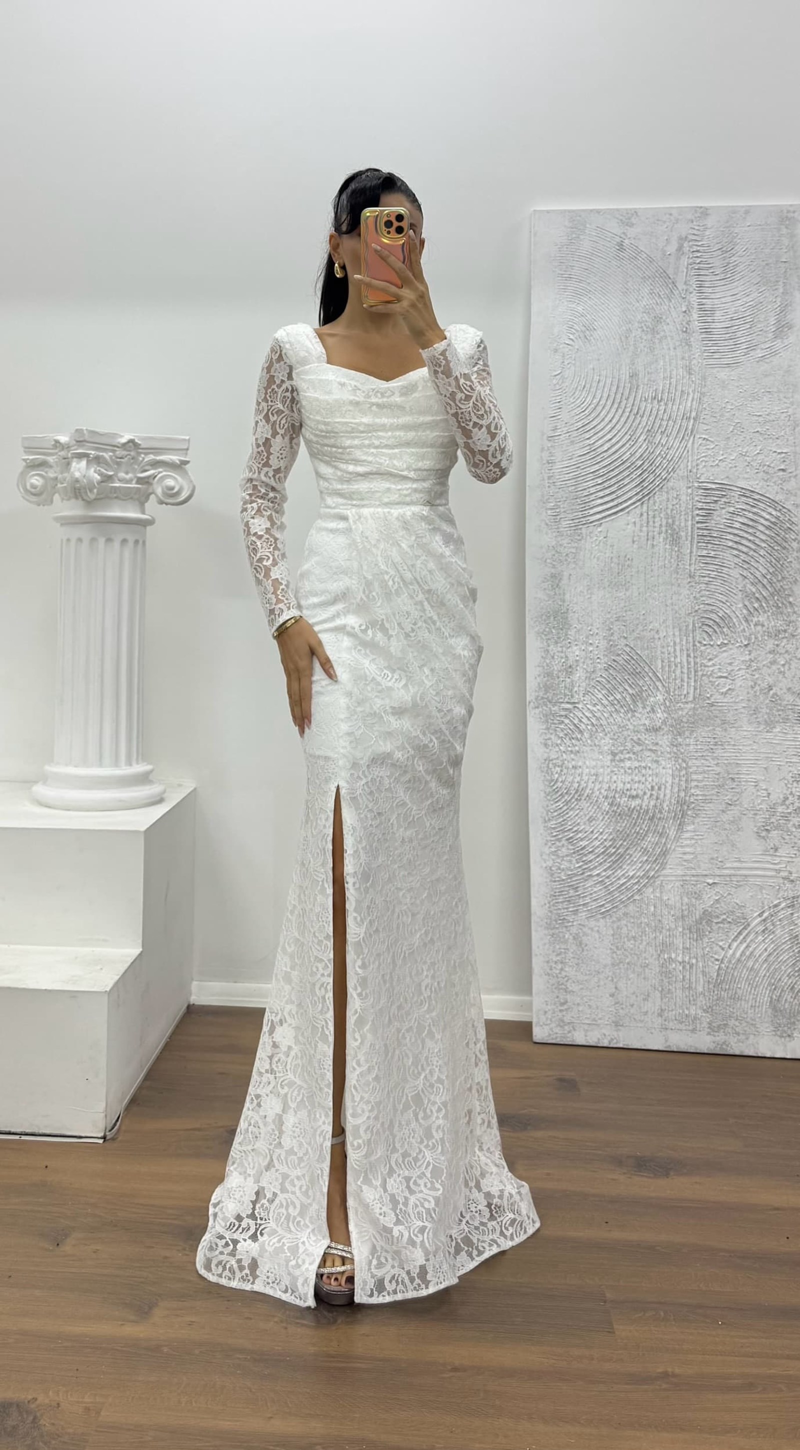 Beyaz Kare Yaka Dantel Abiye Elbise