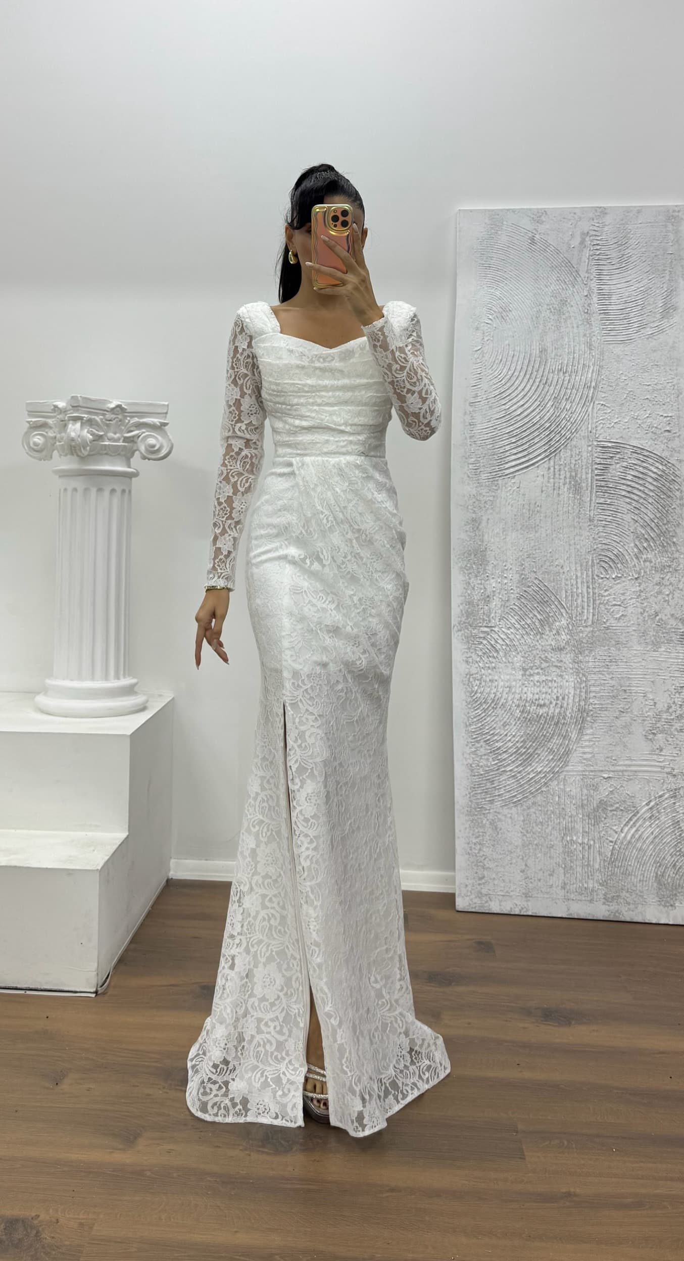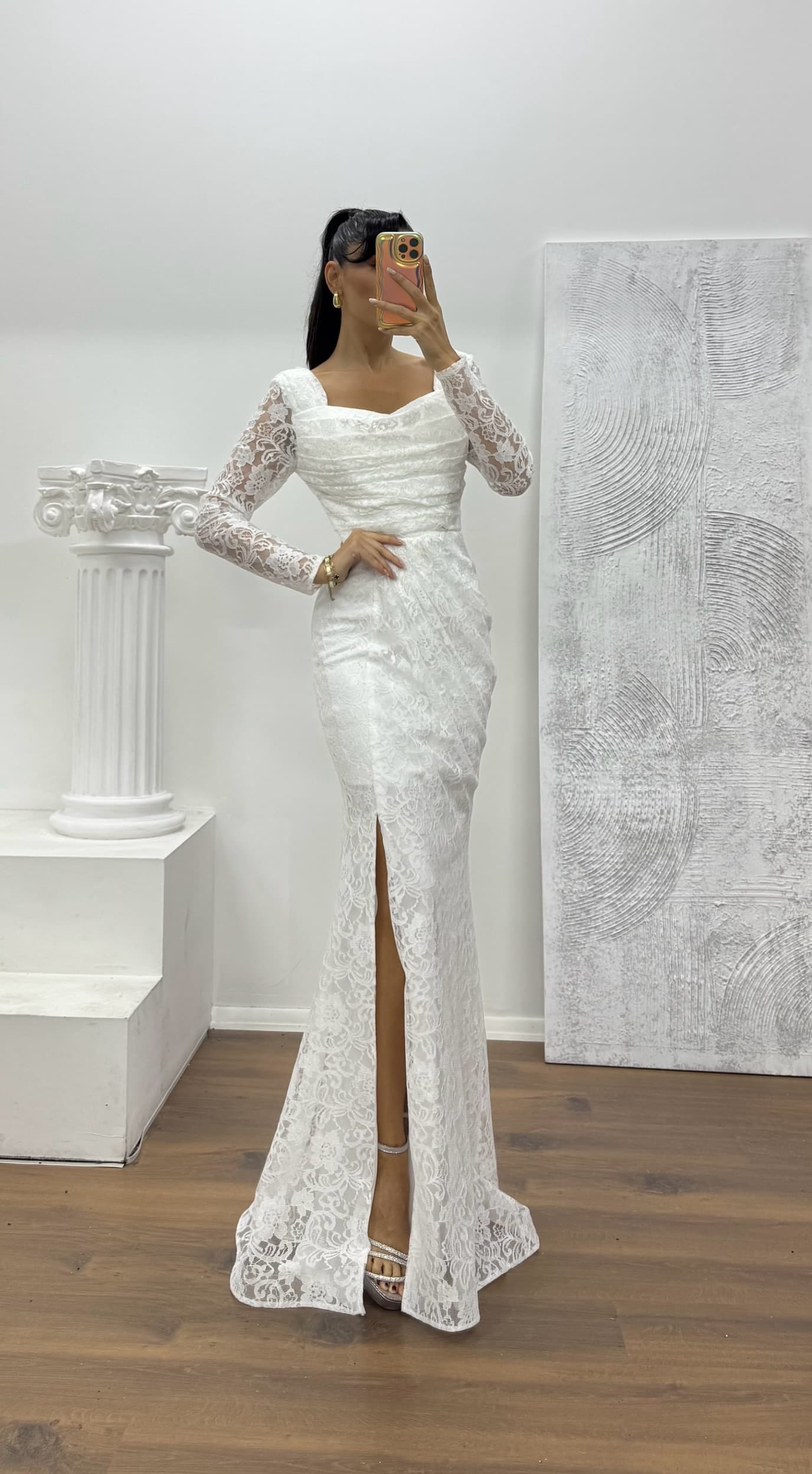 • Beyaz Kare Yaka Dantel Abiye Elbise