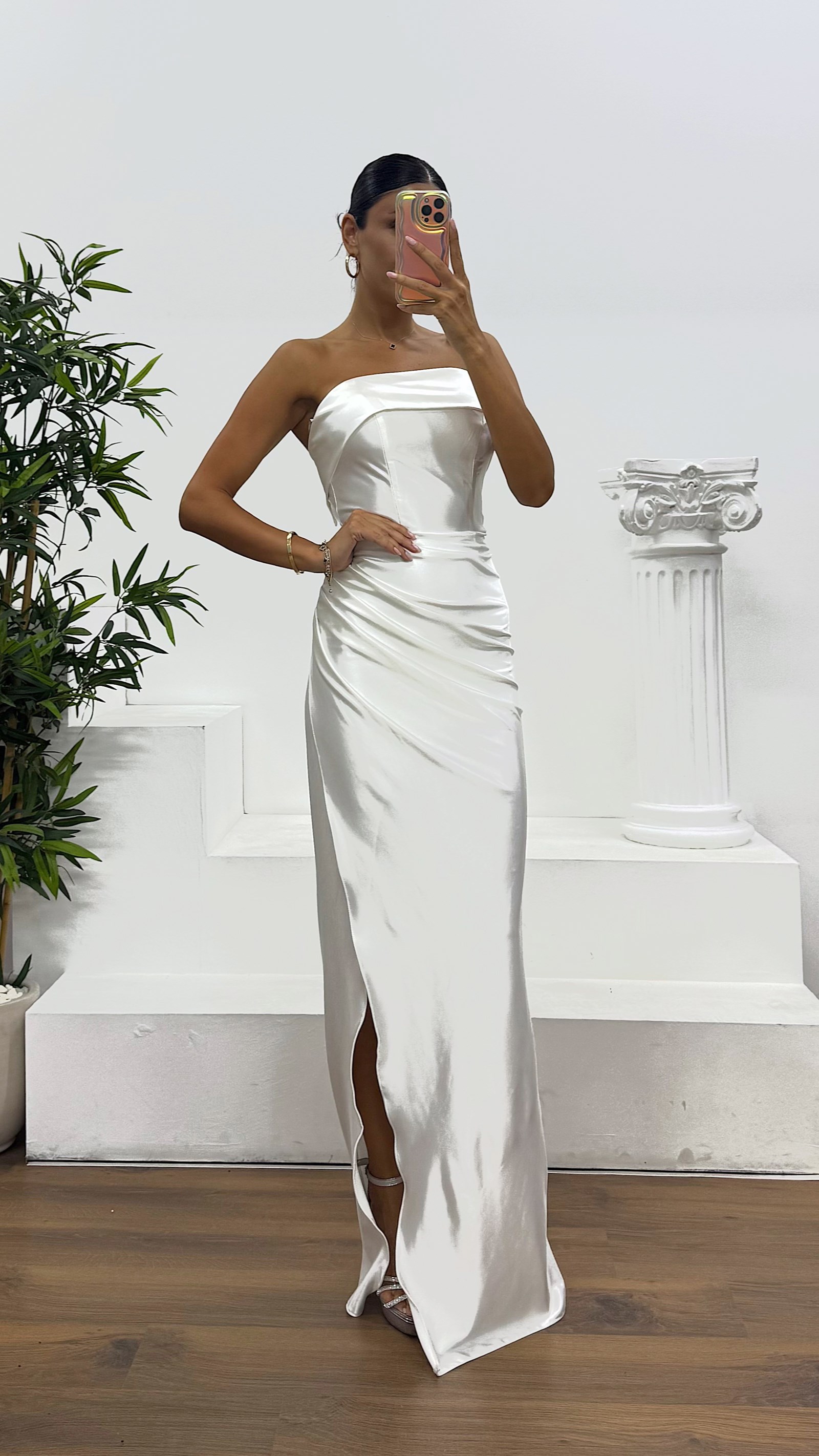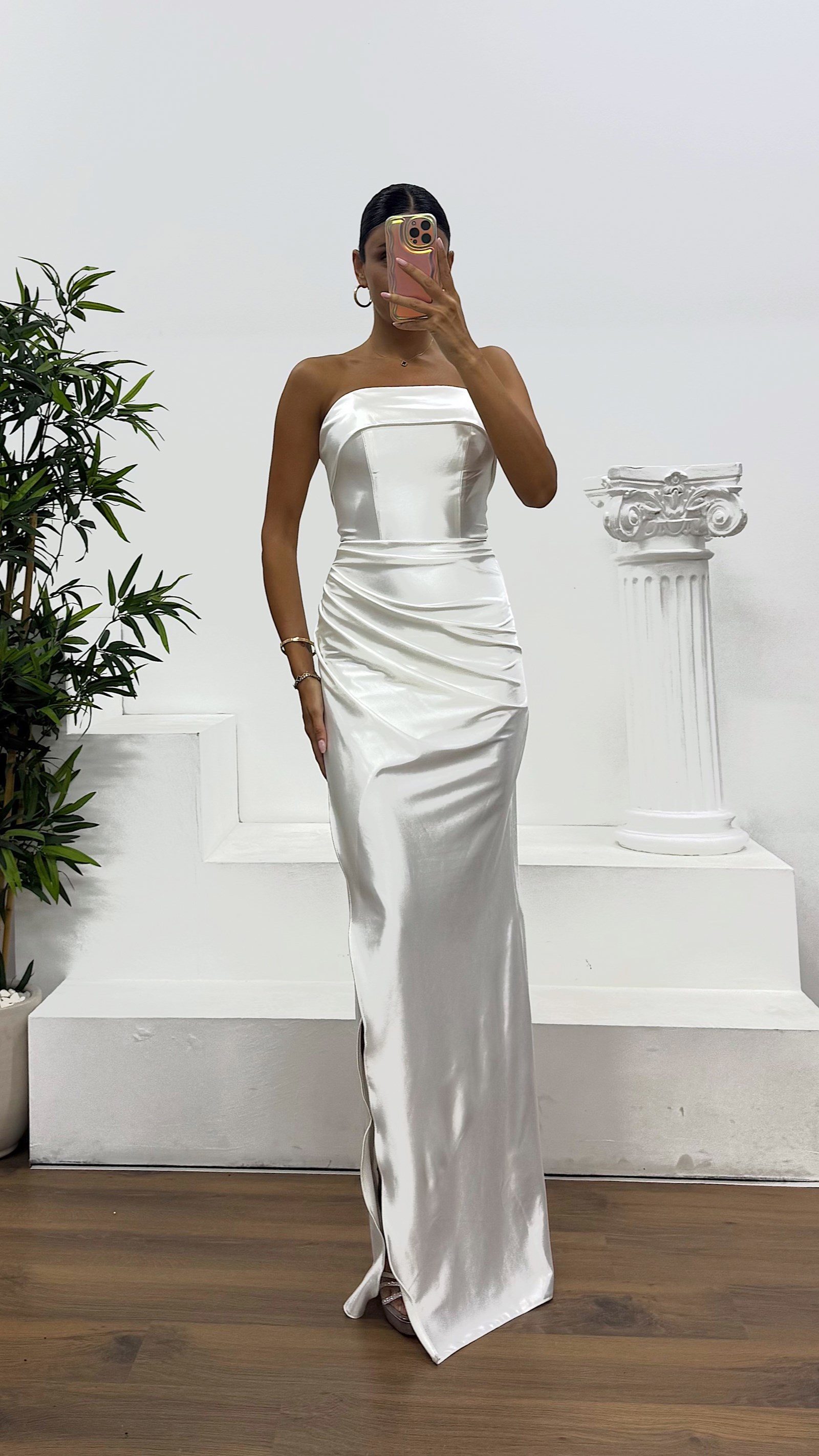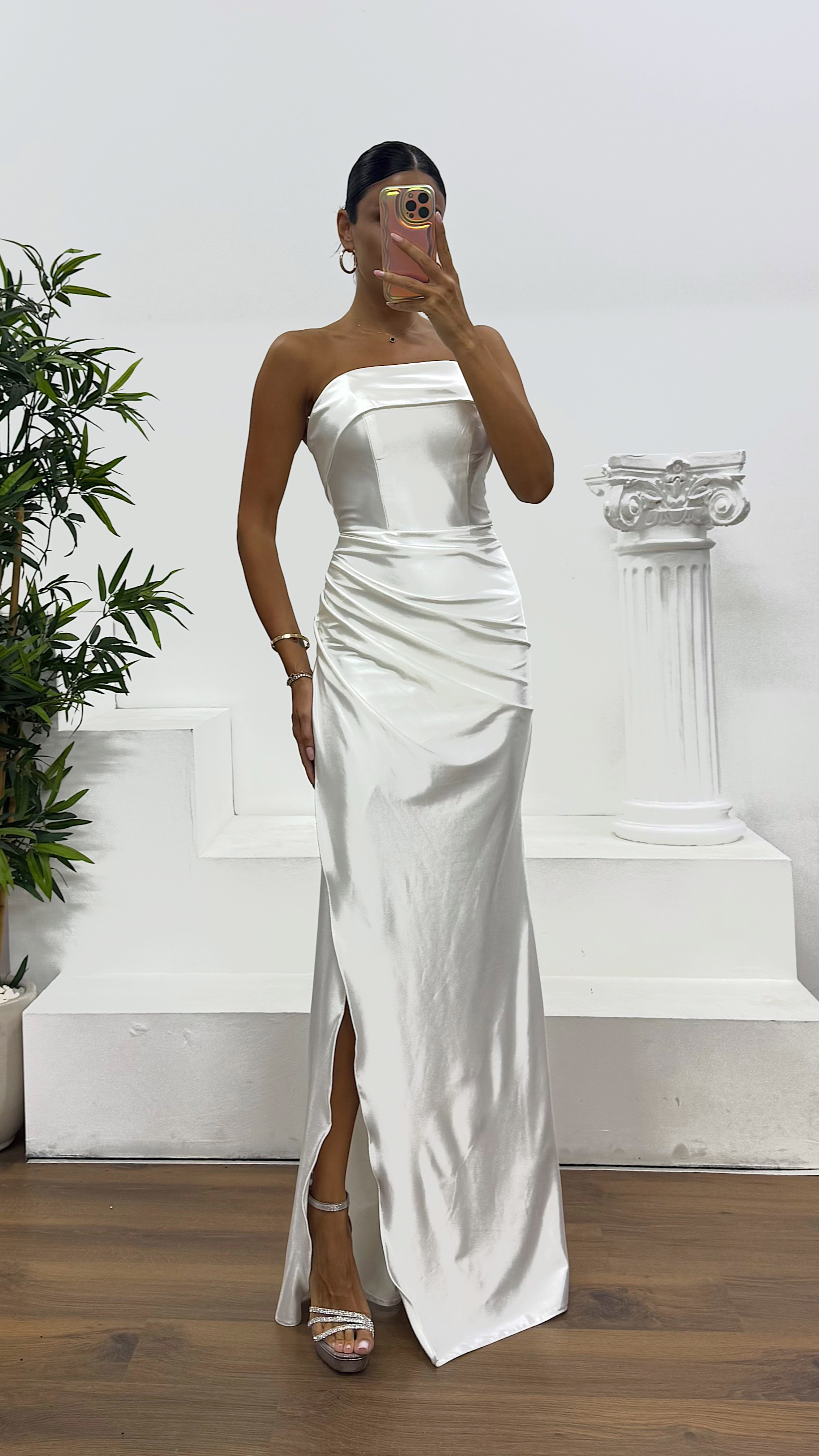 Ürün 36-42 bedene kadar uyumlu, göğüs pedli, astarlı, sırt capraz ip ve fermuar kapamalı, yırtmaçlı abiye olarak tasarlanmıştır.