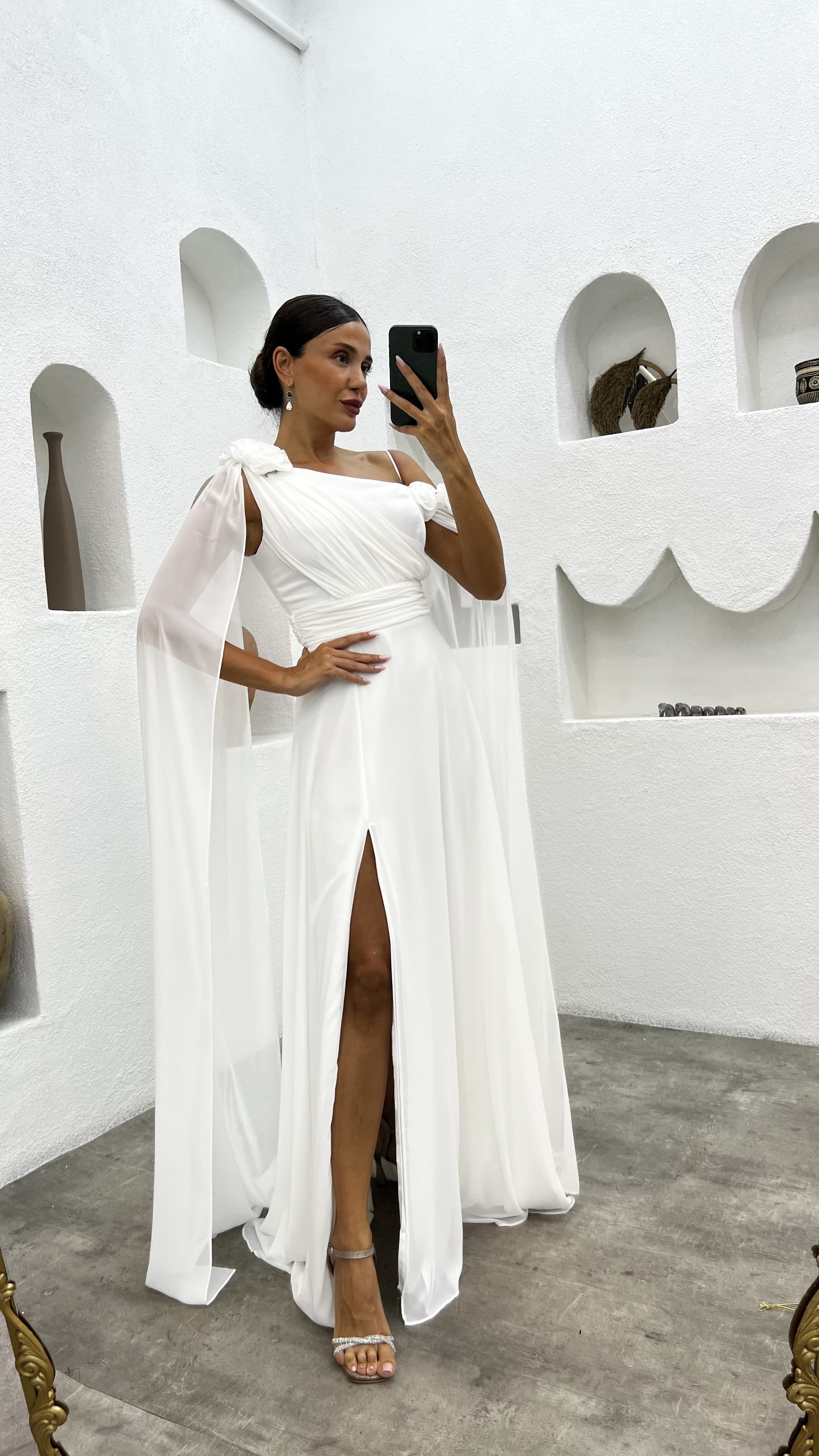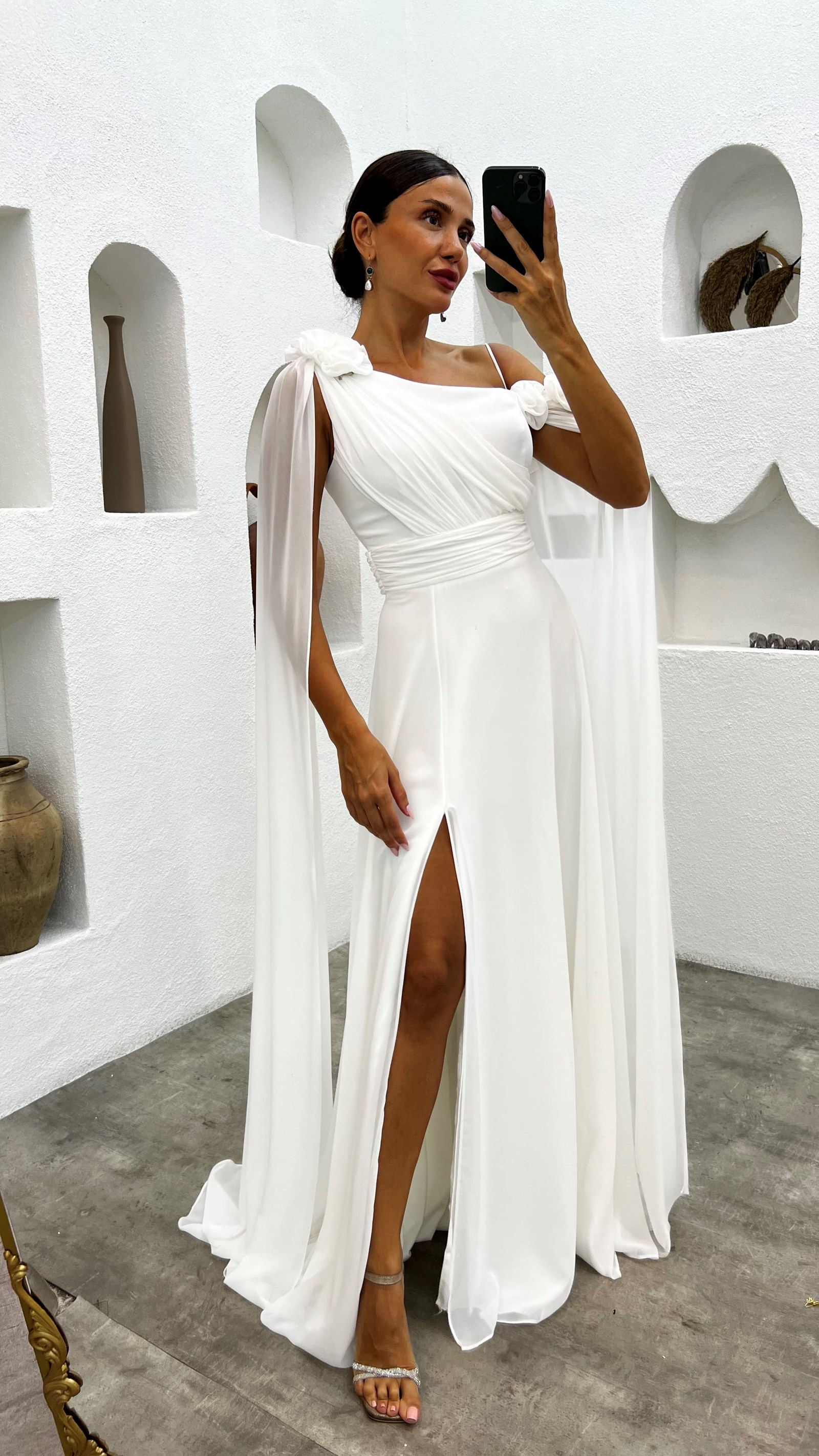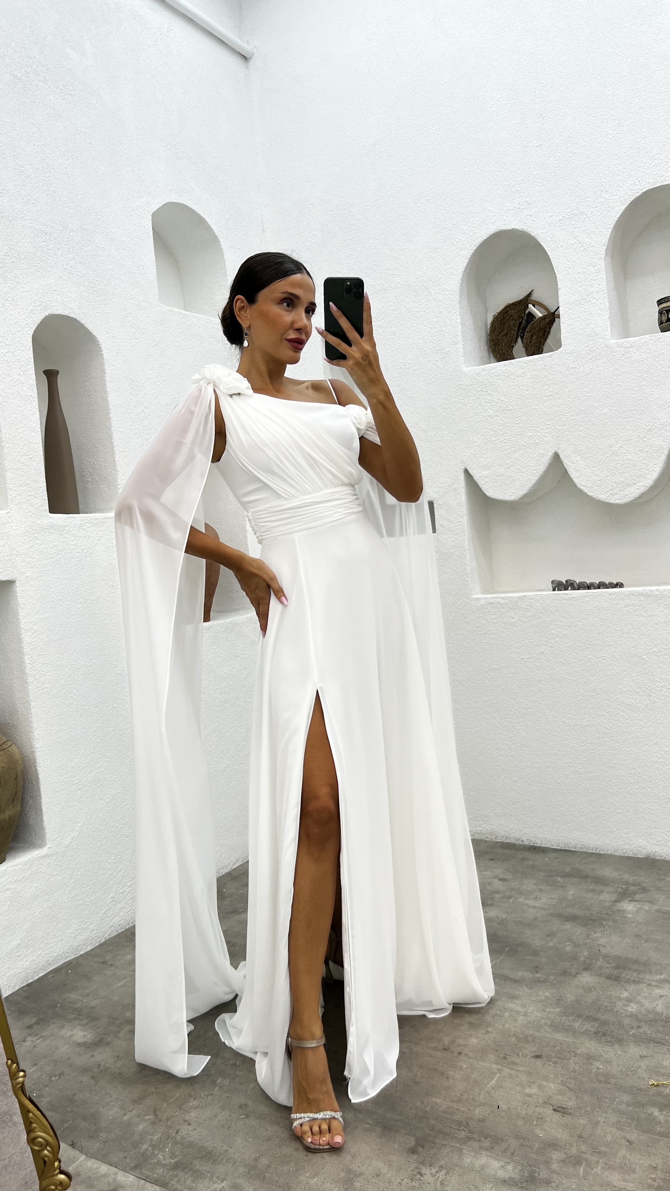 Beyaz Tek Omuz Gül Detay Abiye Elbise