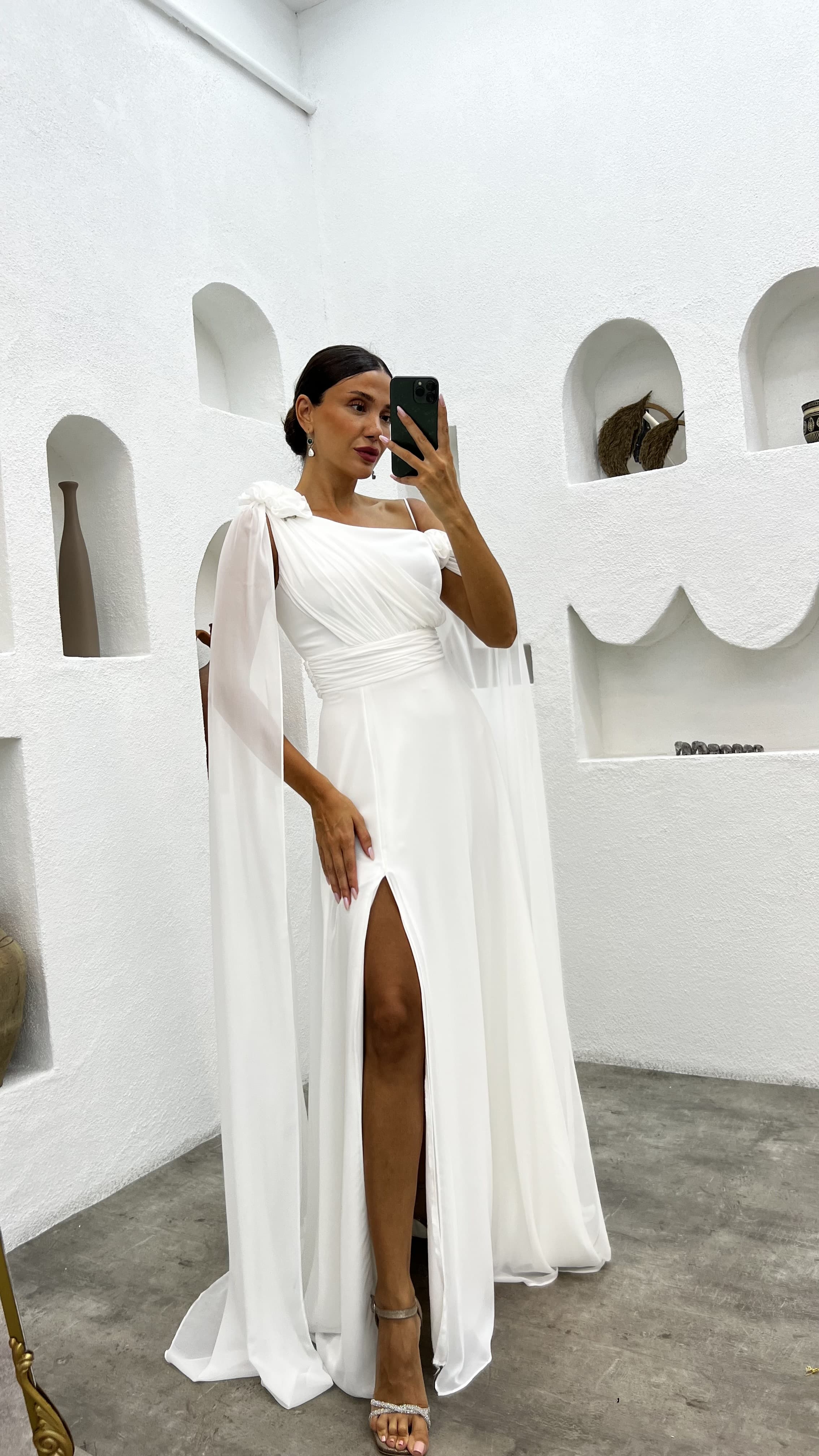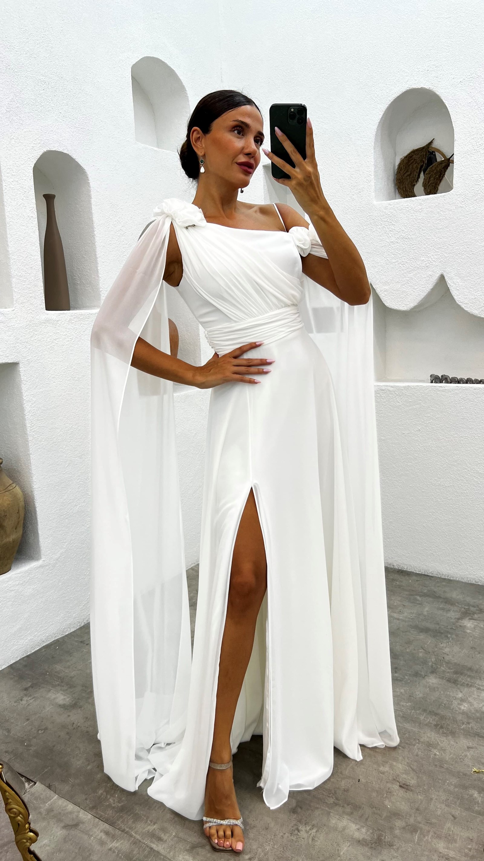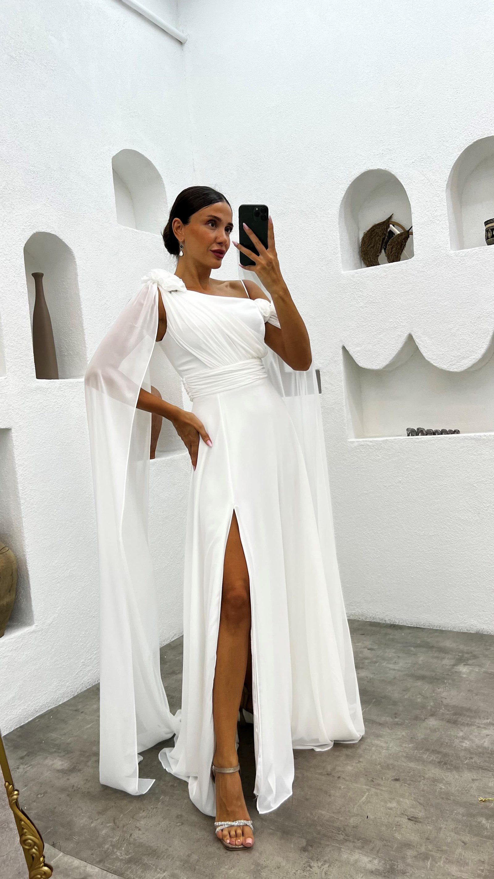 Beyaz Tek Omuz Gül Detay Abiye Elbise