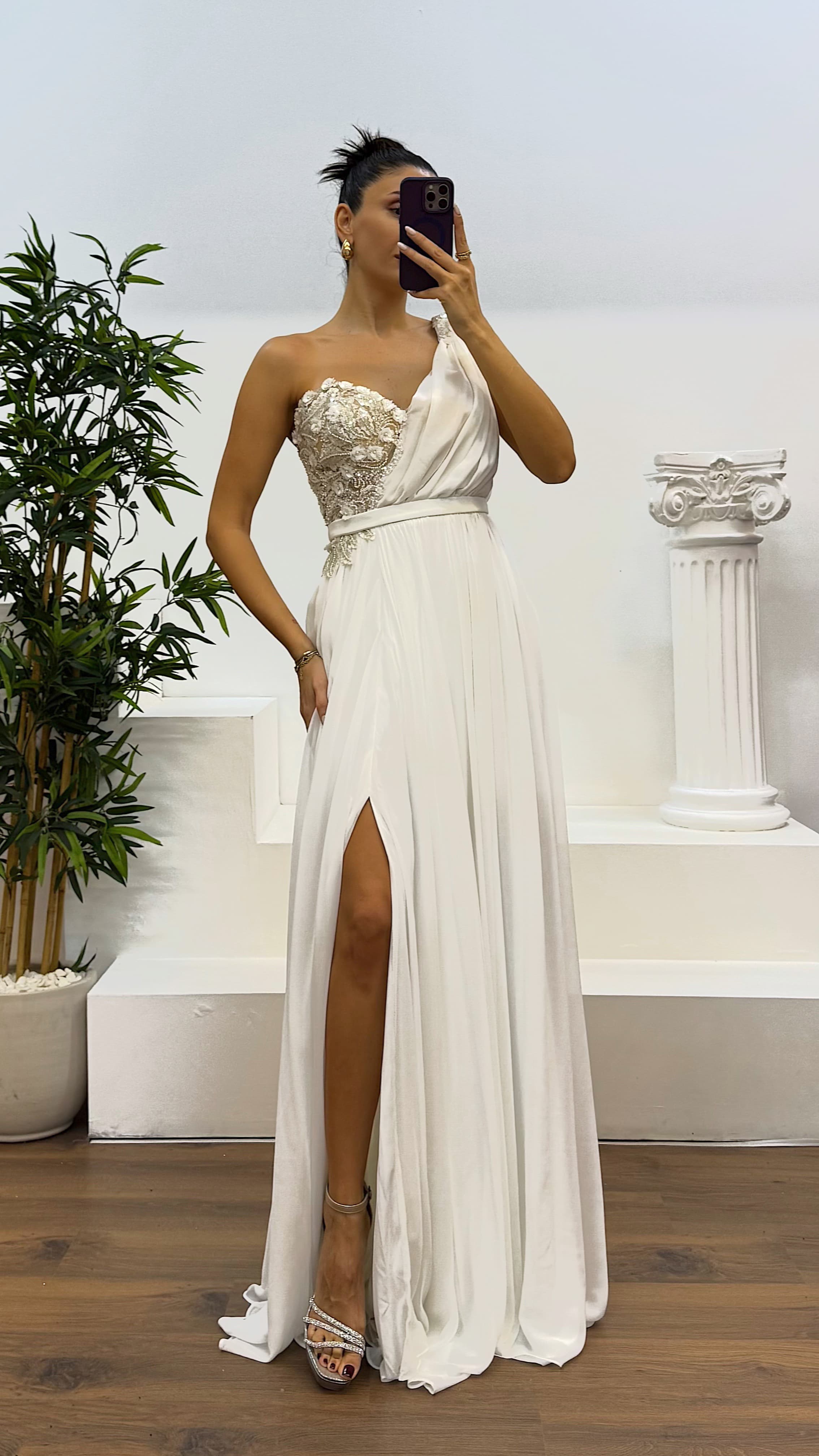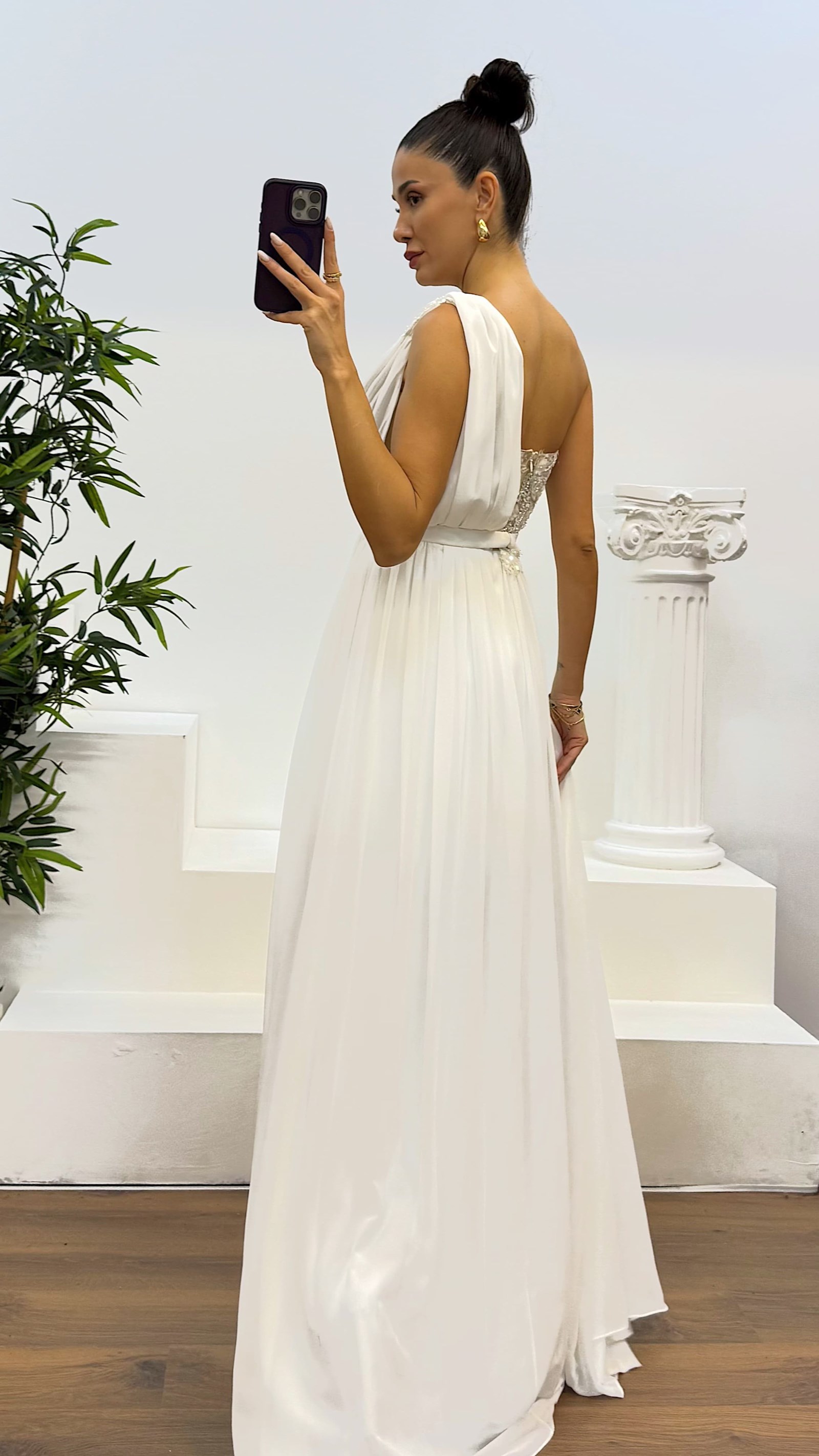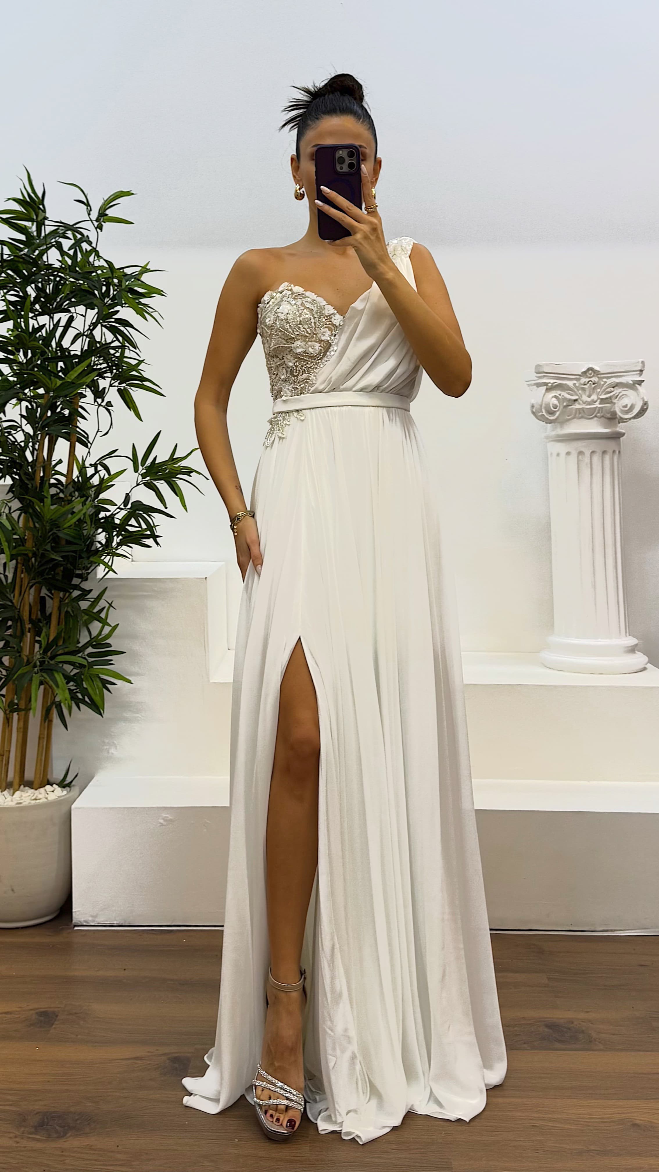 Ürün 36-44 bedene kadar uyumlu, göğüs pedli, astarlı, arka kapama fermuar, göğüs detay, tek omuz abiye olarak tasarlanmıştır.