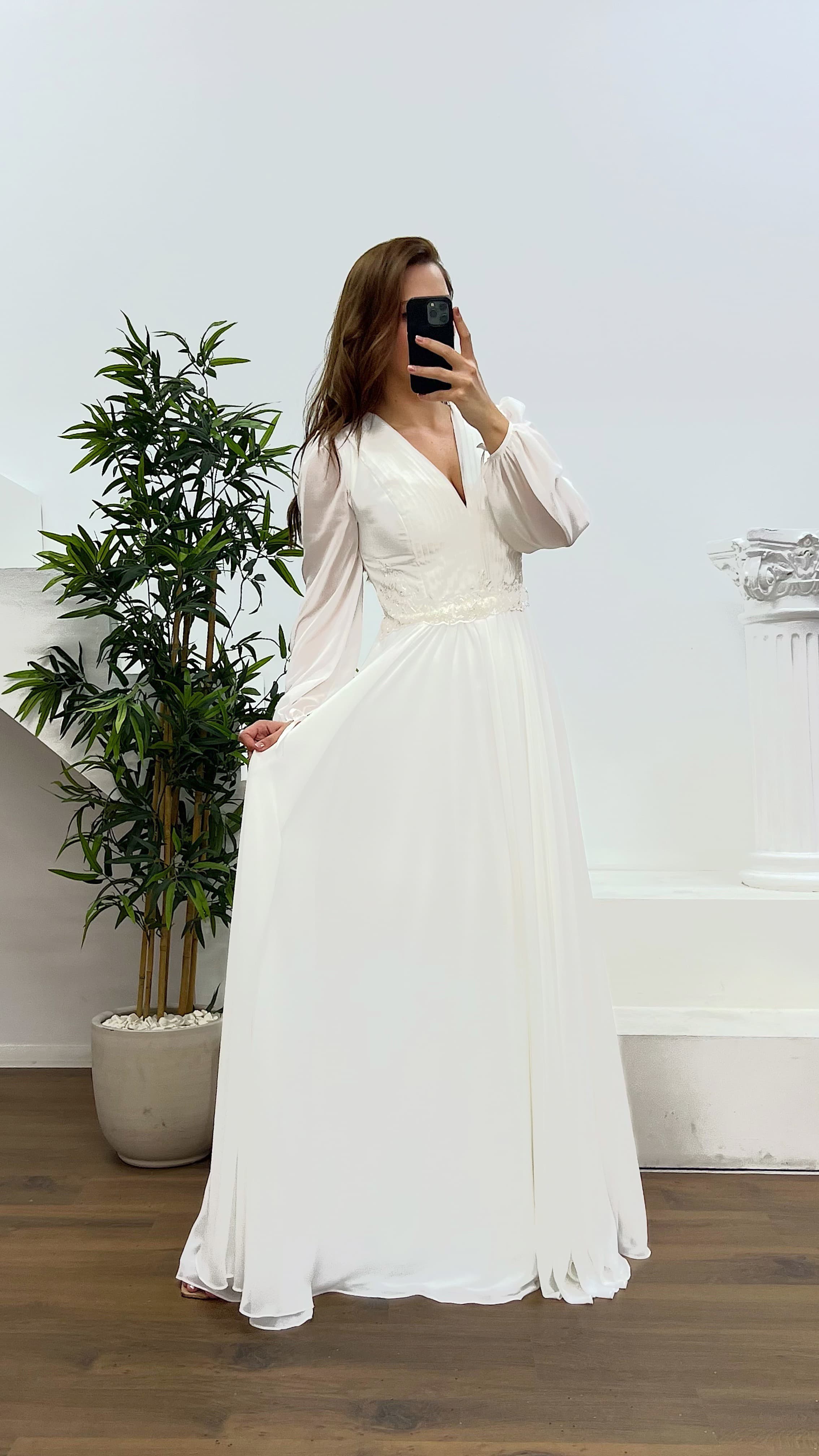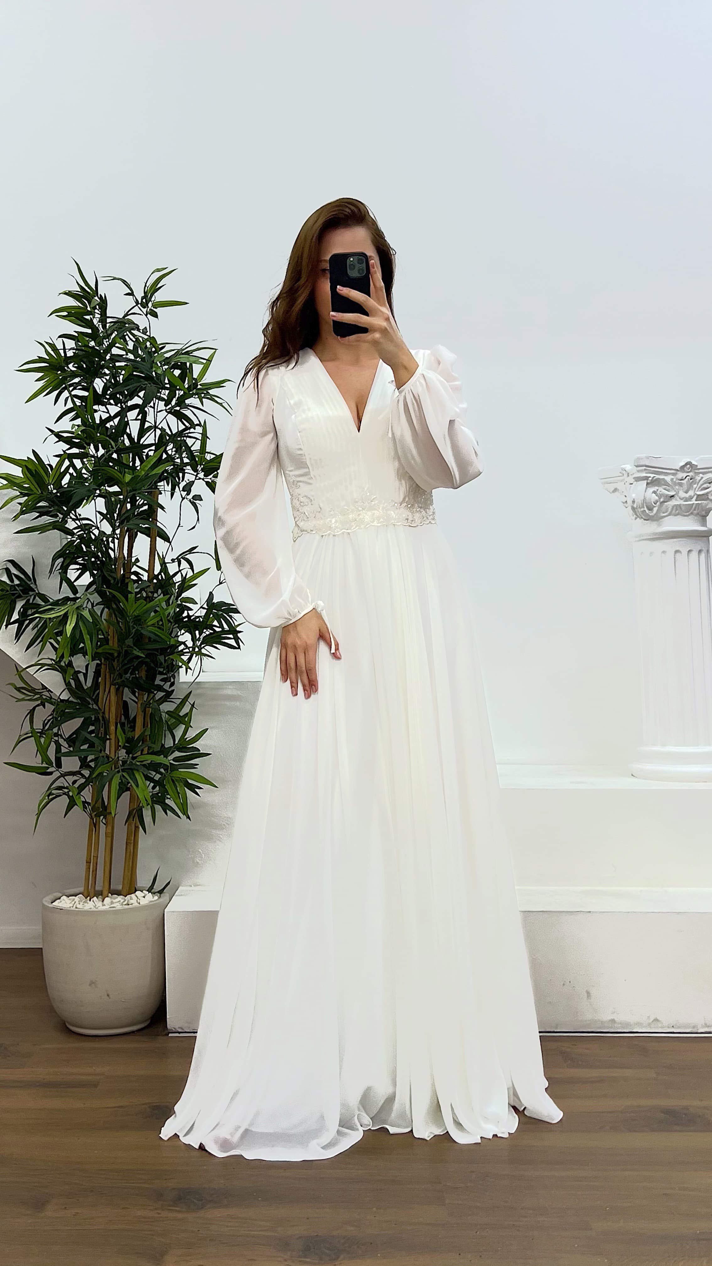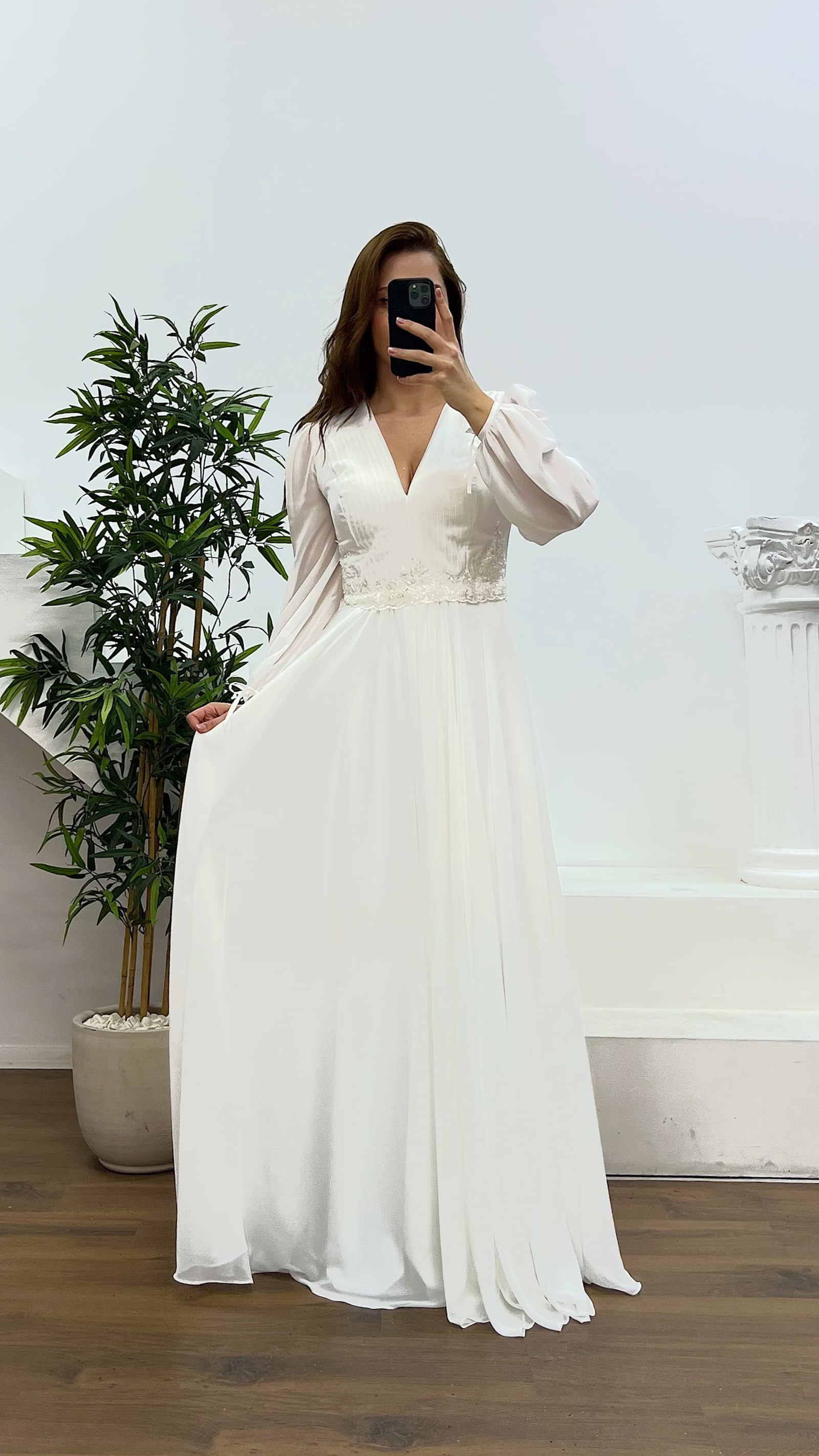 Ürün 44-48 bedene kadar uyumlu, göğüs pedli, astarlı, arka kapama fermuar, bel işlemeli abiye olarak tasarlanmıştır.