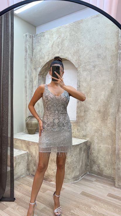 • Antrasit V Yaka Göğüs Detay Saçaklı Özel İşlemeli Tasarım Elbise