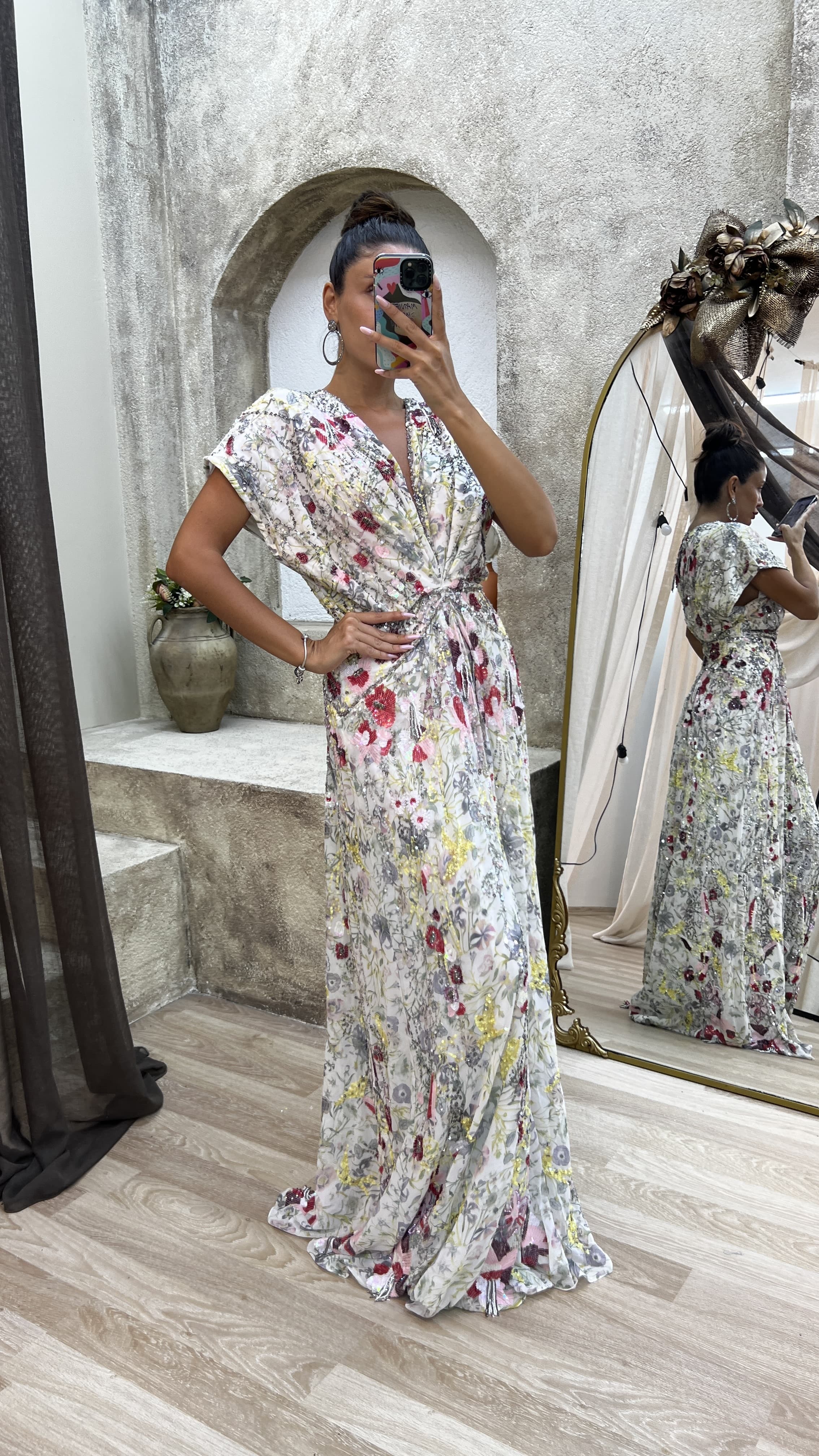 Beyaz V Yaka Sırt Detay Özel İşleme Desenli Elbise